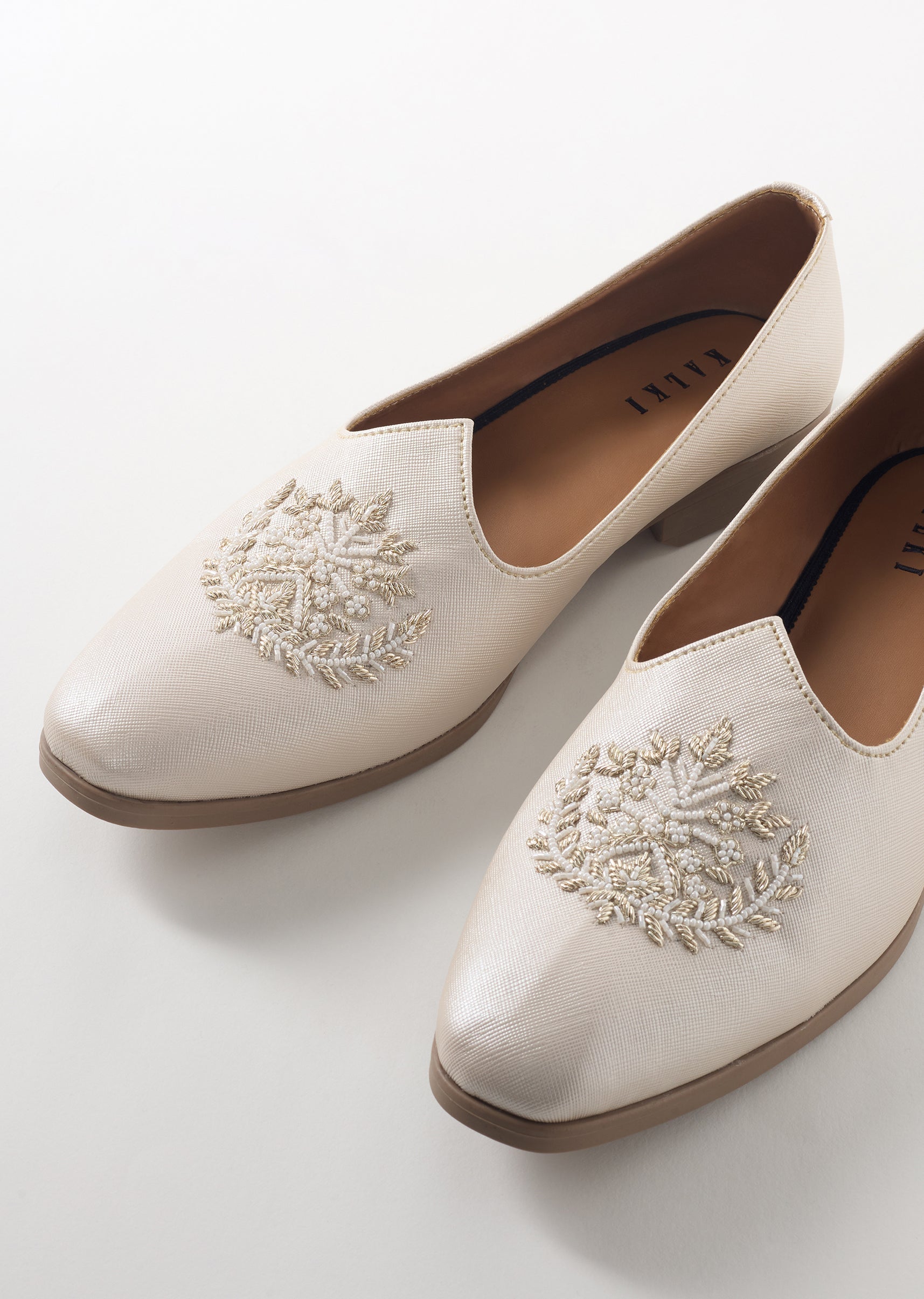 These white ethnic juttis feature intricate hand embroidery and a textured finish that creates a classy and ethnic look. The faux leather base with embroidery detailing adds elegance while ensuring... More Product Details