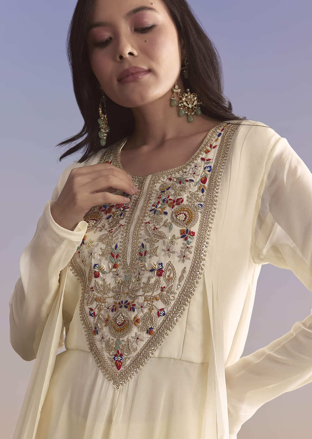 White Georgette Palazzo Suit With Resham and Sequins Embroidery