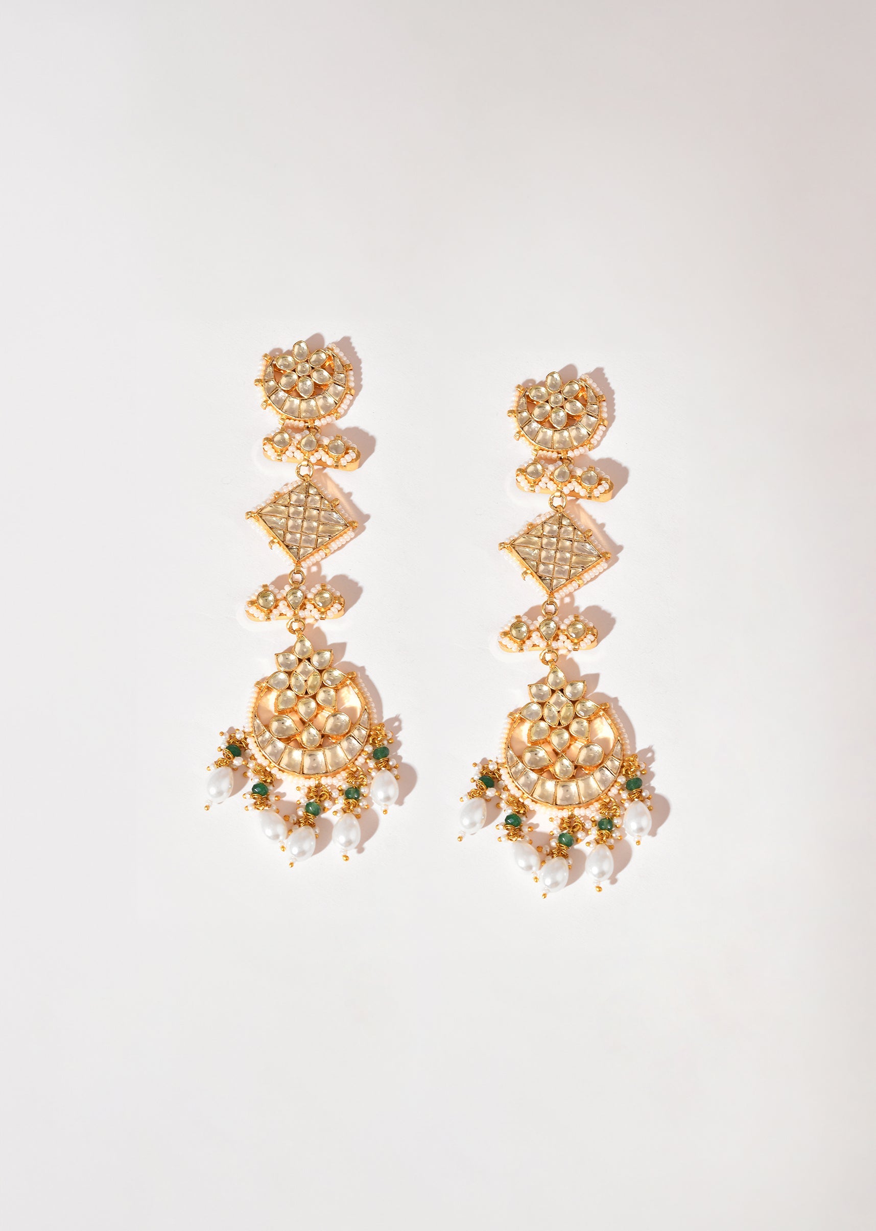 These white gold earrings feature intricate pachi kundan work for a delicate and festive appeal. Perfect for haldi and mehendi ceremonies, they are ideal for bridesmaids or guests attending a... More Product Details