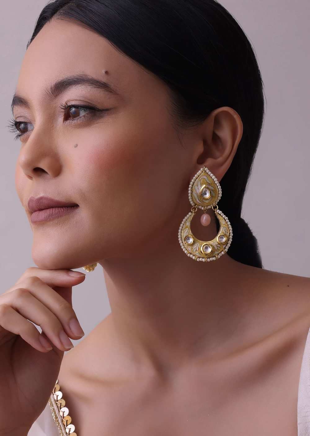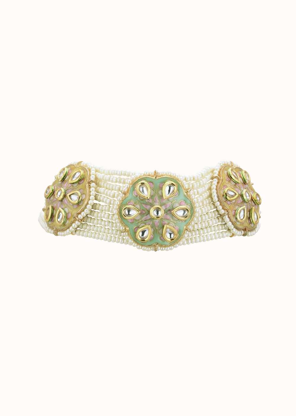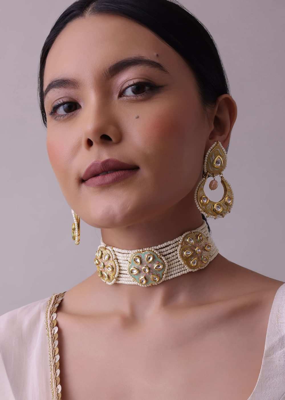 Pair this set with a simple saree or lehenga in a complementary color to make the green tone and intricate detailing pop.
