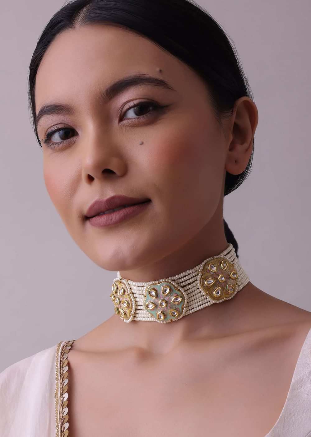 White Gold-Finish Bead Choker Set With Pearls In Mix Metal