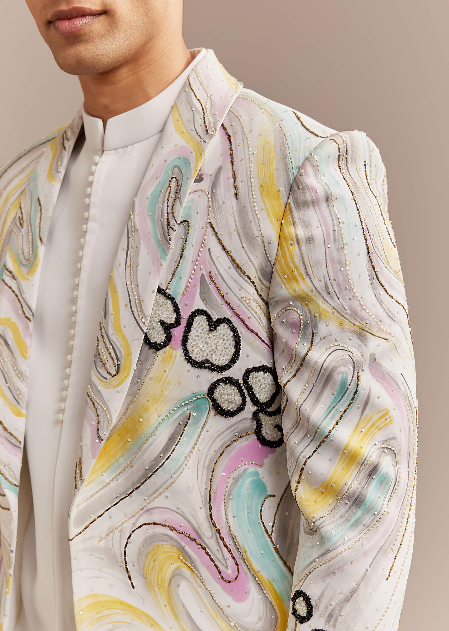 Artful and fresh, the look comes together when this white men’s indo western set in suiting fabric leads the event. Hand painted detailing meets intricate salli pearl and cutdana sequins... More Product Details