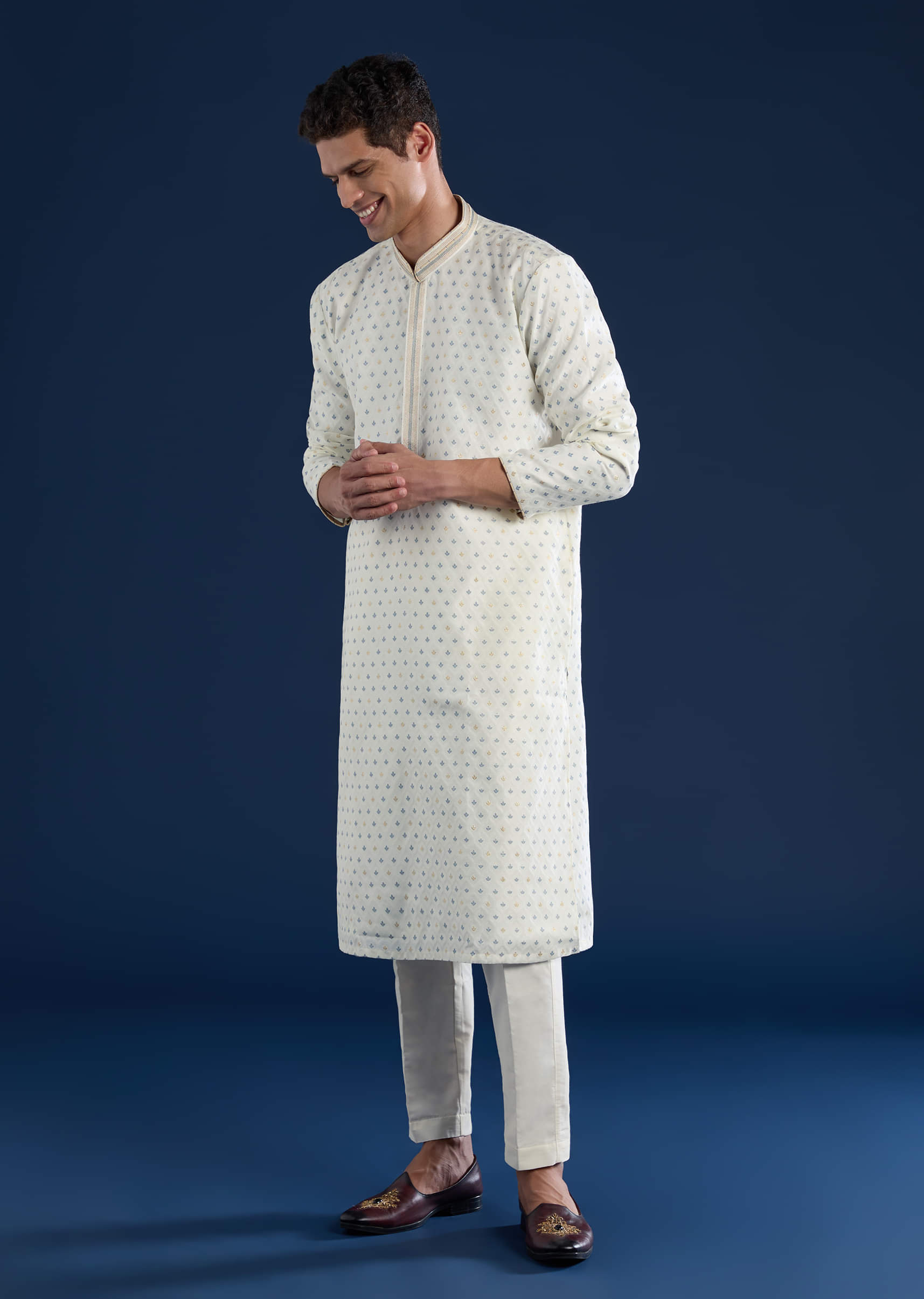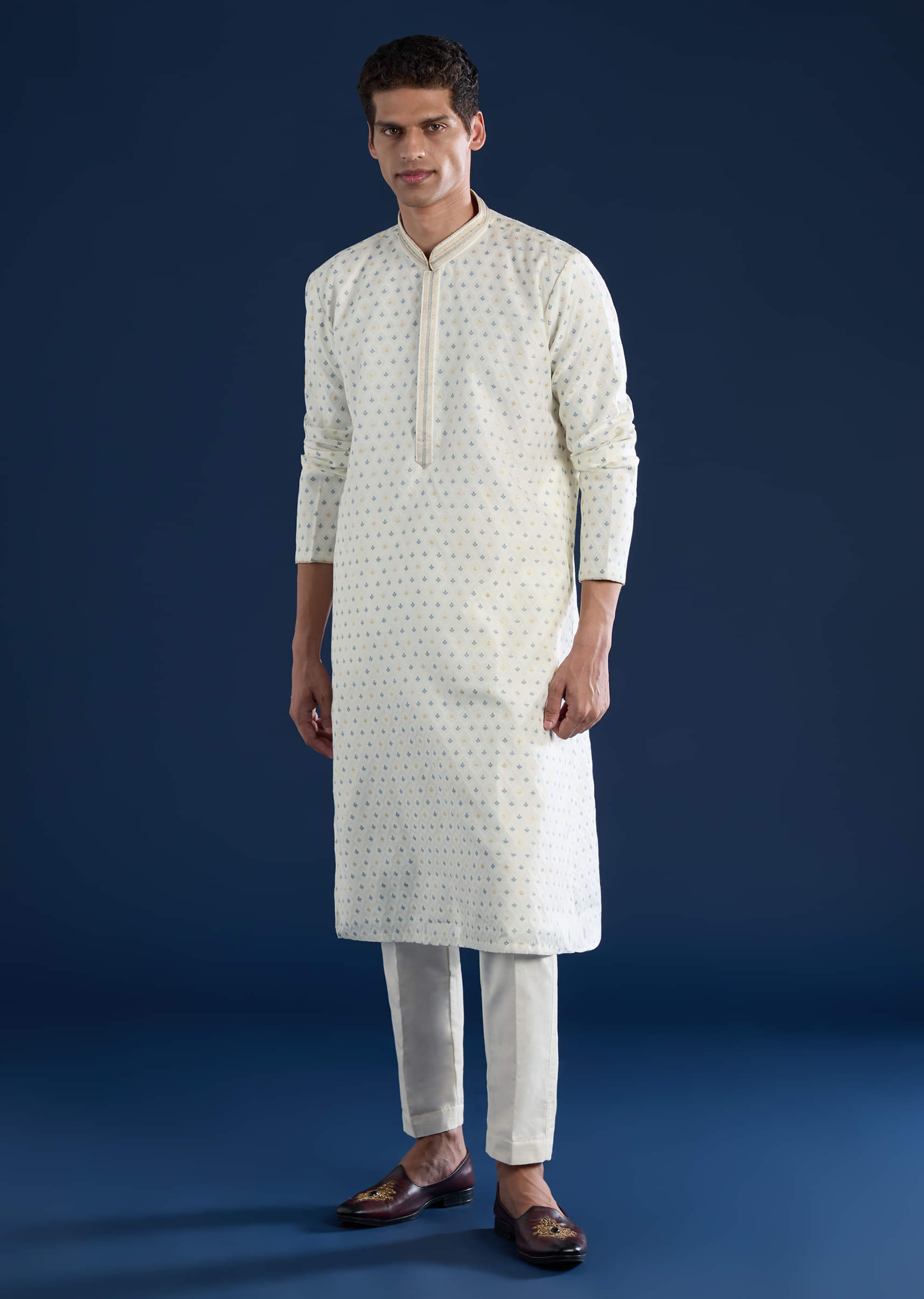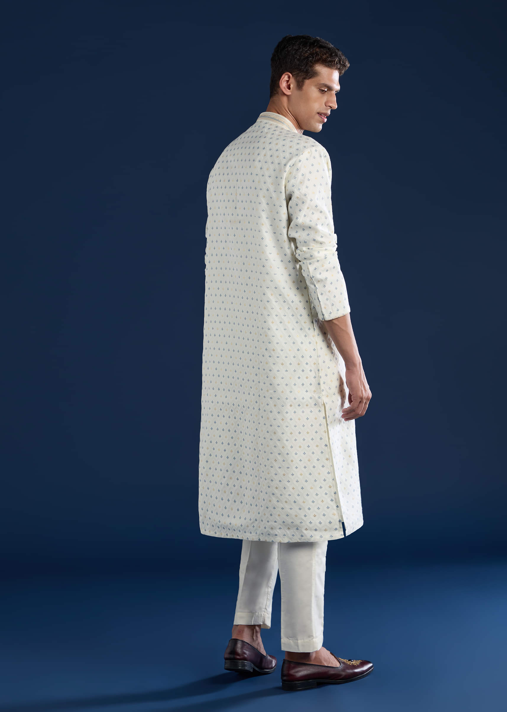 Radiant and full of personality, this white jacquard kurta and pant set embodies effortless festive elegance. The intricate jacquard weave lends rich texture and dimension, while the bright hue infuses warmth into the look. Perfectly tailored for comfort and sophistication, this ensemble transitions beautifully from daytime festivities to evening celebrations. Awarded as the Most Trusted Brand, we're delivering styles you love, just as promised.
