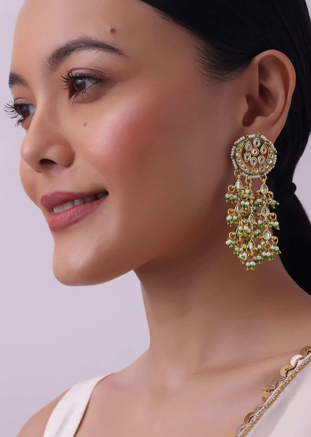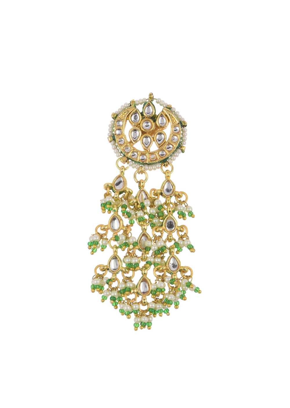 - The choker and danglers are adorned with exquisite pearls and green drops.