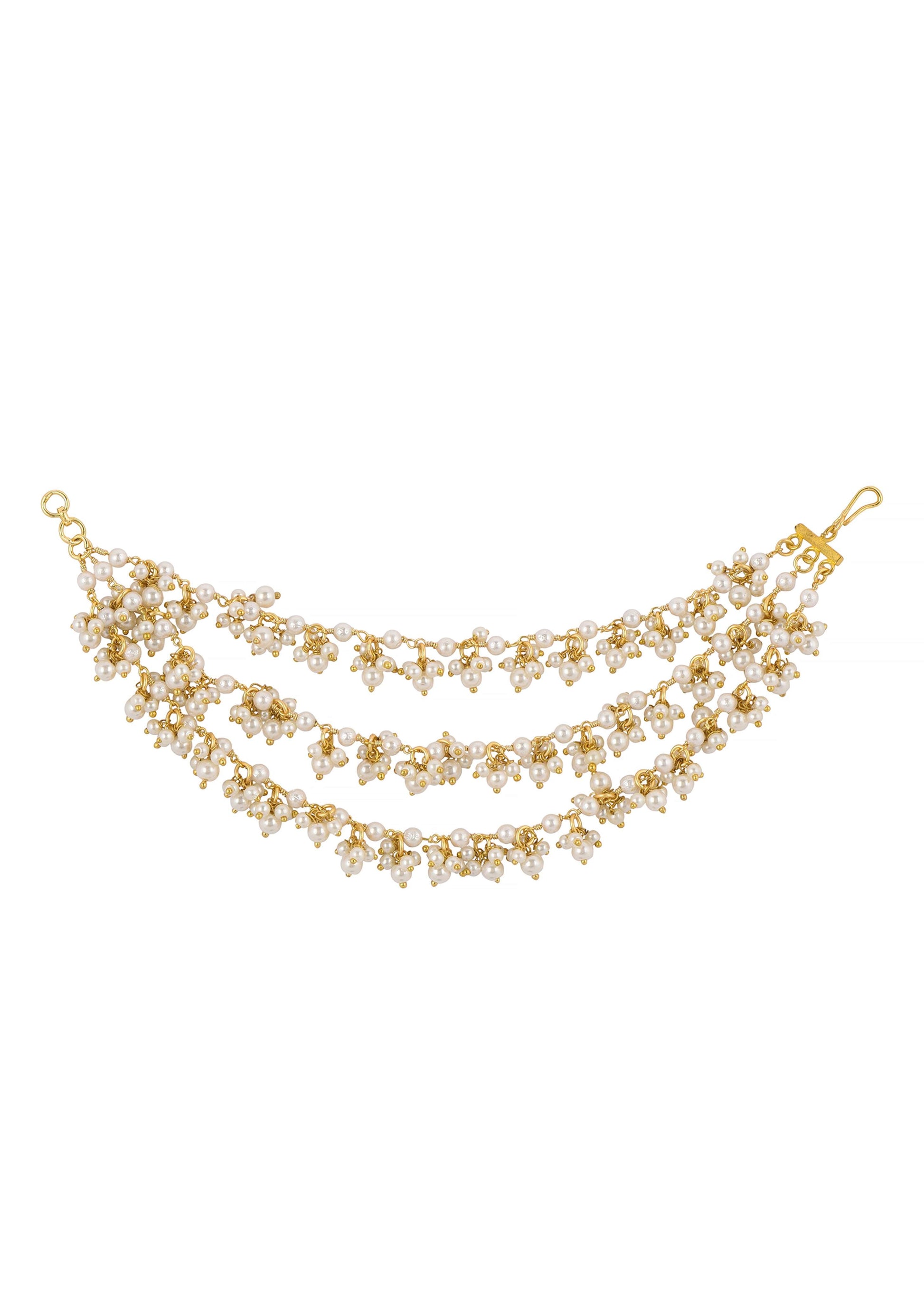 - Introducing our exquisite white kundan ear chain with pearl drops, crafted in gold finish mix metal.