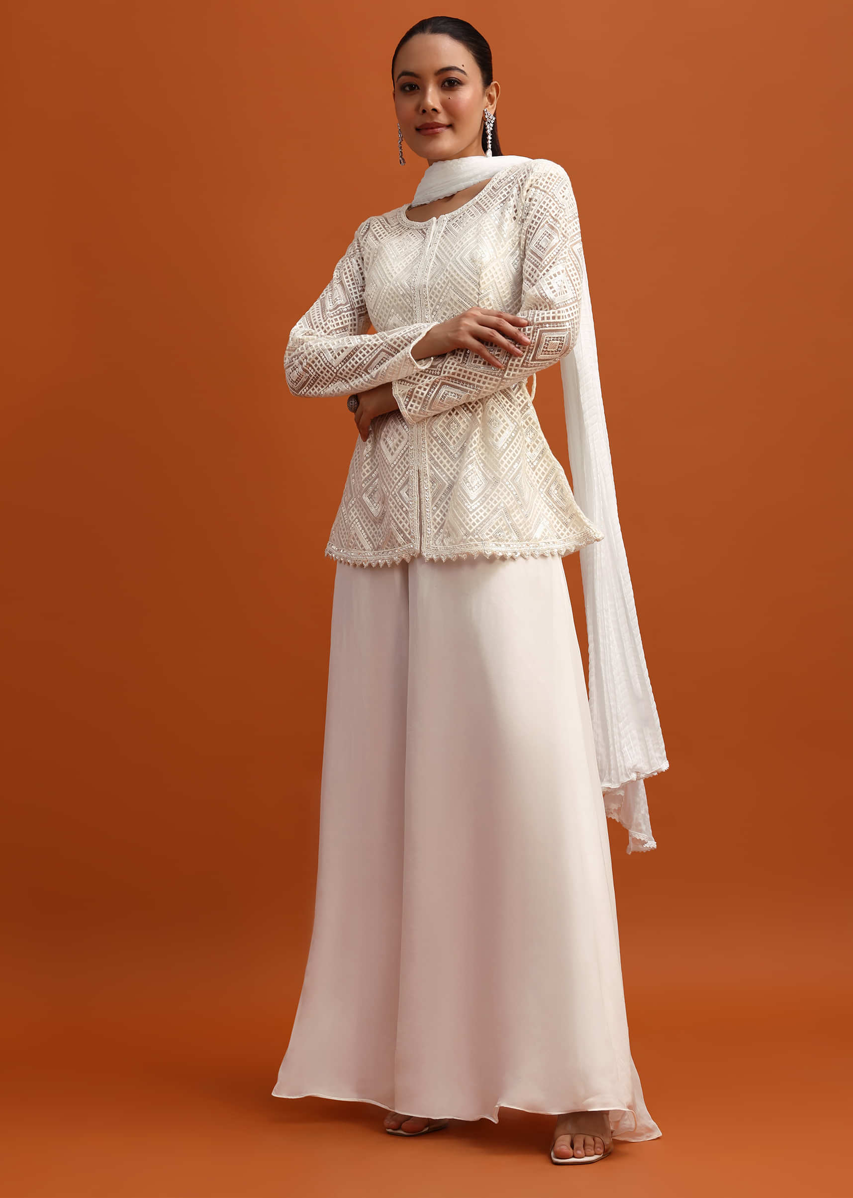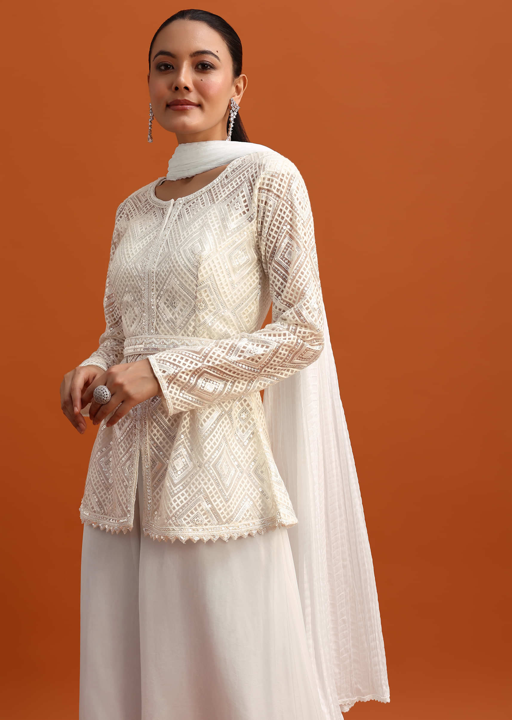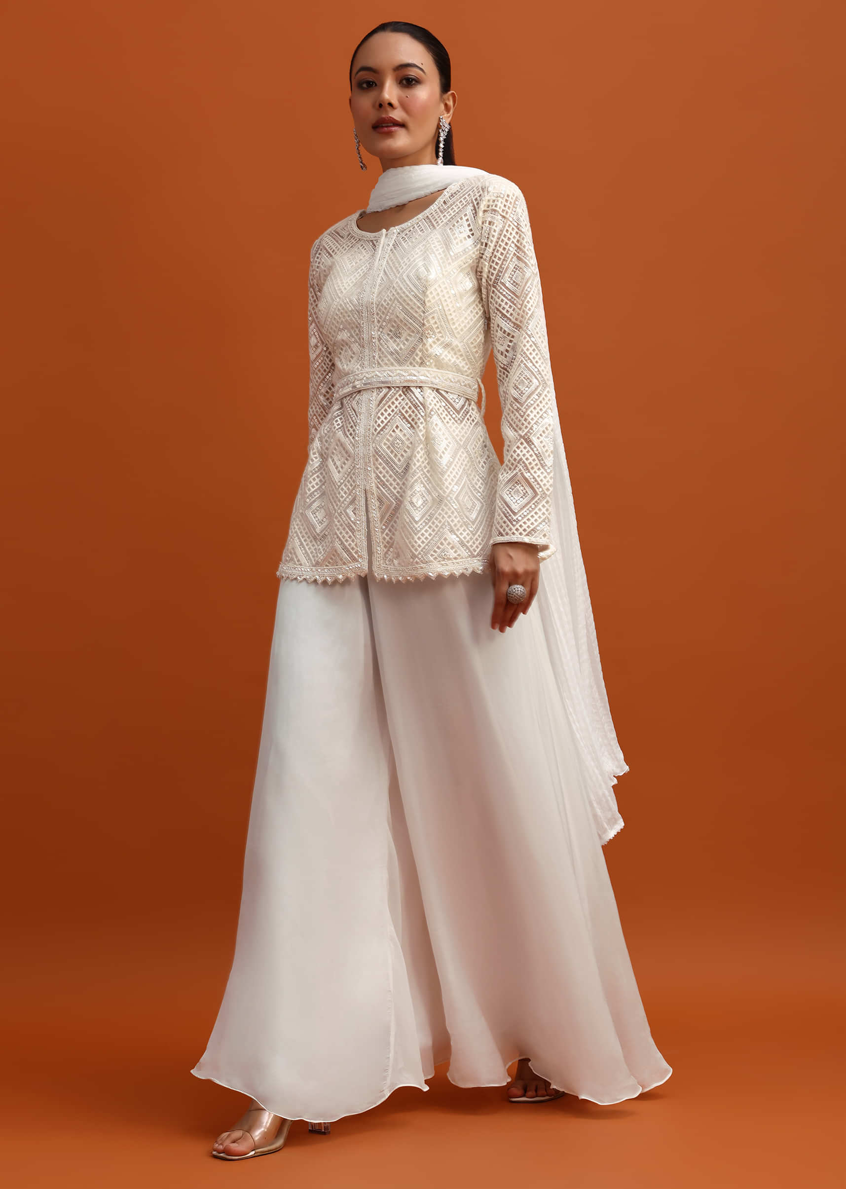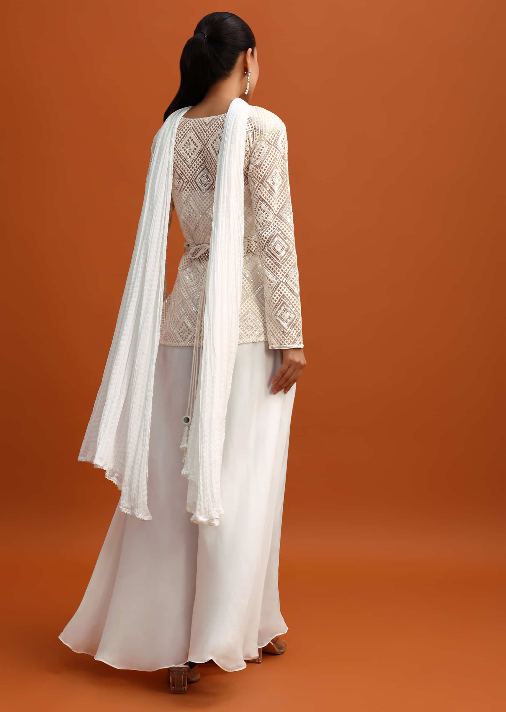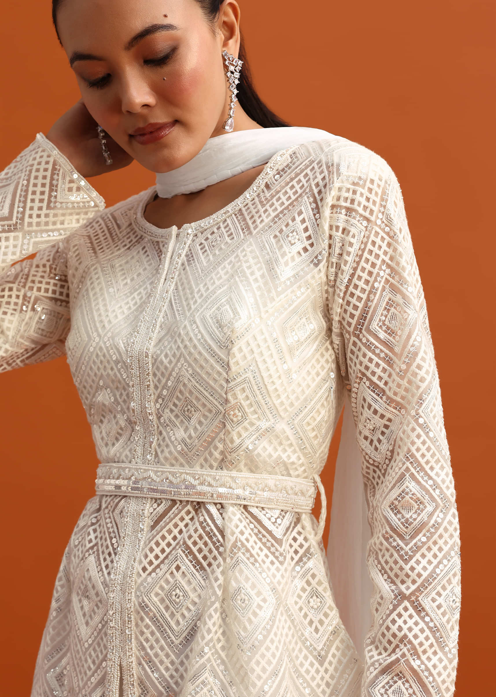 - This dazzling white kurta shimmers with sequin work, cinched by an opulent embroidered belt.