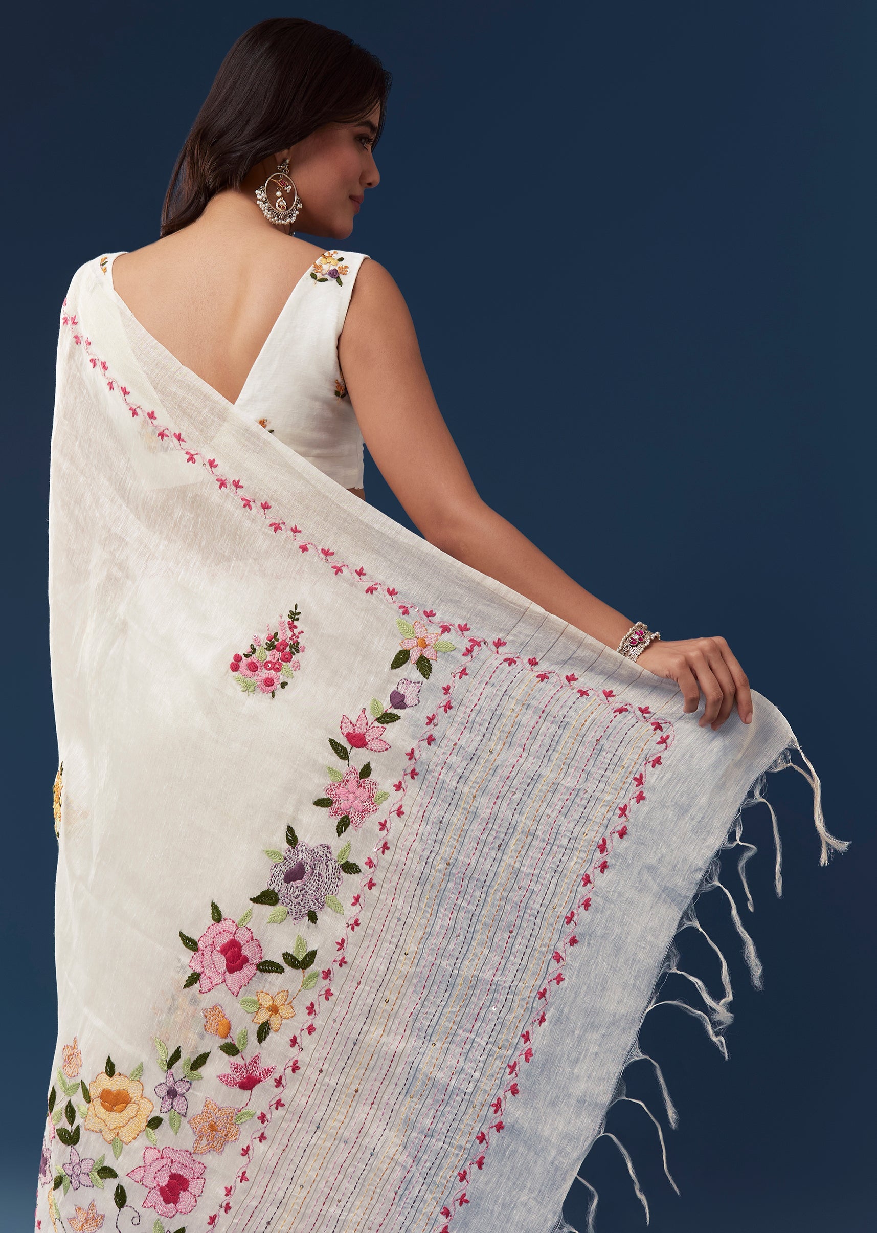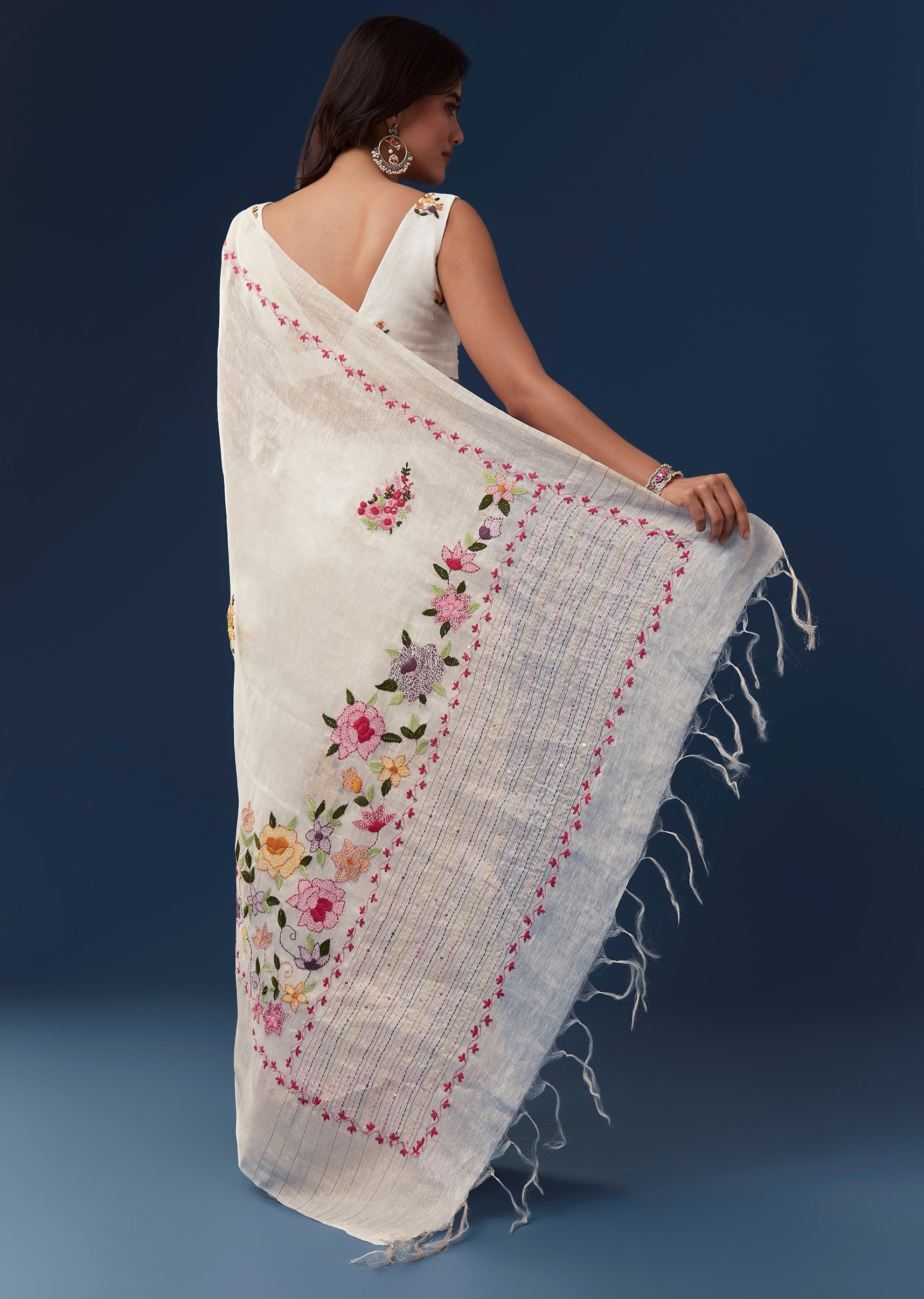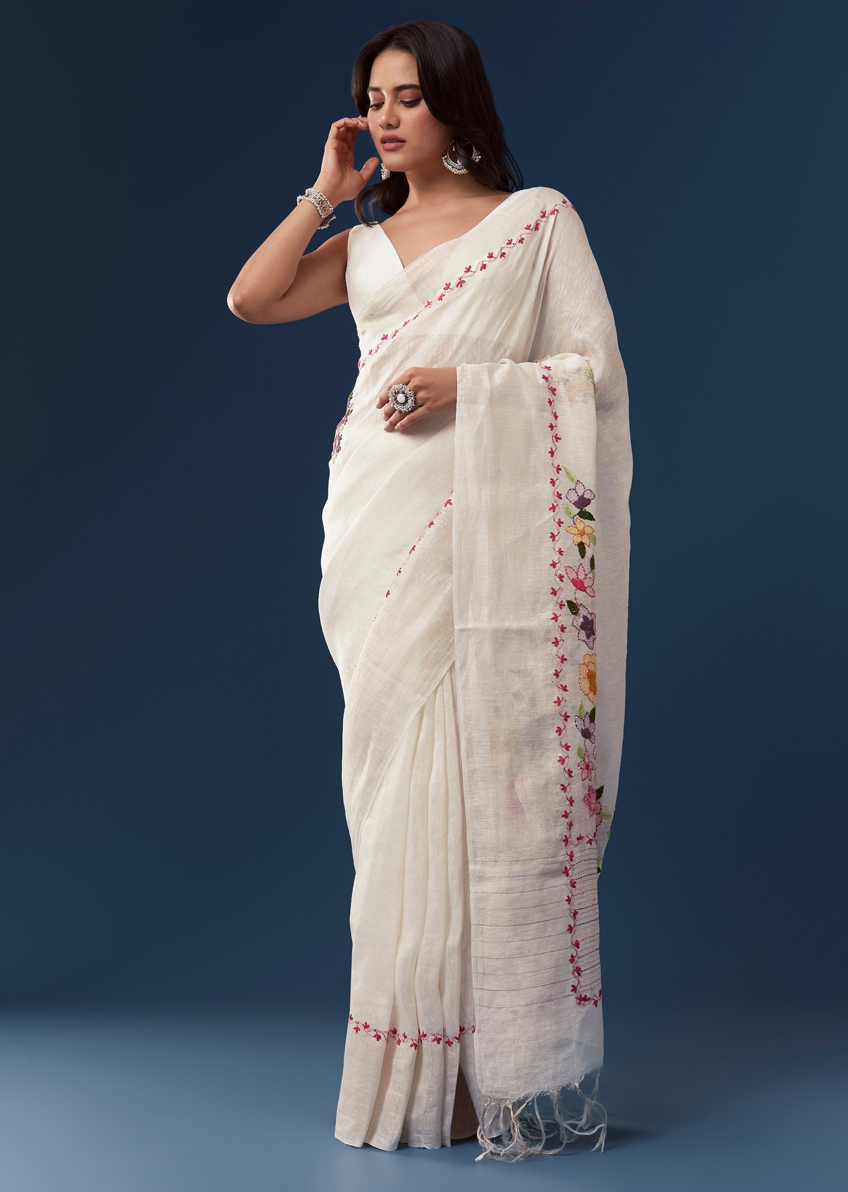 White Linen Saree With All Over Floral Resham Embroidery