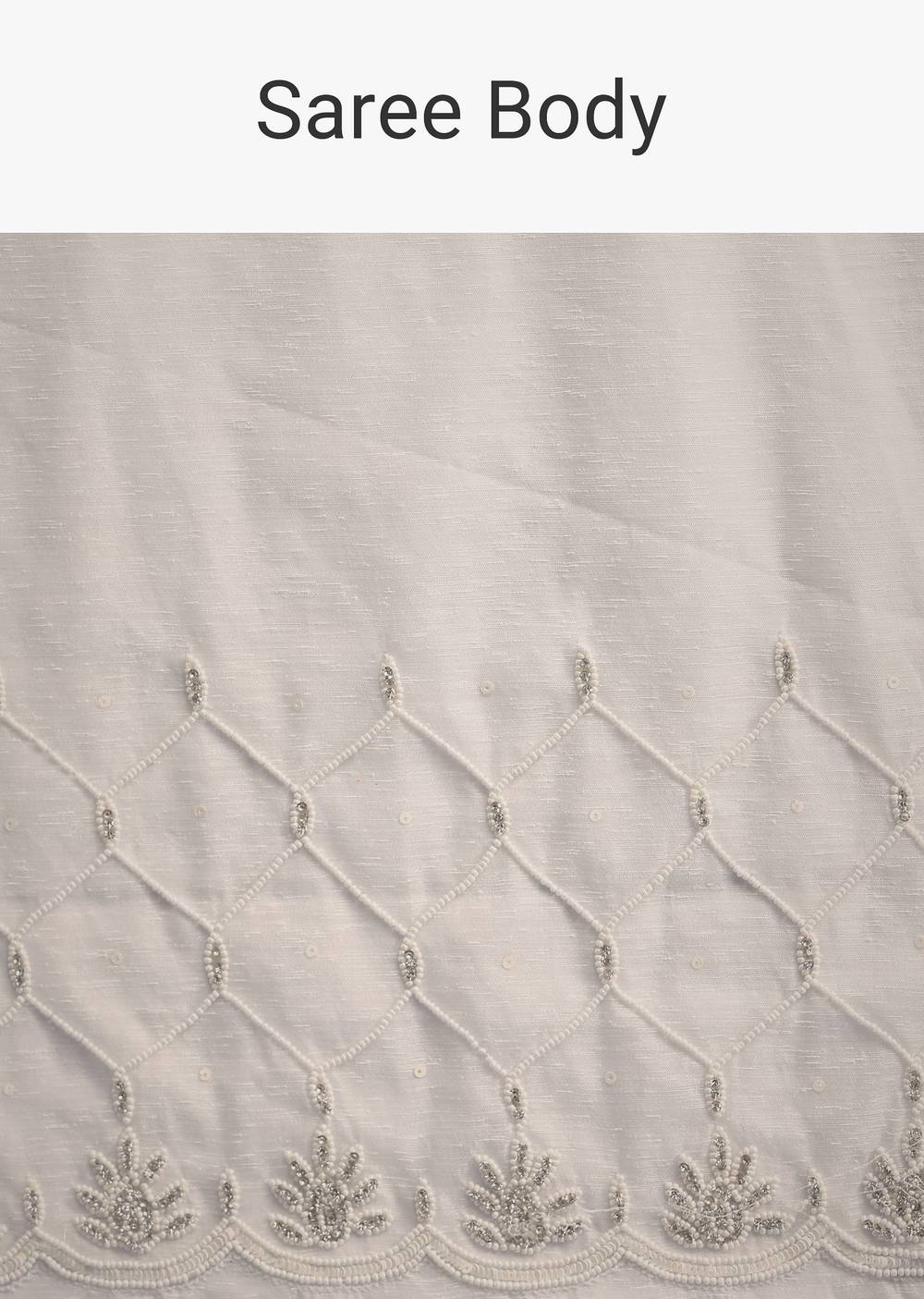 - Light up your special moments with our ethereal white saree, featuring a delicate organza fabric embellished with beads and a shimmering stone scallop border.