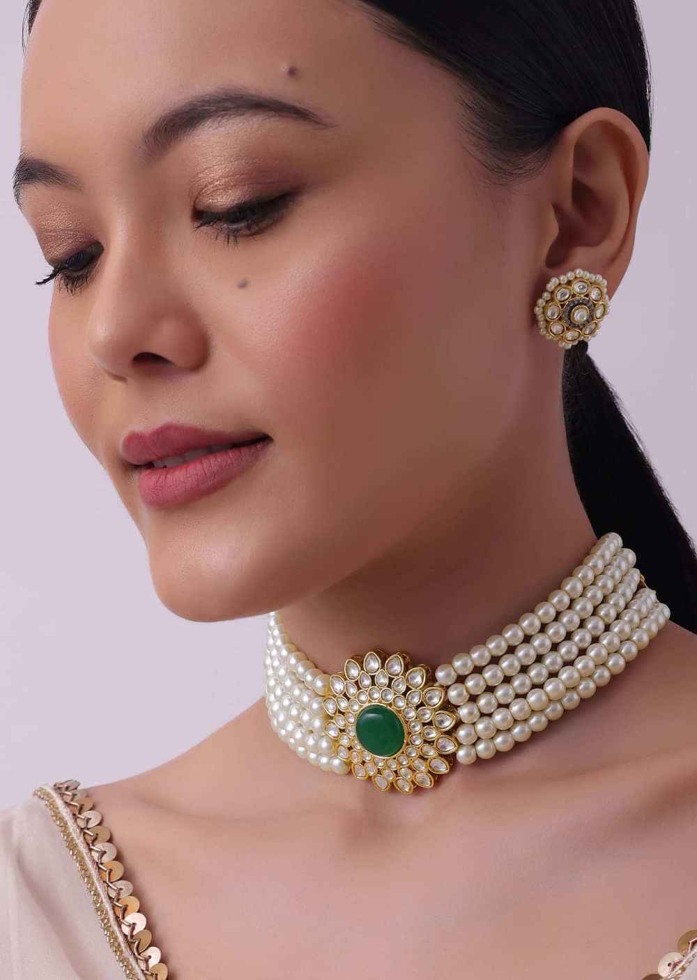 - Discover the epitome of elegance with our pearl choker featuring green studded stones and a zircon motif.