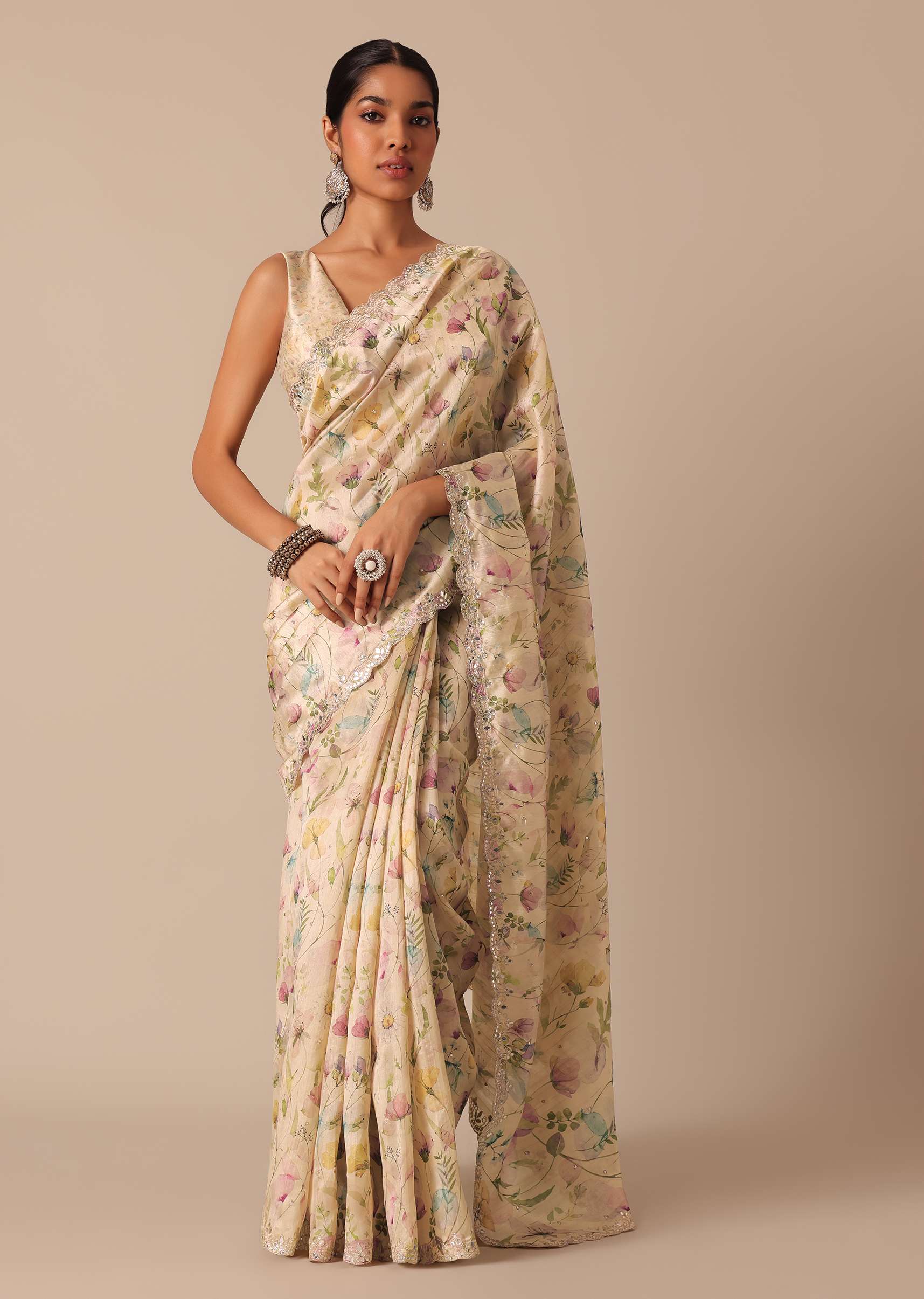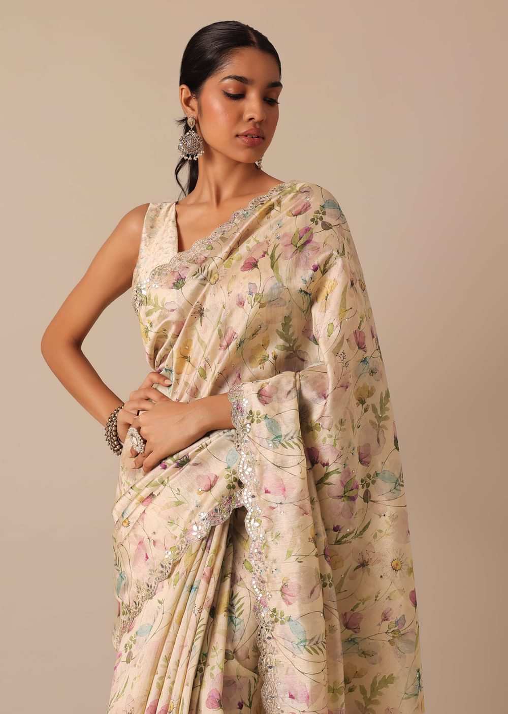 An effortless way to make a fashionable impact this festive season is by stepping out in this stunning white saree Showcasing a rich tussar silk fabric prettified with multicolor floral prints. The cutwork scallop border is further enhanced with glimmering mirrors for a standout look. Paired with an unstitched blouse piece this saree ensures a stunning look.WASH CARE INSTRUCTIONS. Blouse work may vary. Awarded As The Most Trusted Brand We'Re Delivering Styles You Love Just As Promised.