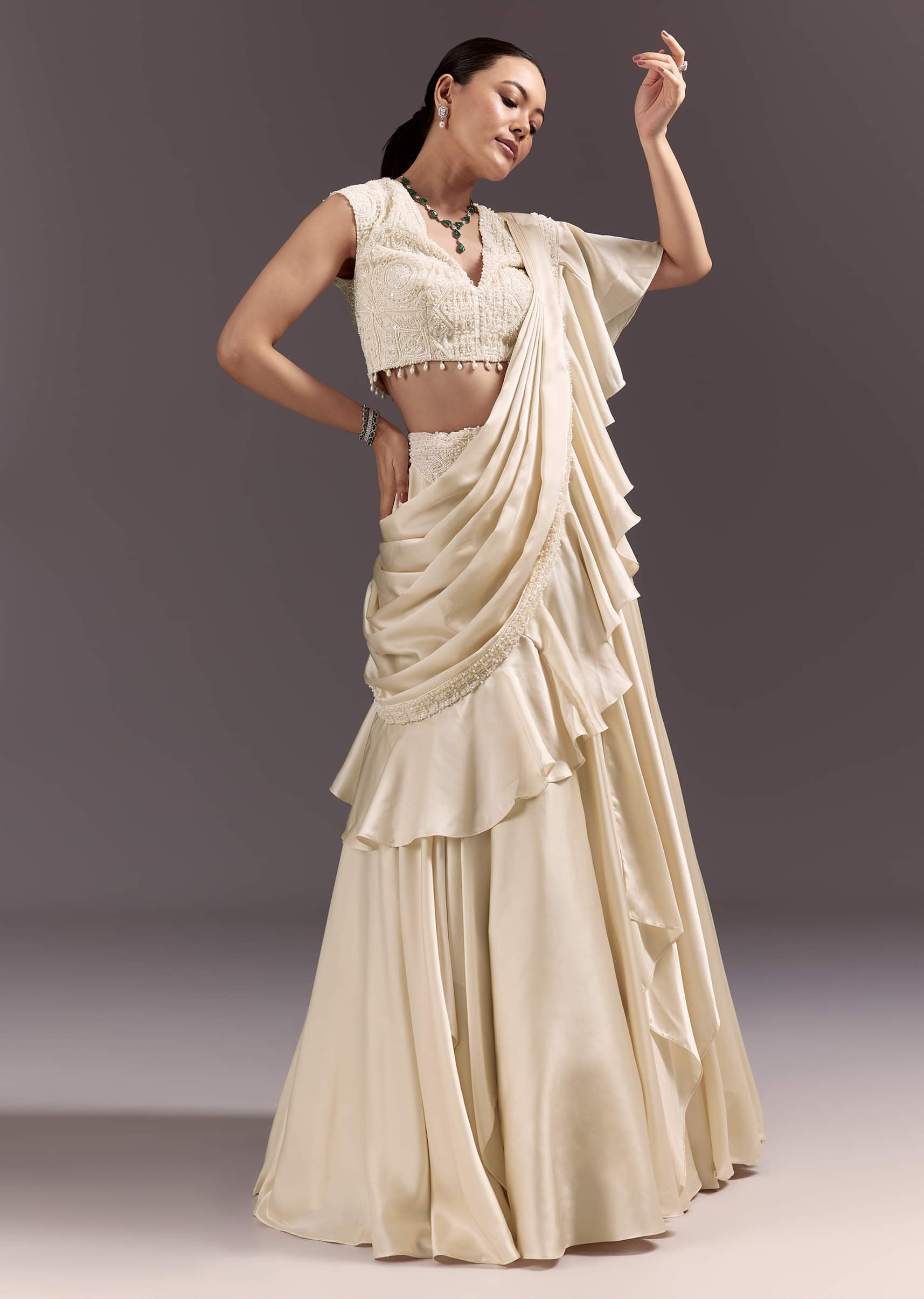 A modern twist on tradition, this white satin saree flows with frill drama. The sleeveless blouse complements the fluid structure. Shiny sequins add sparkle to the look. Ready to dazzle... More Product Details