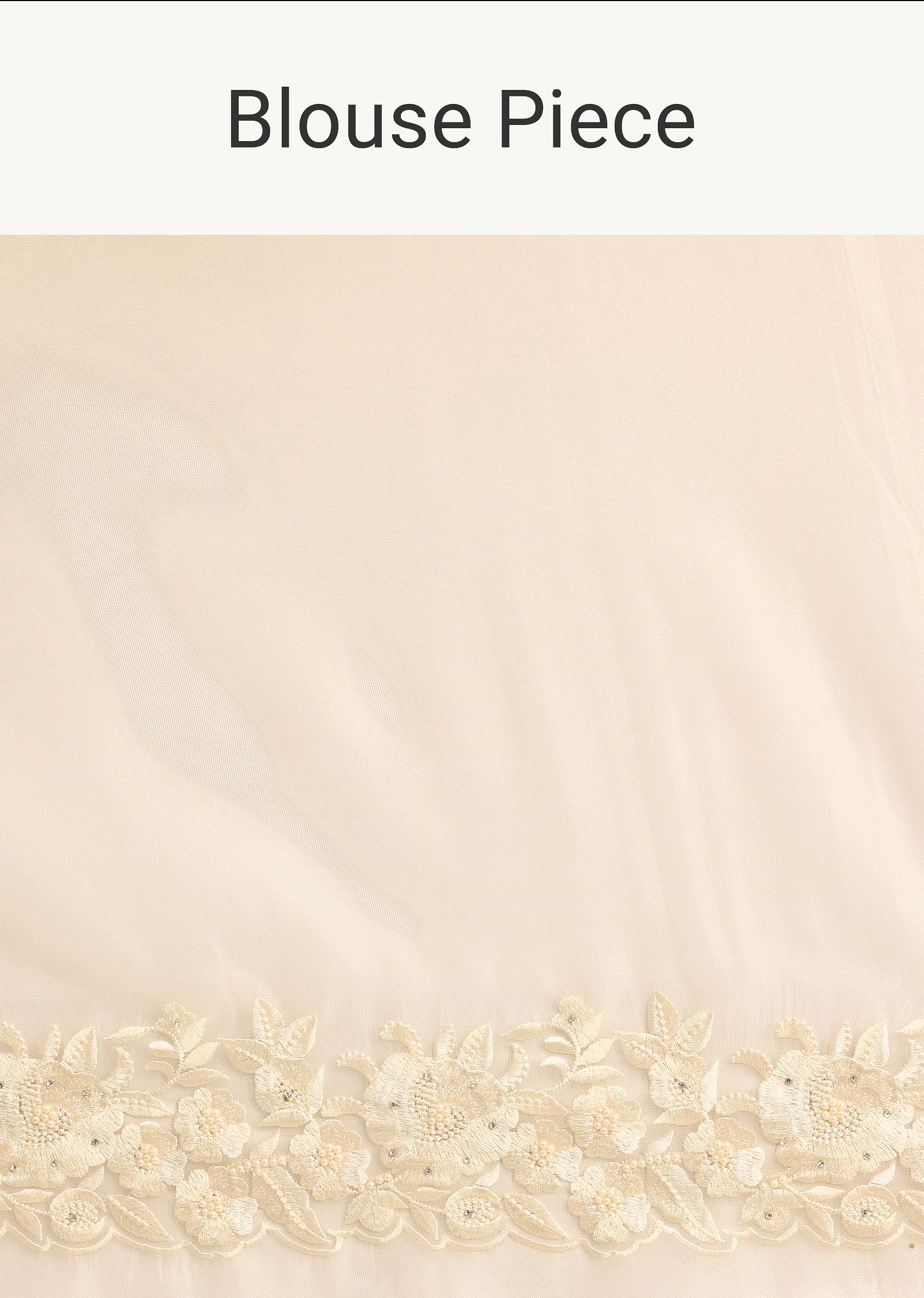 White Satin Saree With Floral Motif Thread Work And Unstitched Blouse Piece