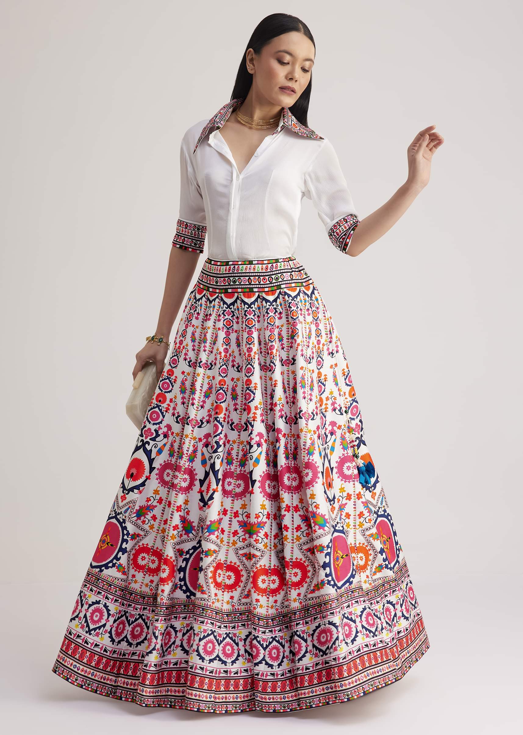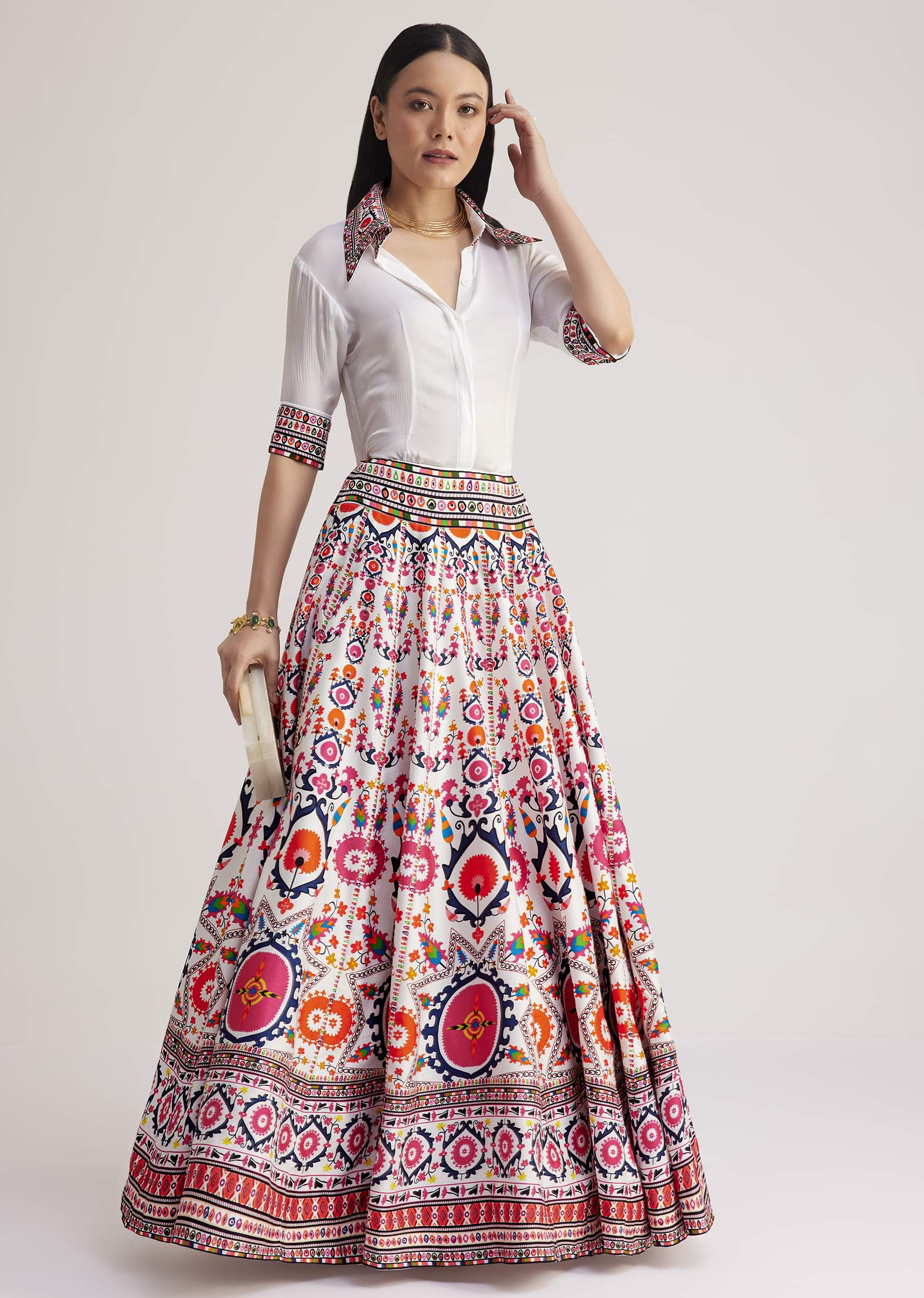 Add A Chic Twist To Your Festive Wardrobe With This White Shirt Paired With A Vibrant Multicolored Printed Skirt. Perfect For Daytime Events Prewedding Functions Like Haldi Or Mehendi And Festive Gettogethers This Ensemble Blends Contemporary Style With Traditional Charm. The Crisp White Shirt Features Intricate Print On The Collar And Cuffs While The Flowy Printed Skirt Showcases Vibrant Patterns For A Striking Look. Awarded as the Most Trusted Brand, we're delivering styles you love, just as promised.