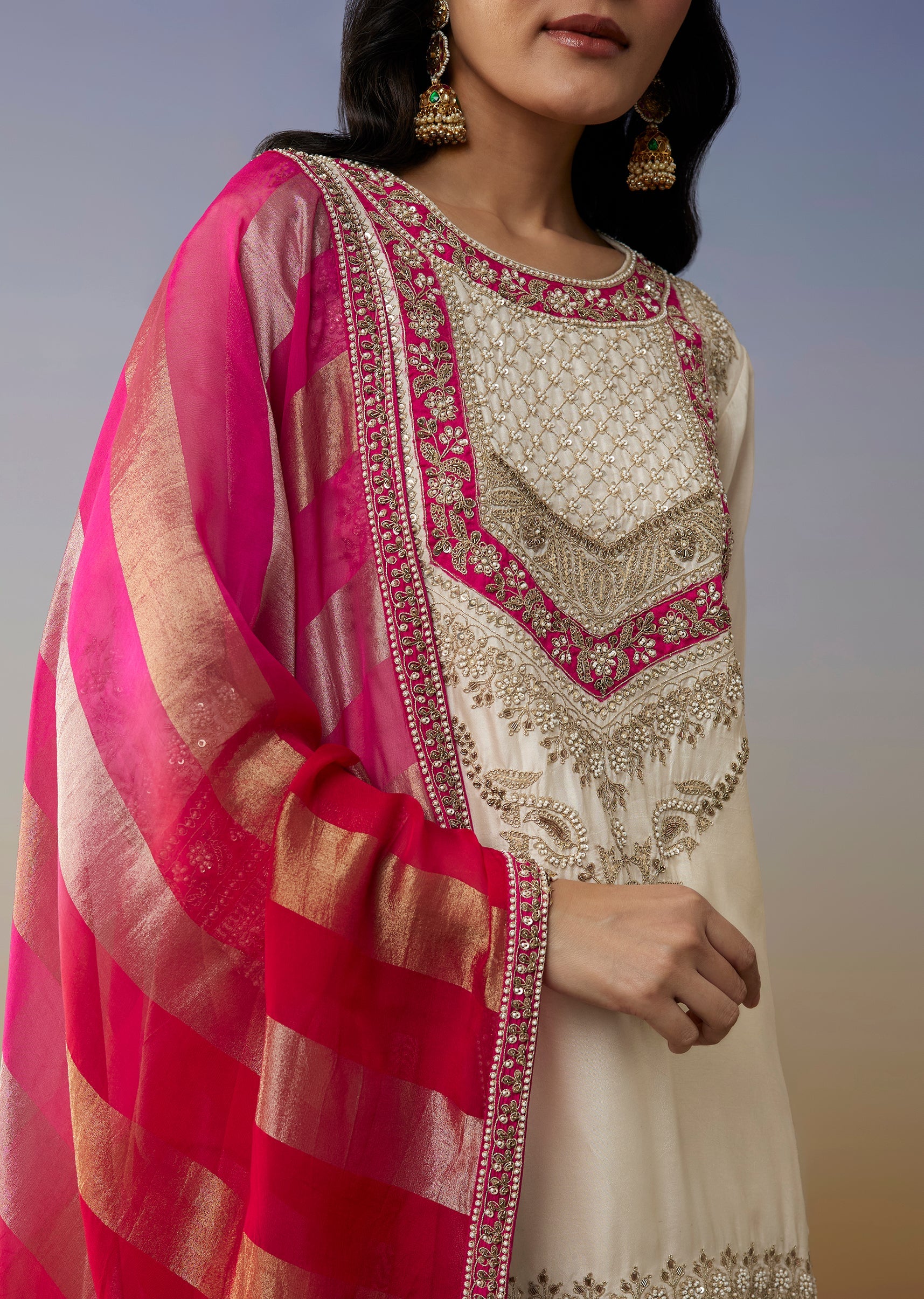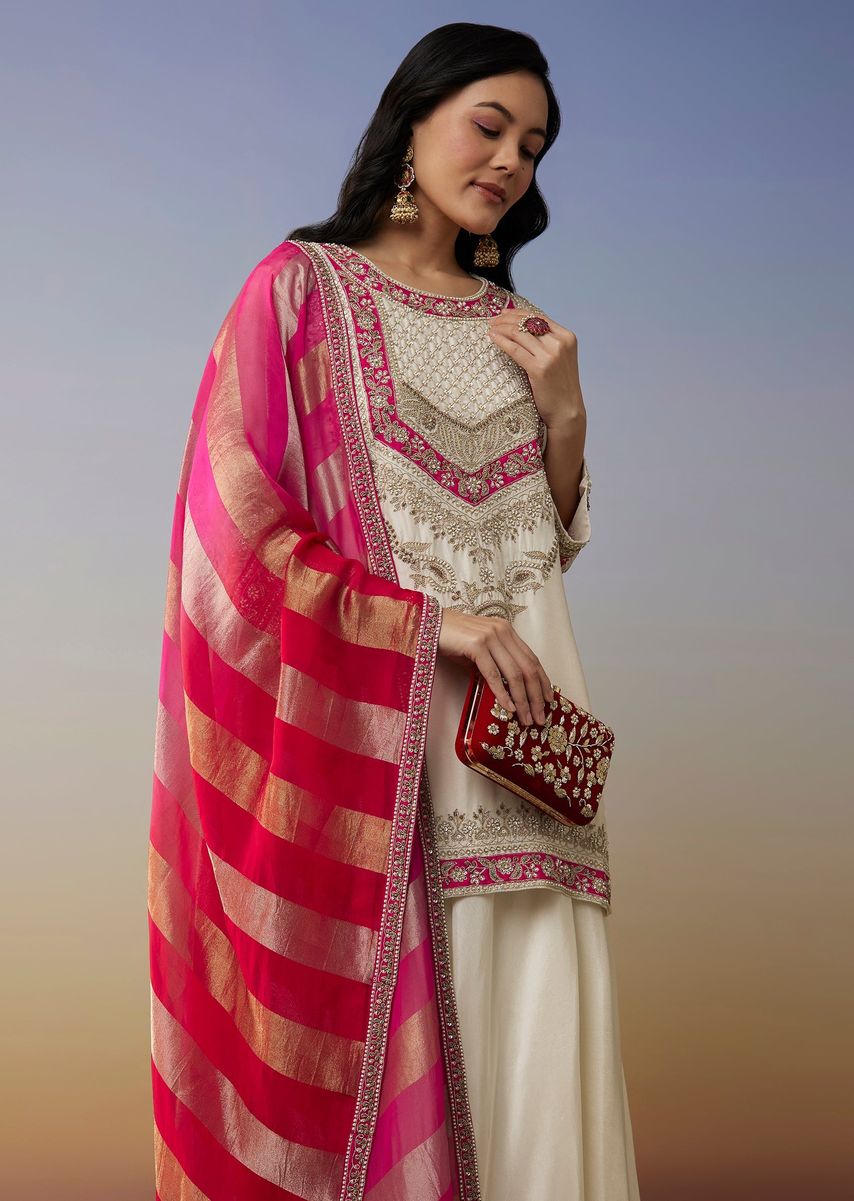 This white palazzo suit set blends pastel elegance with festive charm perfect for mehendi and engagement events. The straight style silhouette is paired with a beautifully crafted ombre dupatta adding... More Product Details