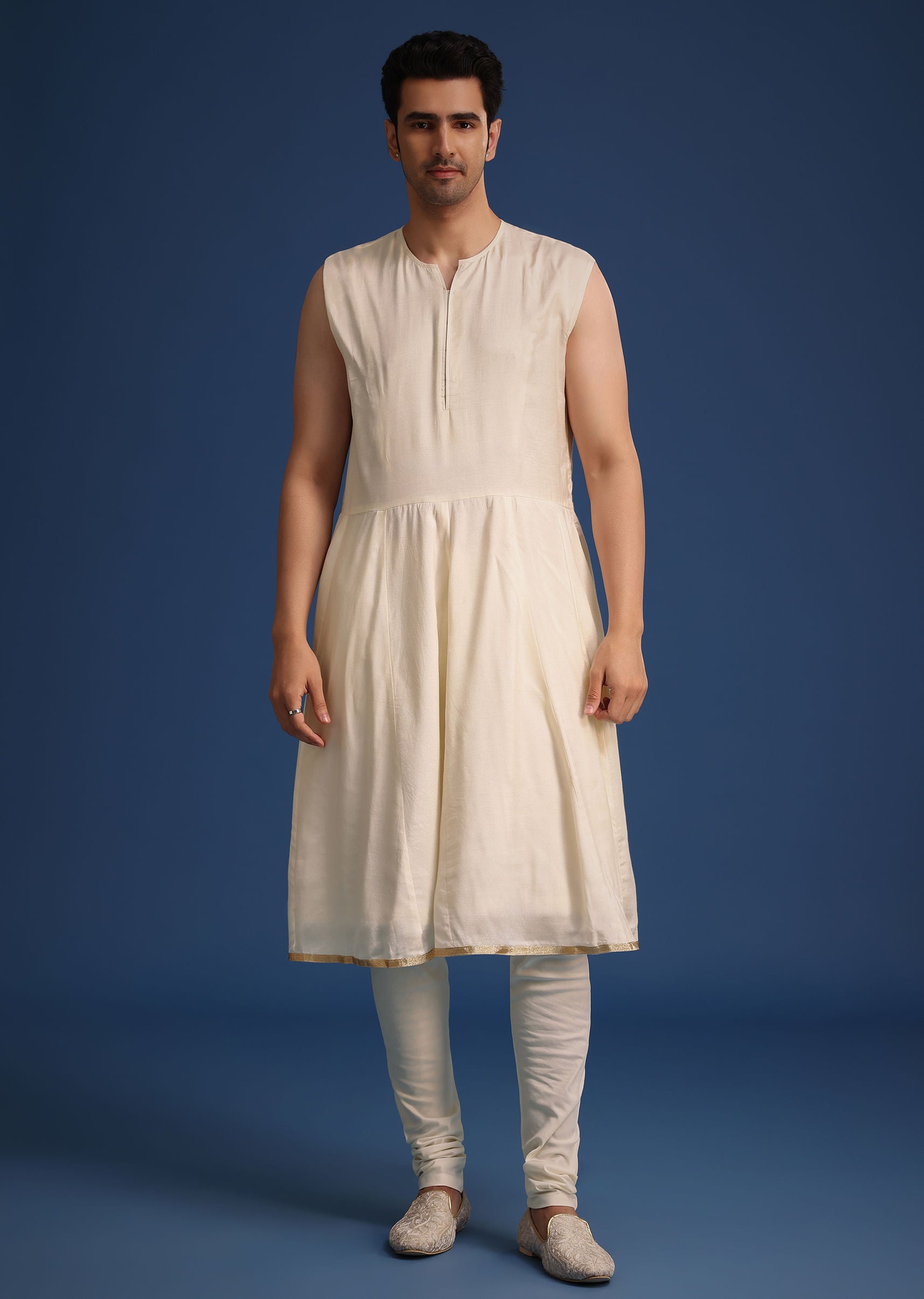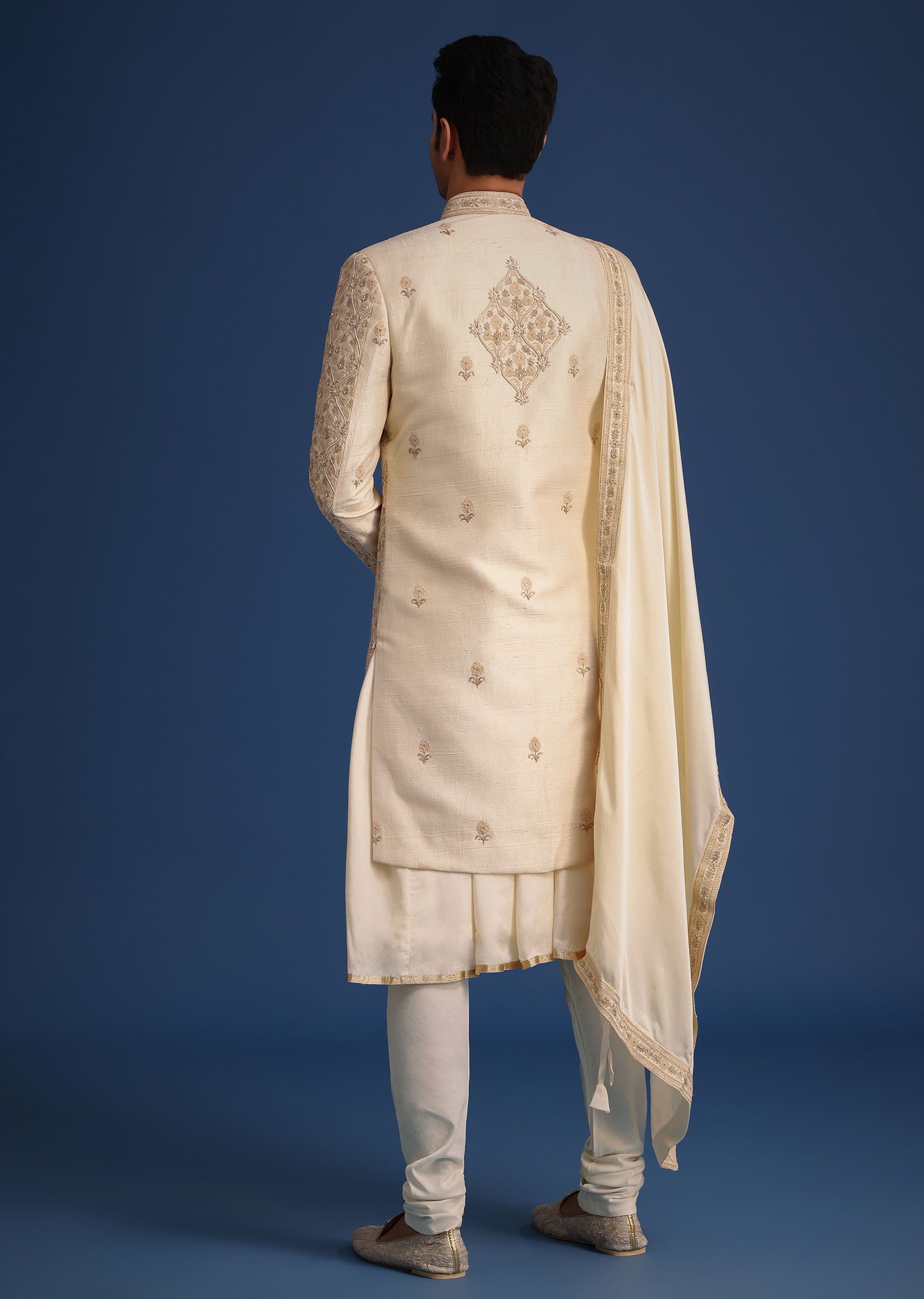 - Celebrate the season of festive celebrations and grand weddings in our opulent white silk sherwani set.