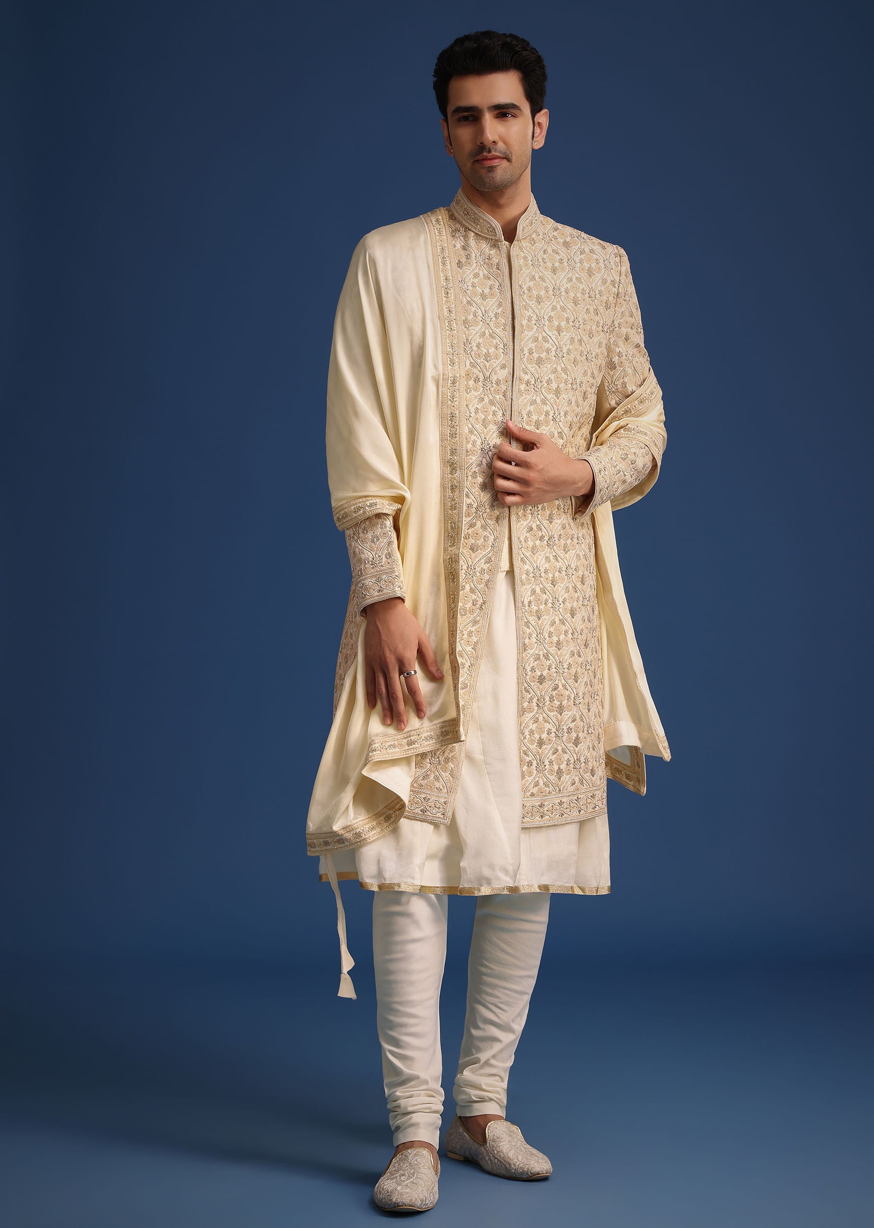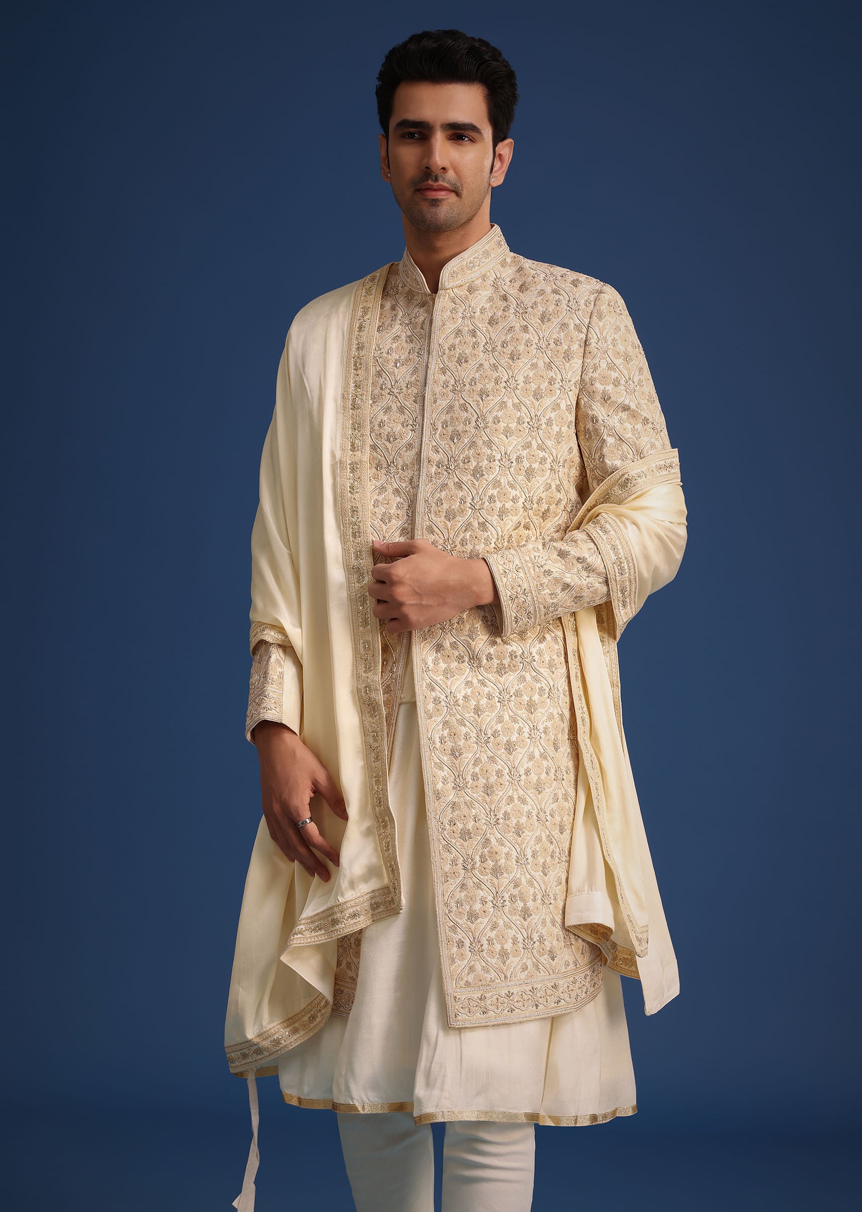 -  Highlighted with a mandarin collar, front hook-eye placket and full sleeves, the sherwani is decked with zari work and zardozi embroidery.