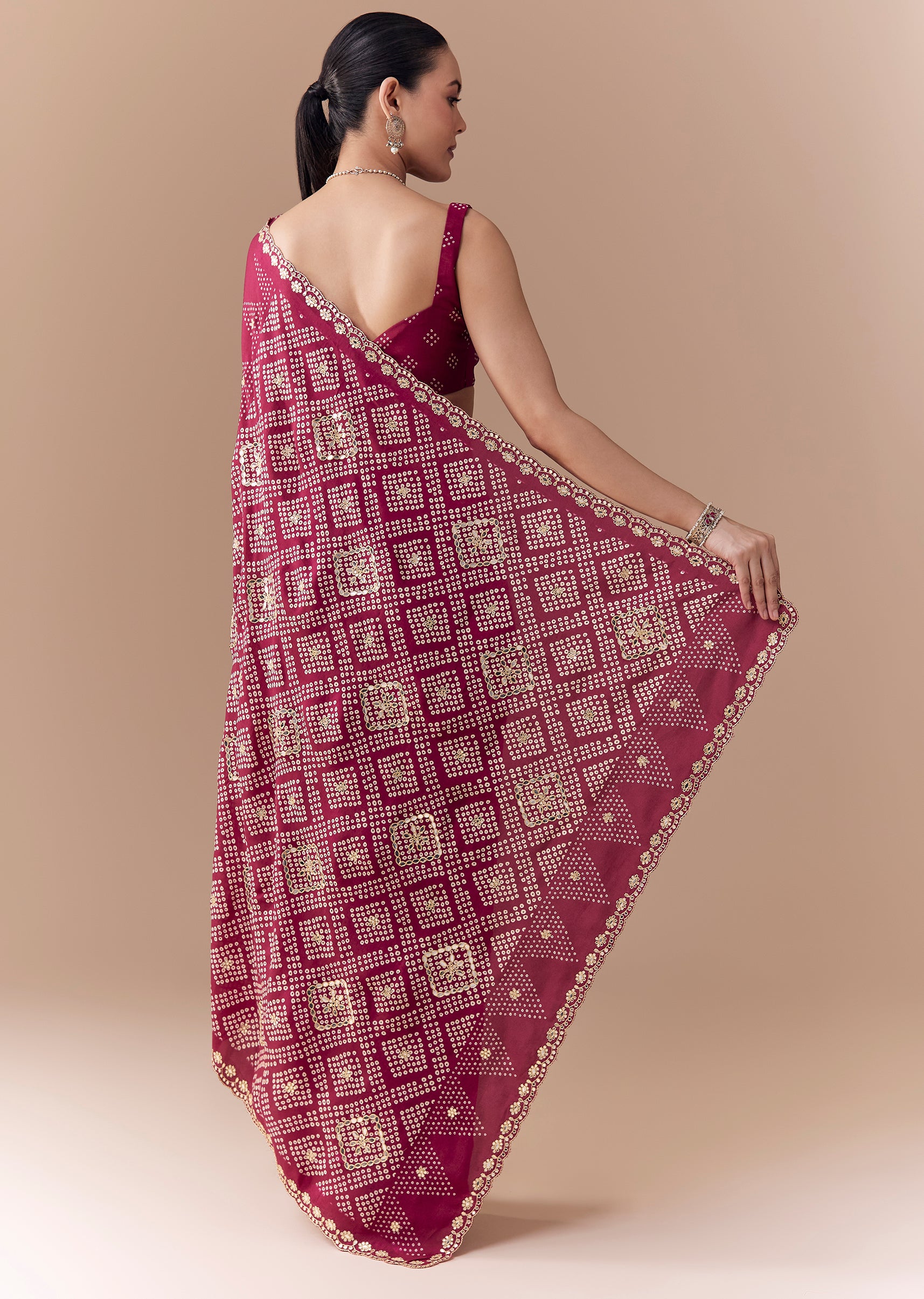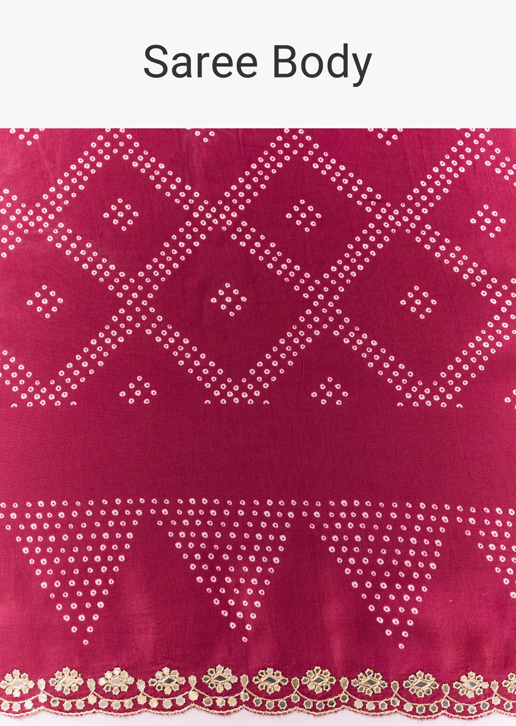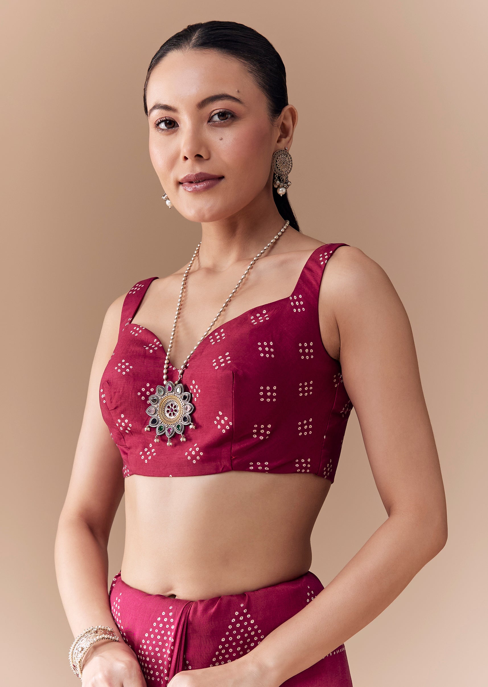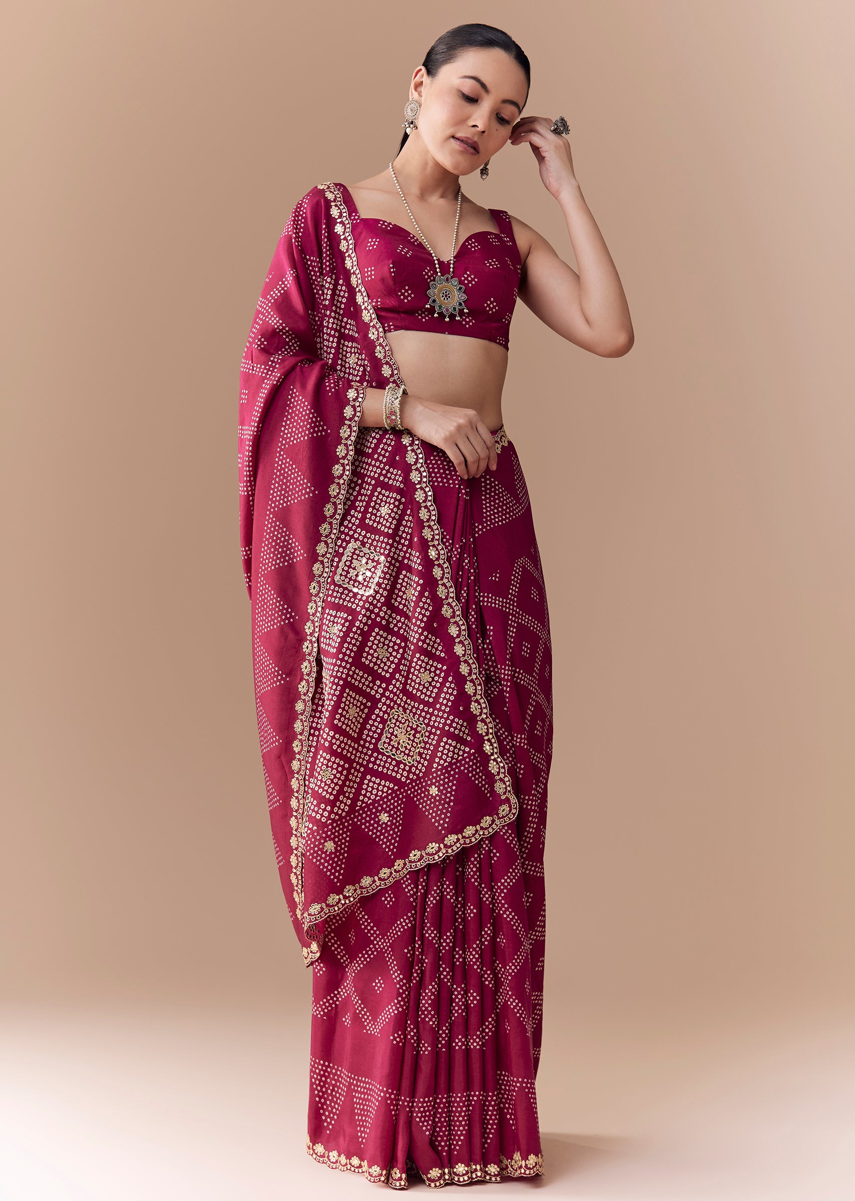 Wine Crepe Bandhani Print Saree with Blouse Fabric
