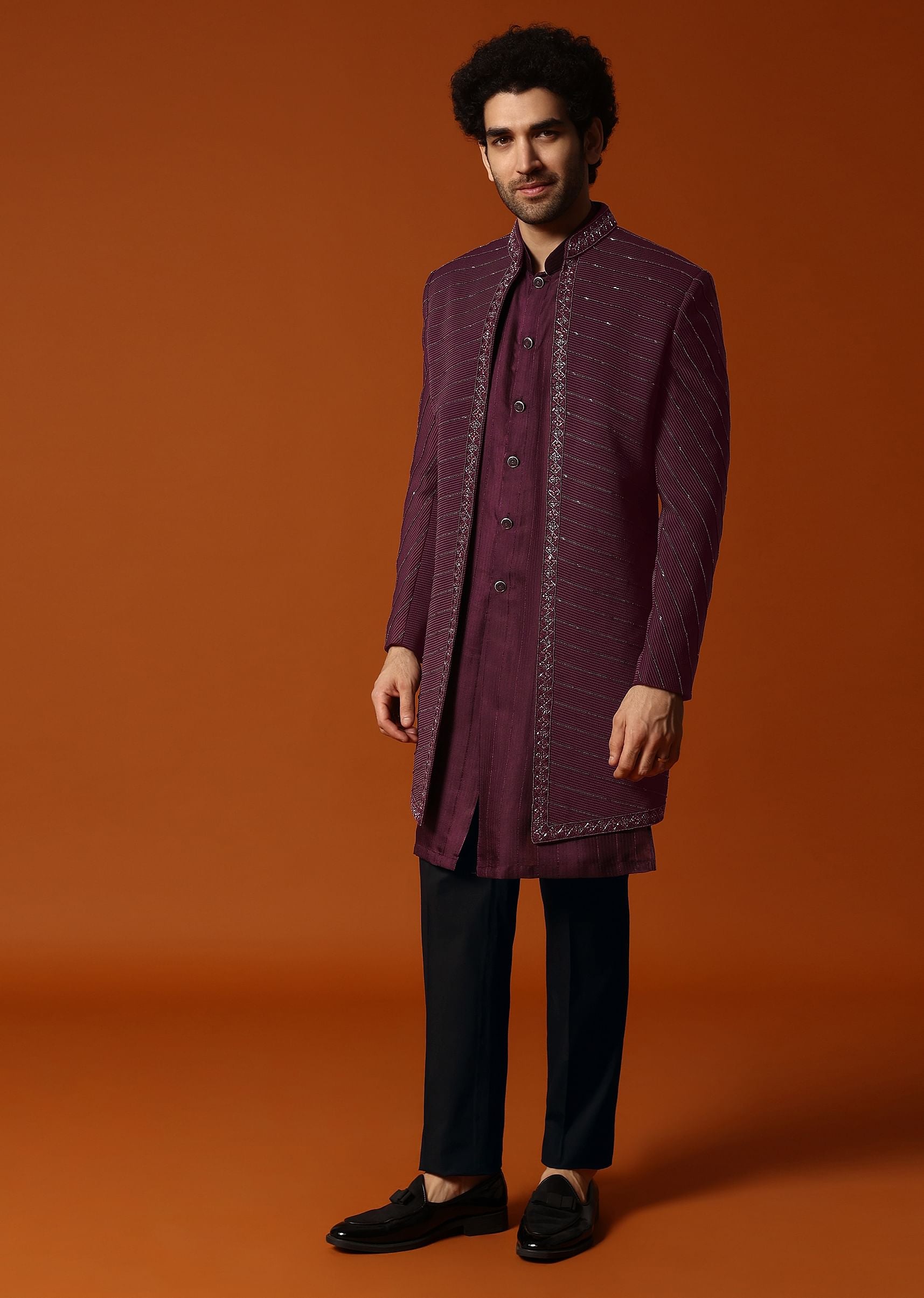 - Shine brilliantly in the limelight with our wine sherwani set, specifically crafted for sangeet and wedding functions.