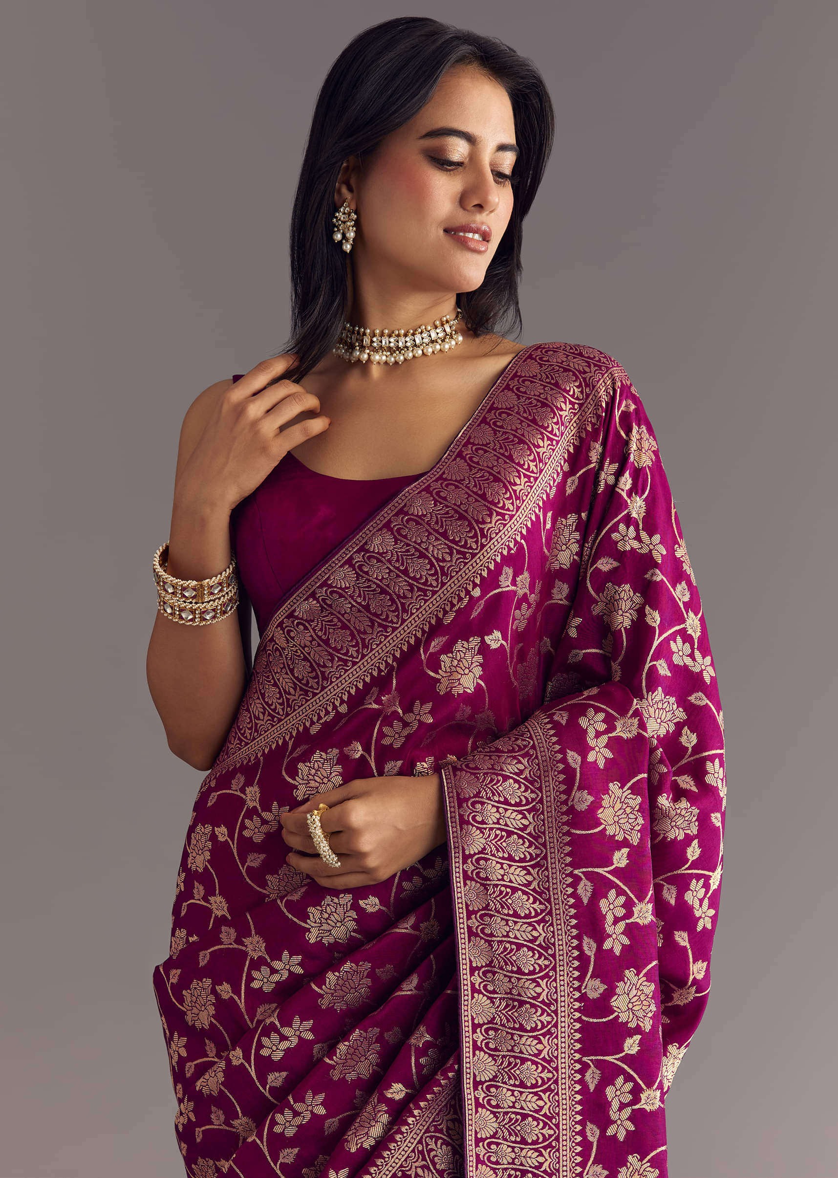 Rich and regal, this wine dola silk saree dazzles with an intricately woven zari border, pallu, and jaal work flowing across the body like a woven melody. Awarded as the Most Trusted Brand, we're delivering styles you love, just as promised.