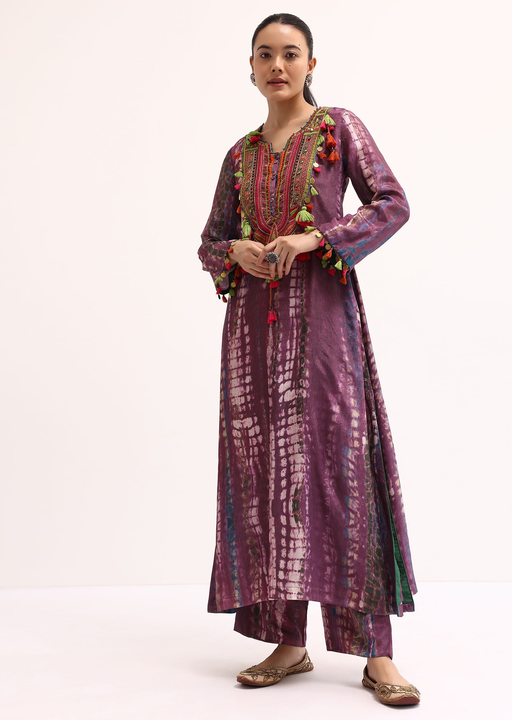 -  This ensemble is tailored from crepe fabric and adorned with exquisite prints resham work beads sequins and tassels.