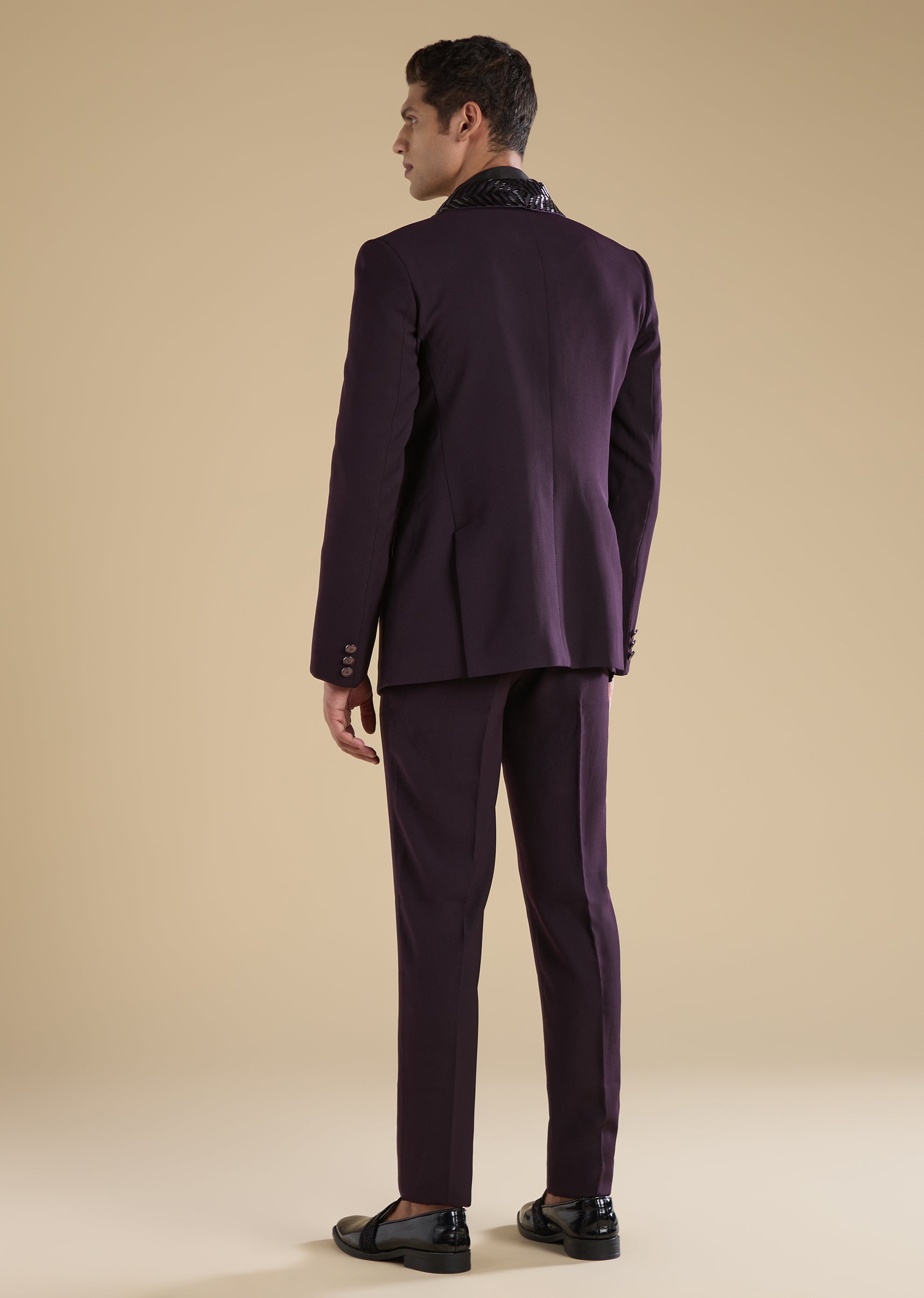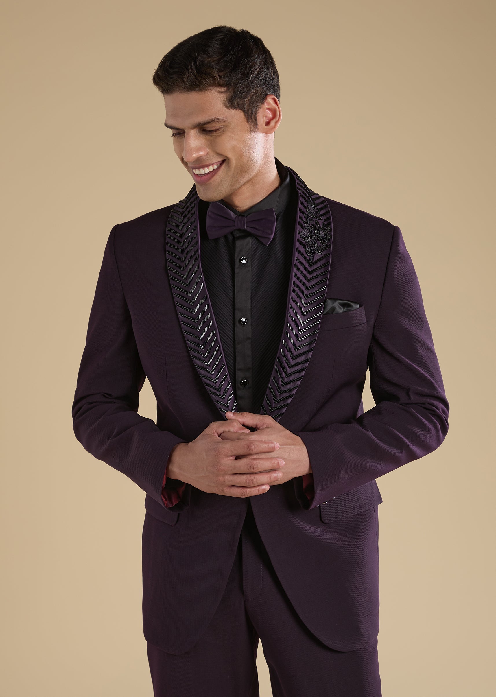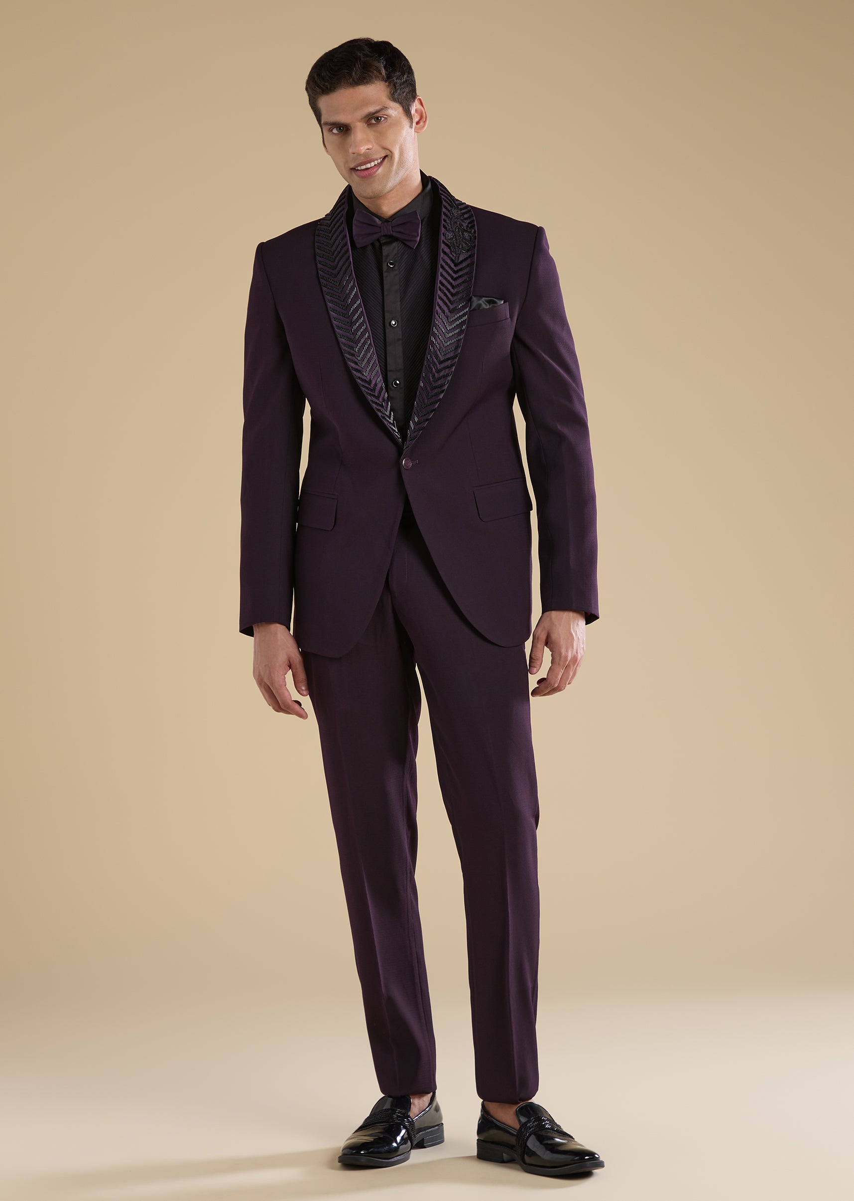Wine Embroidered Tuxedo Set With Bow Shirt And Trousers