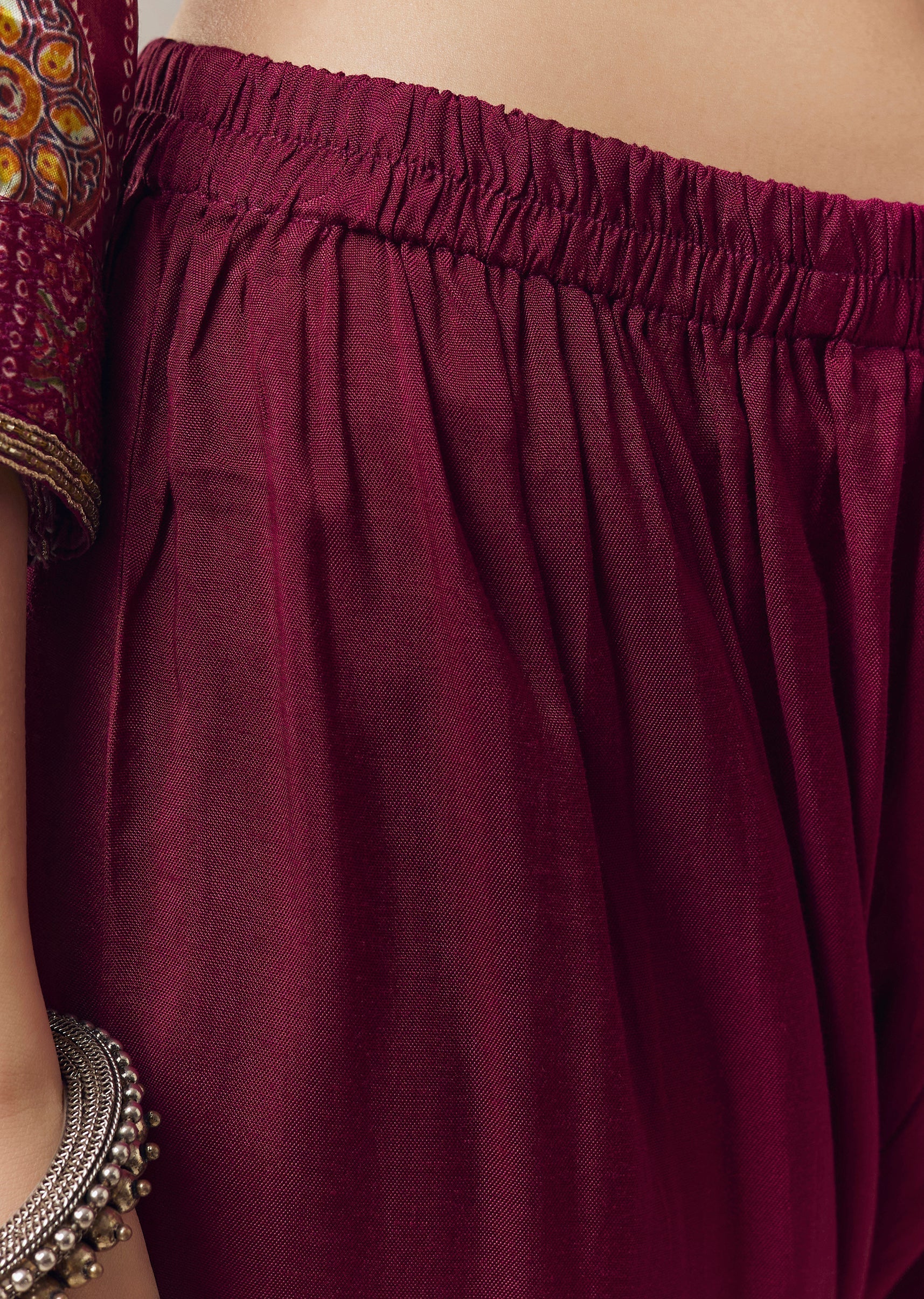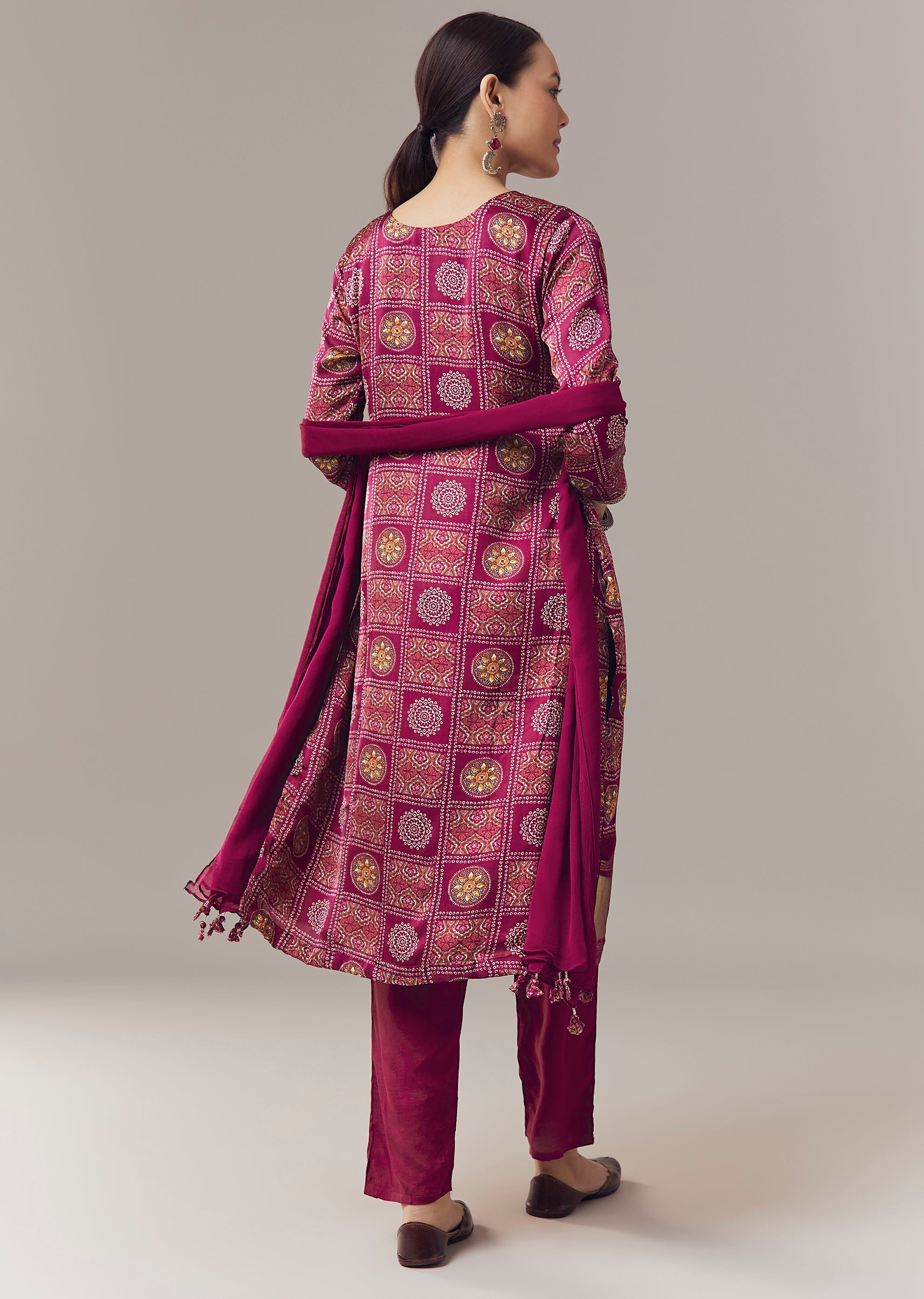 Wine Kurta Set In Bandhani Print With Embroidered Neck And Dupatta