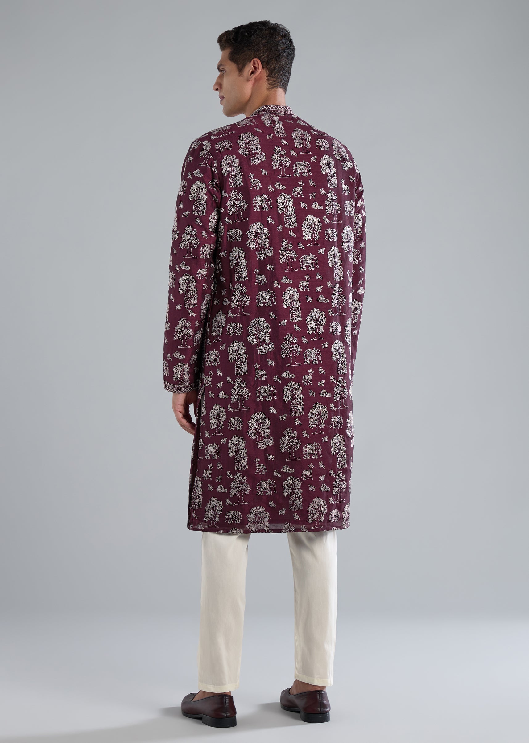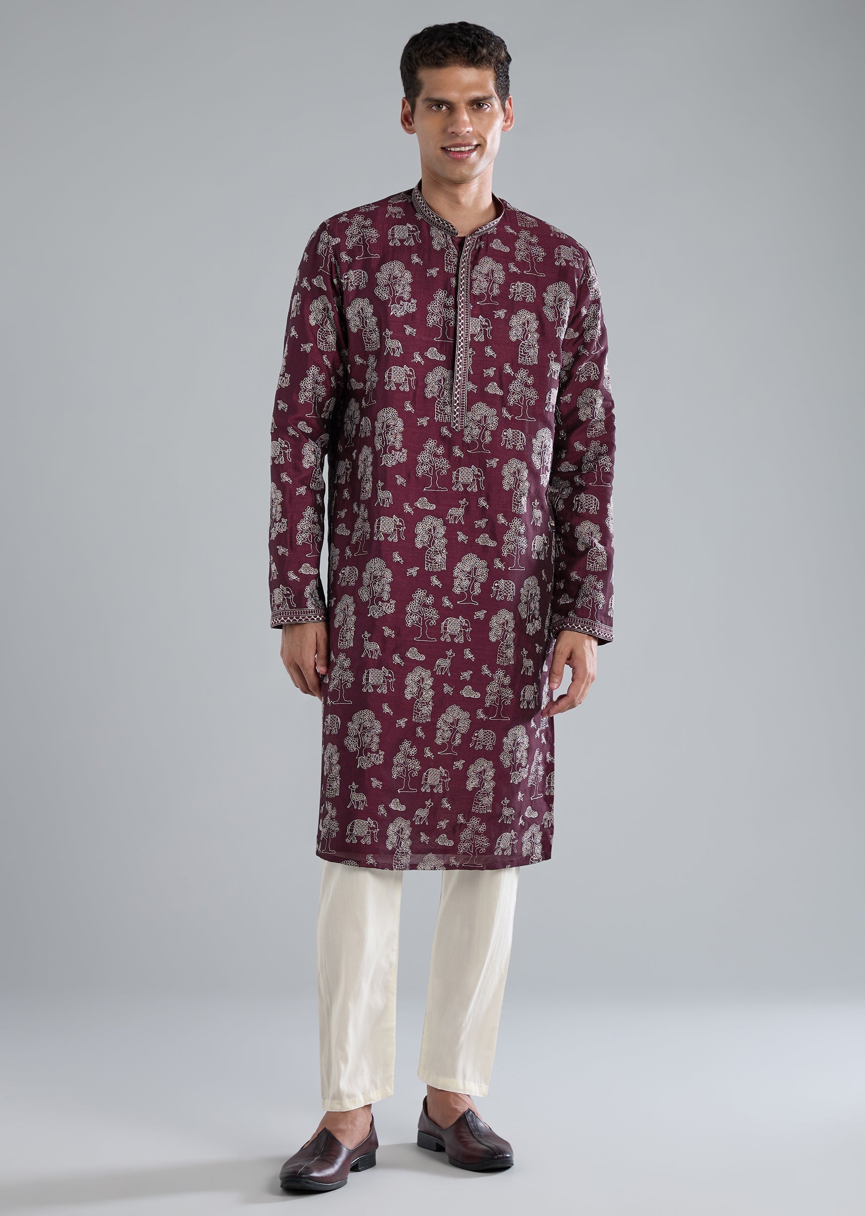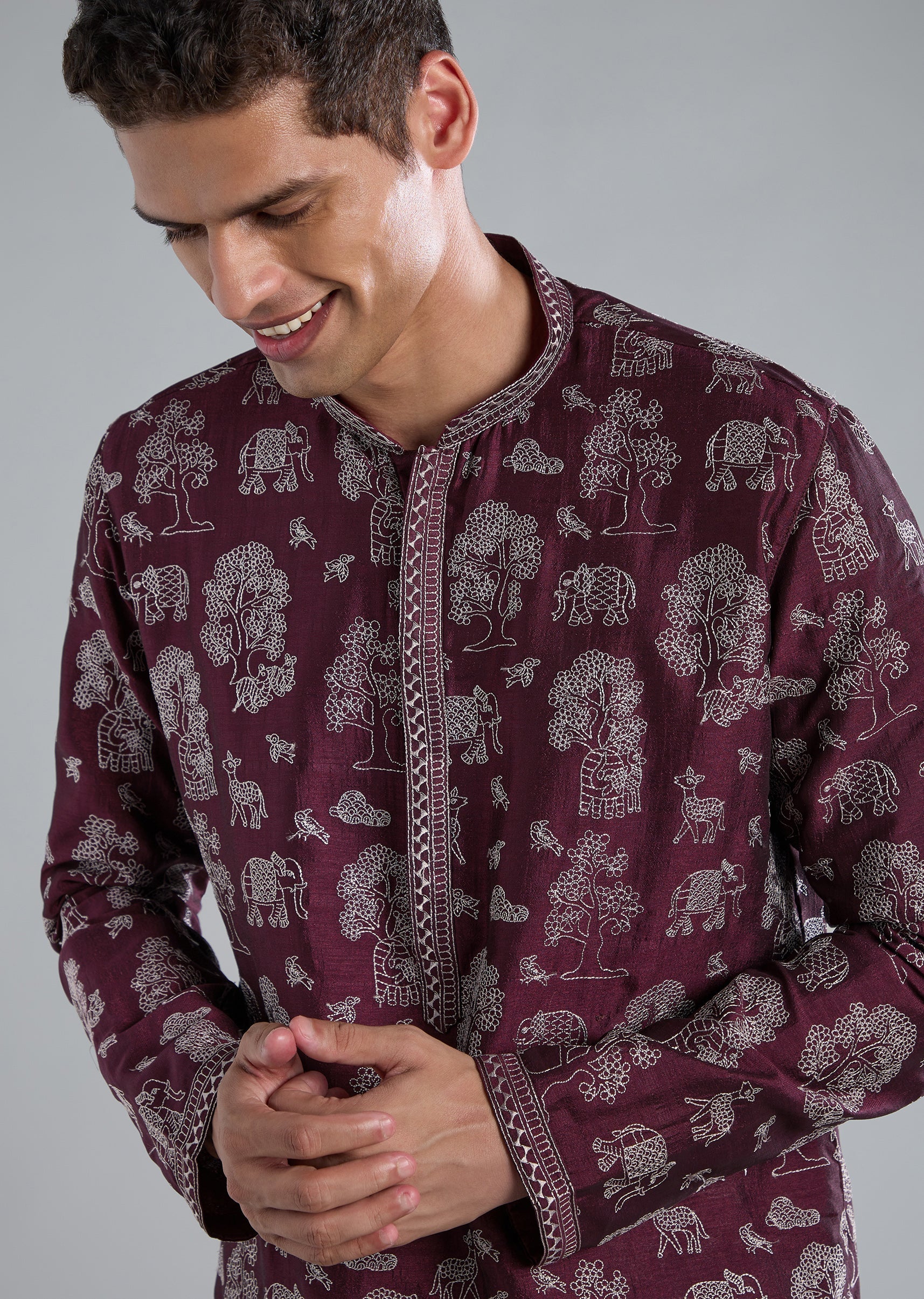Rich and refined, this wine kurta set is crafted in smooth silk fabric and finished with subtle thread and resham detailing. The mandarin collar and full sleeves lend a classic structure, while the front hook eye closure keeps the look clean and polished. Paired with comfortable drawstring pants, this set is perfect for evening festivities, intimate celebrations, or family gatherings. Slight variation in color is possible due to photography. Awarded as the Most Trusted Brand, we're delivering styles you love, just as promised.