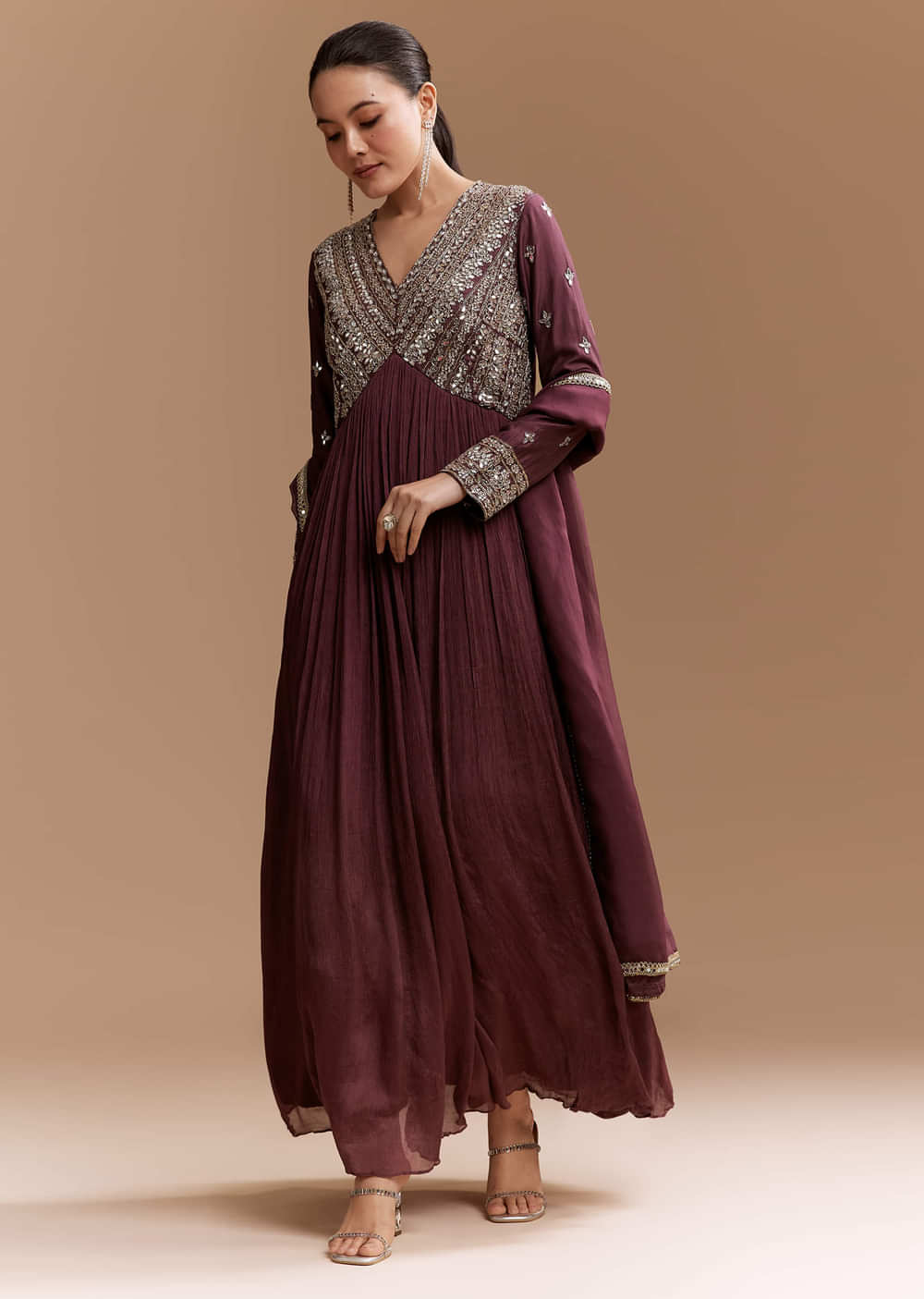 Wine Mirror Embroidered Chinnon Anarkali with Dupatta