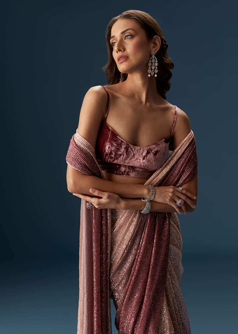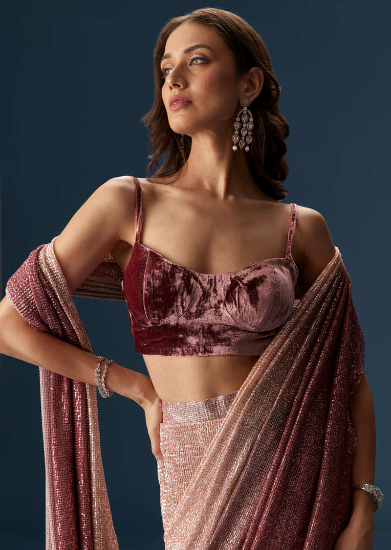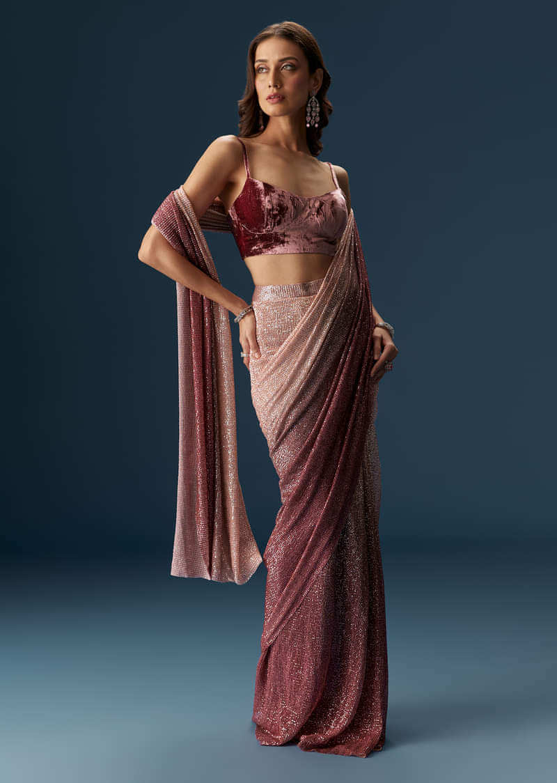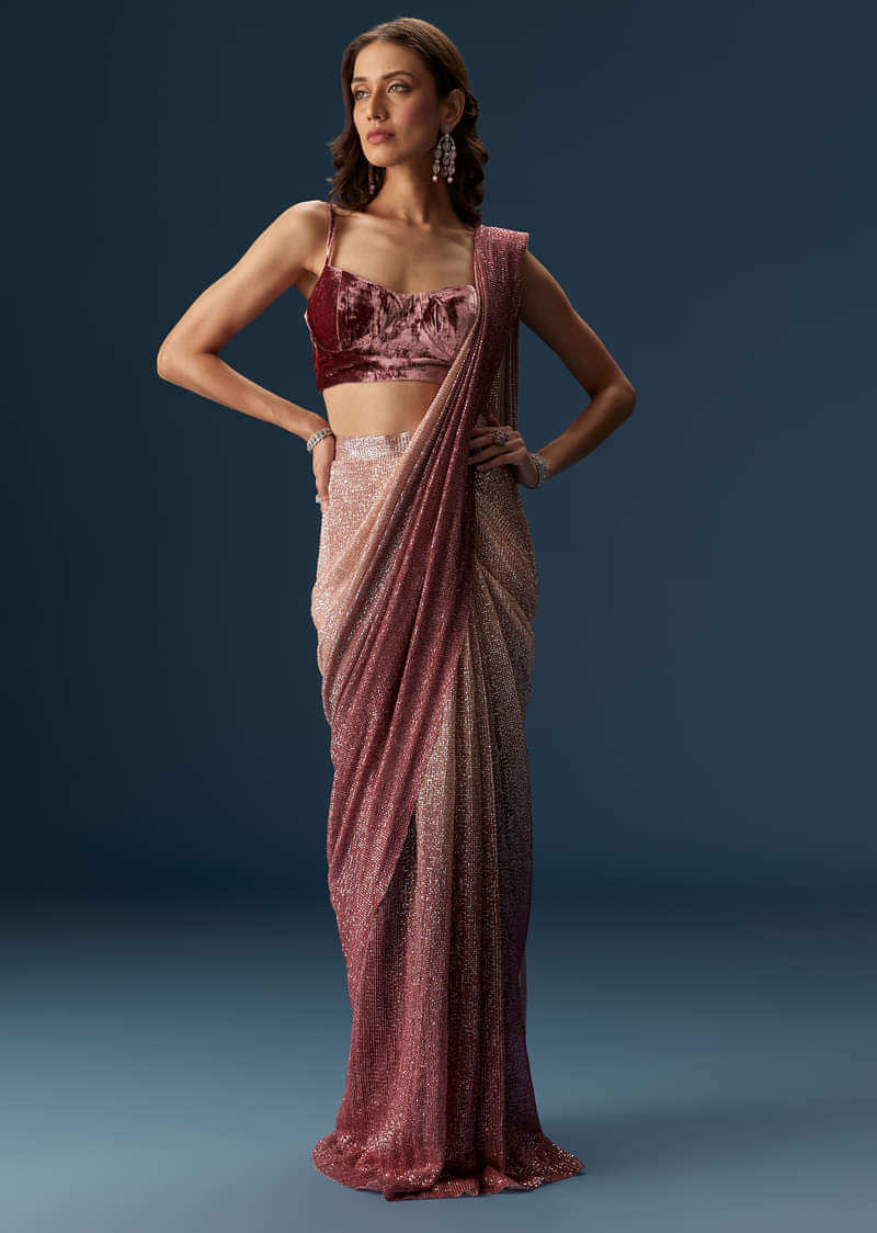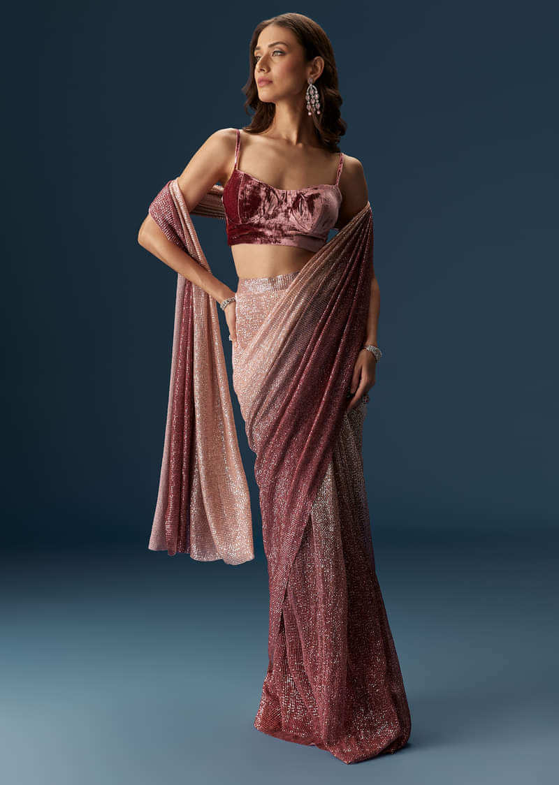 Wine Ombre Pre Pleated Saree With Sequins And Velvet Blouse
