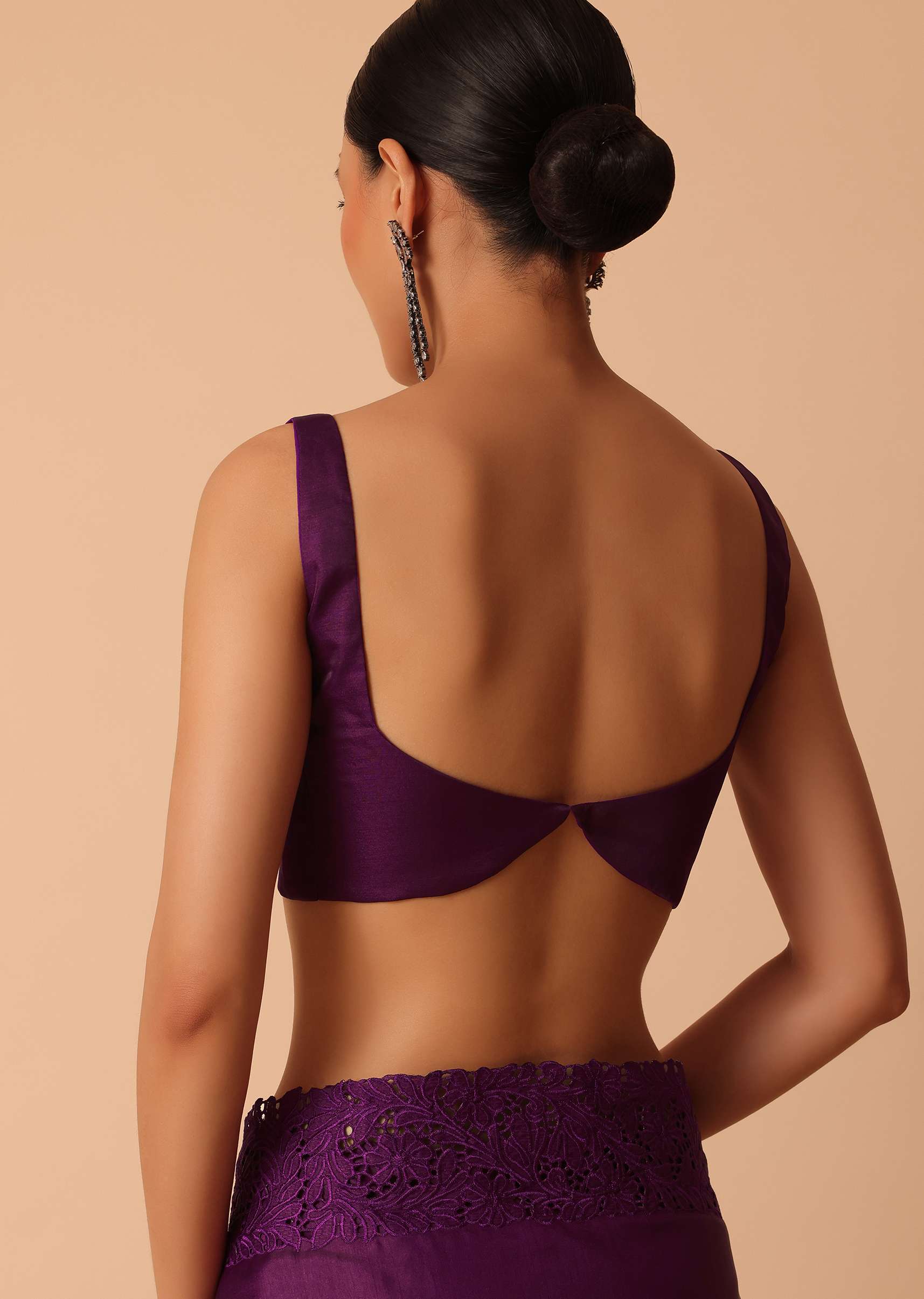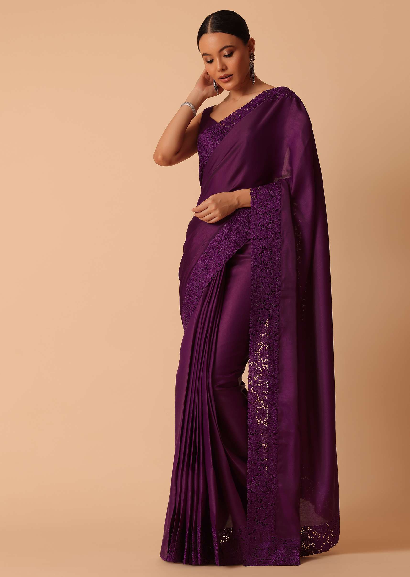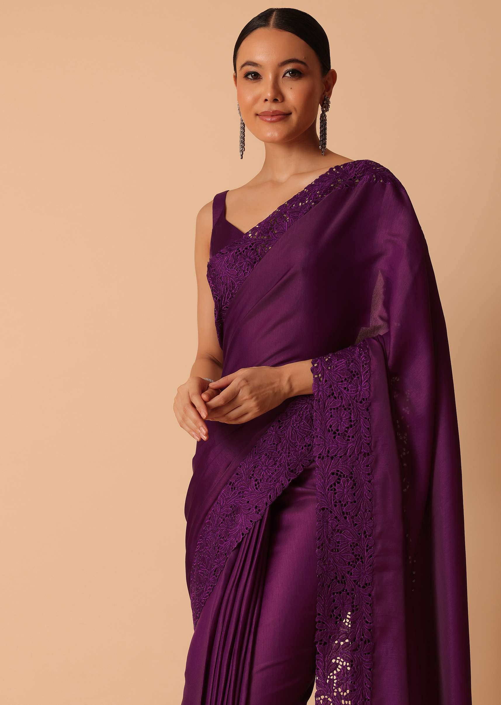Wine Organza Saree With Lace Border And Unstitched Blouse Piece
