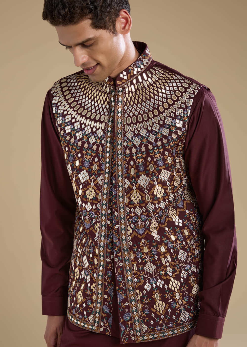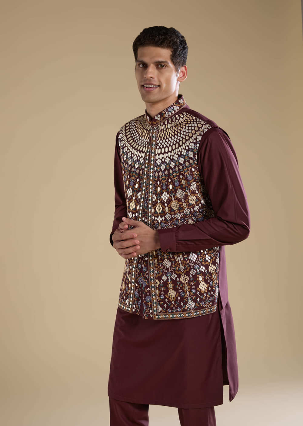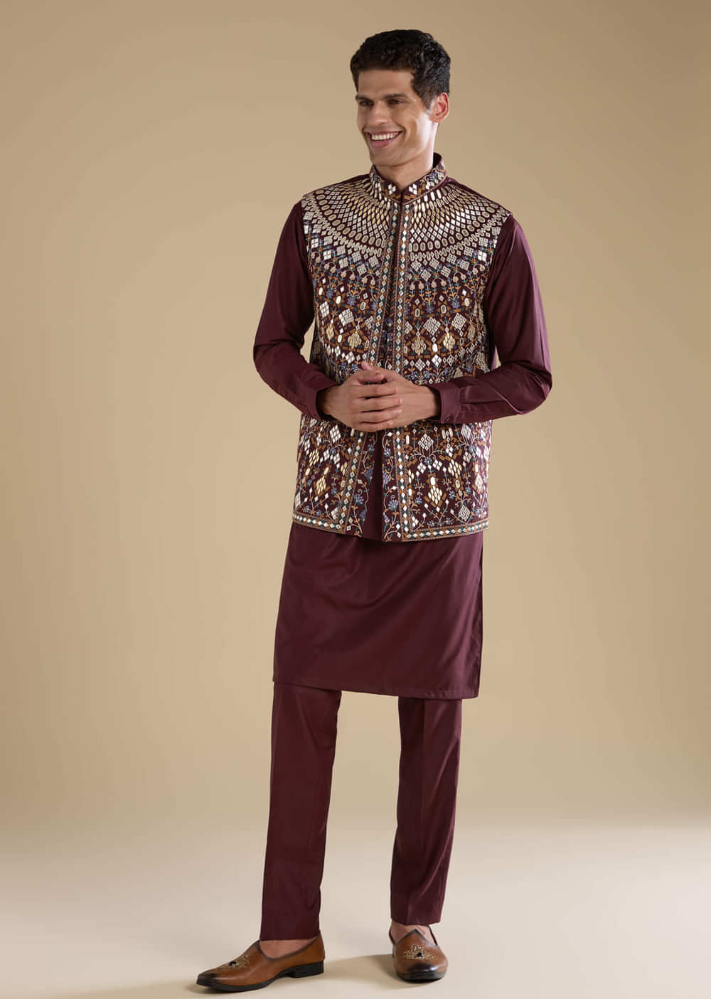 Wine Rayon Jacket Kurta Set with Gotta Work