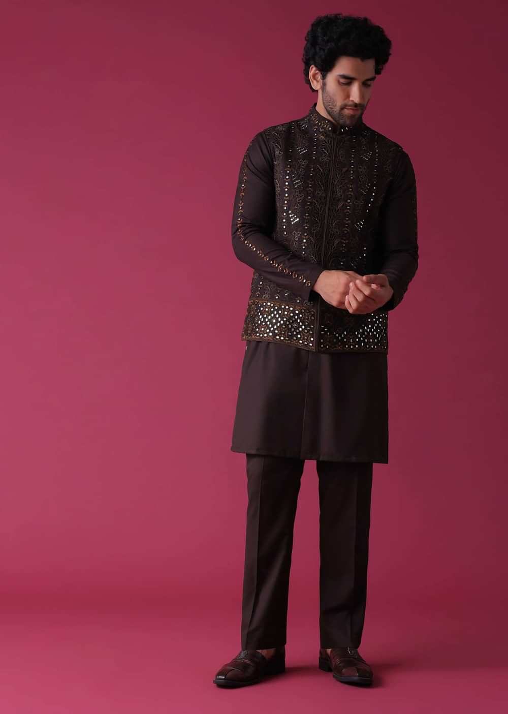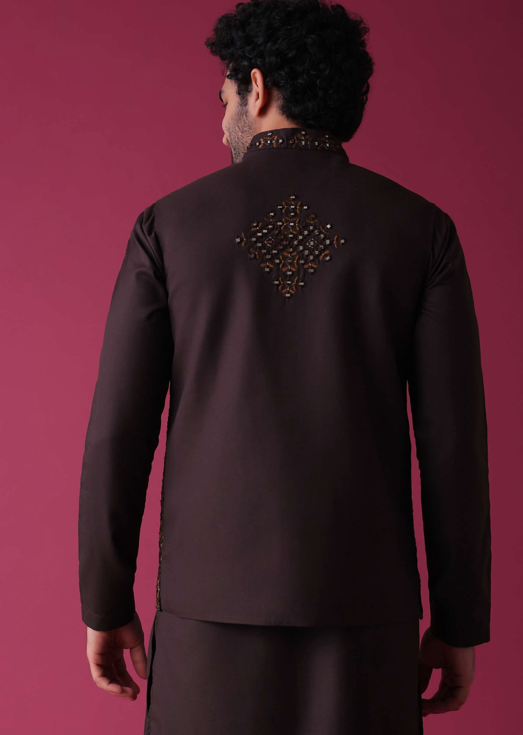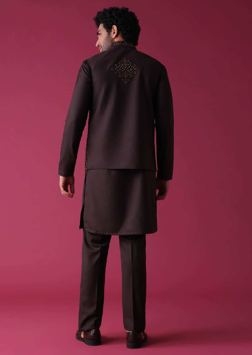 - This stunning wine red jacket kurta set is sure to catch everyone's attention.