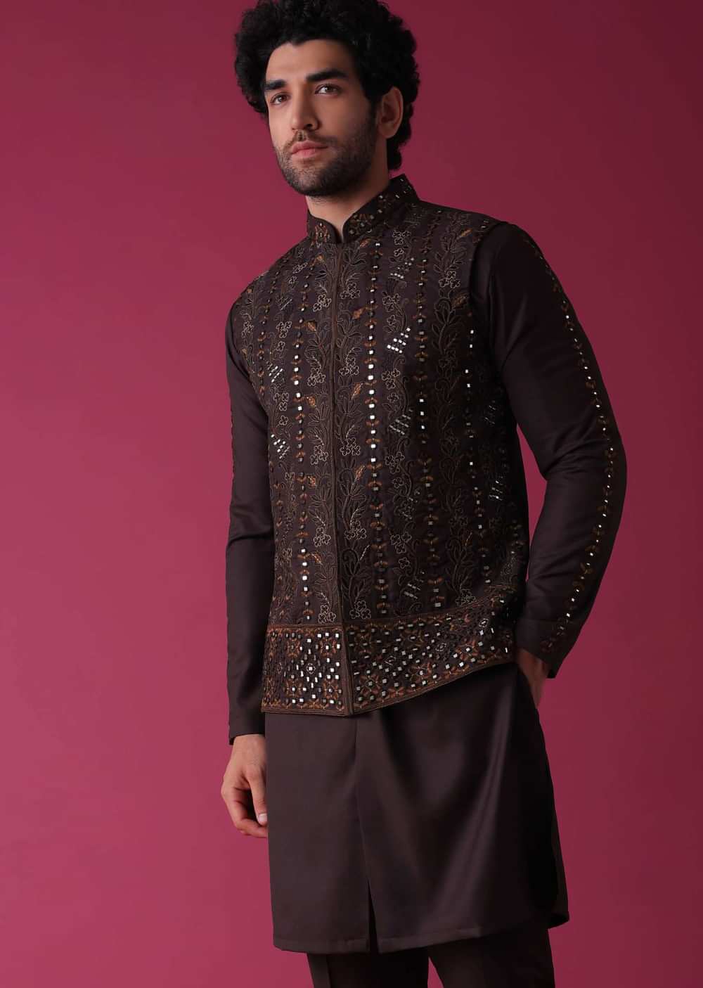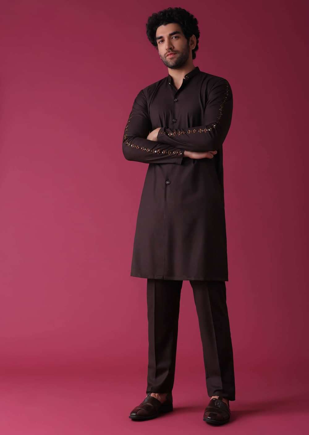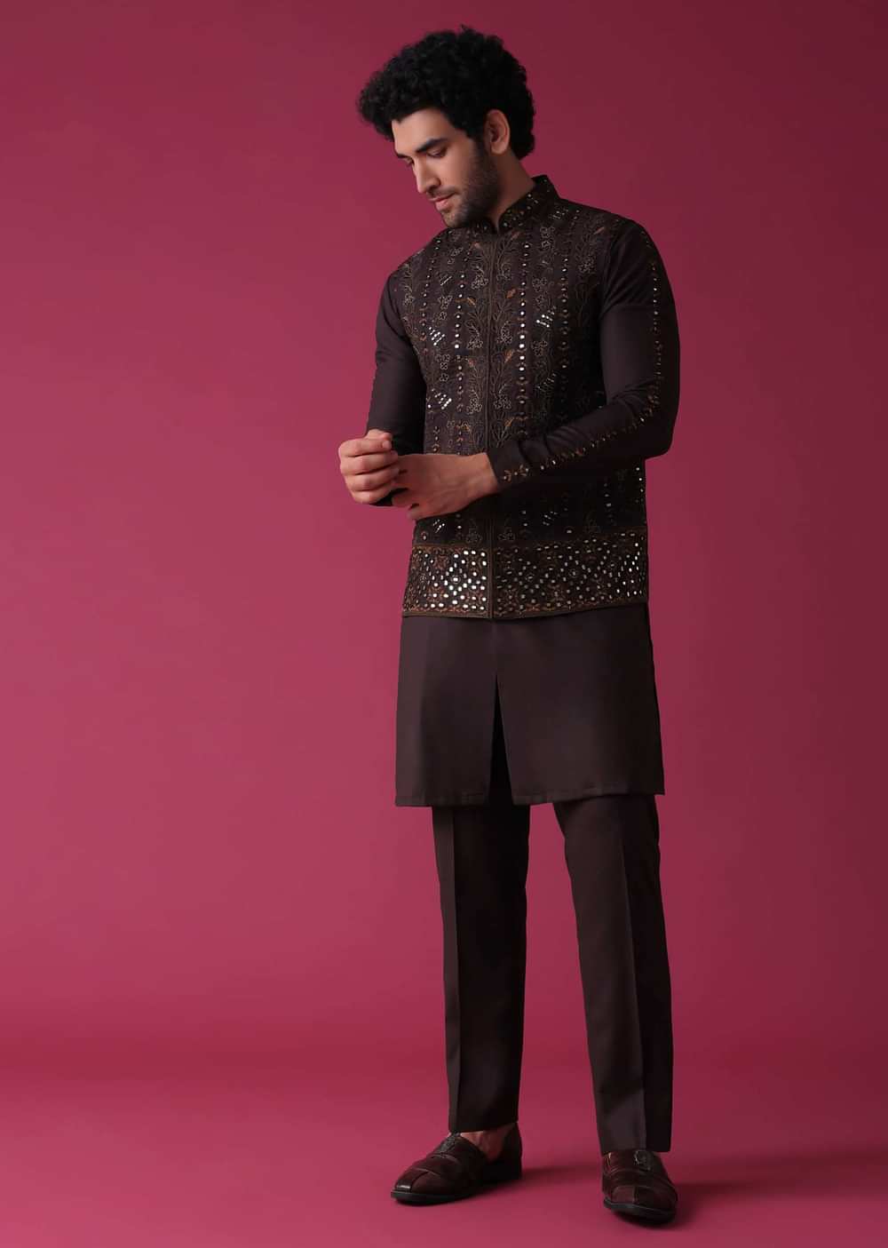 - This stunning wine red jacket kurta set is sure to catch everyone's attention.