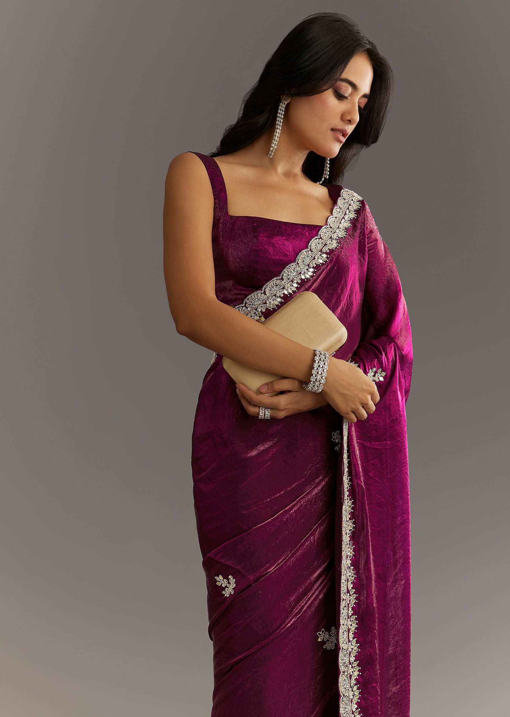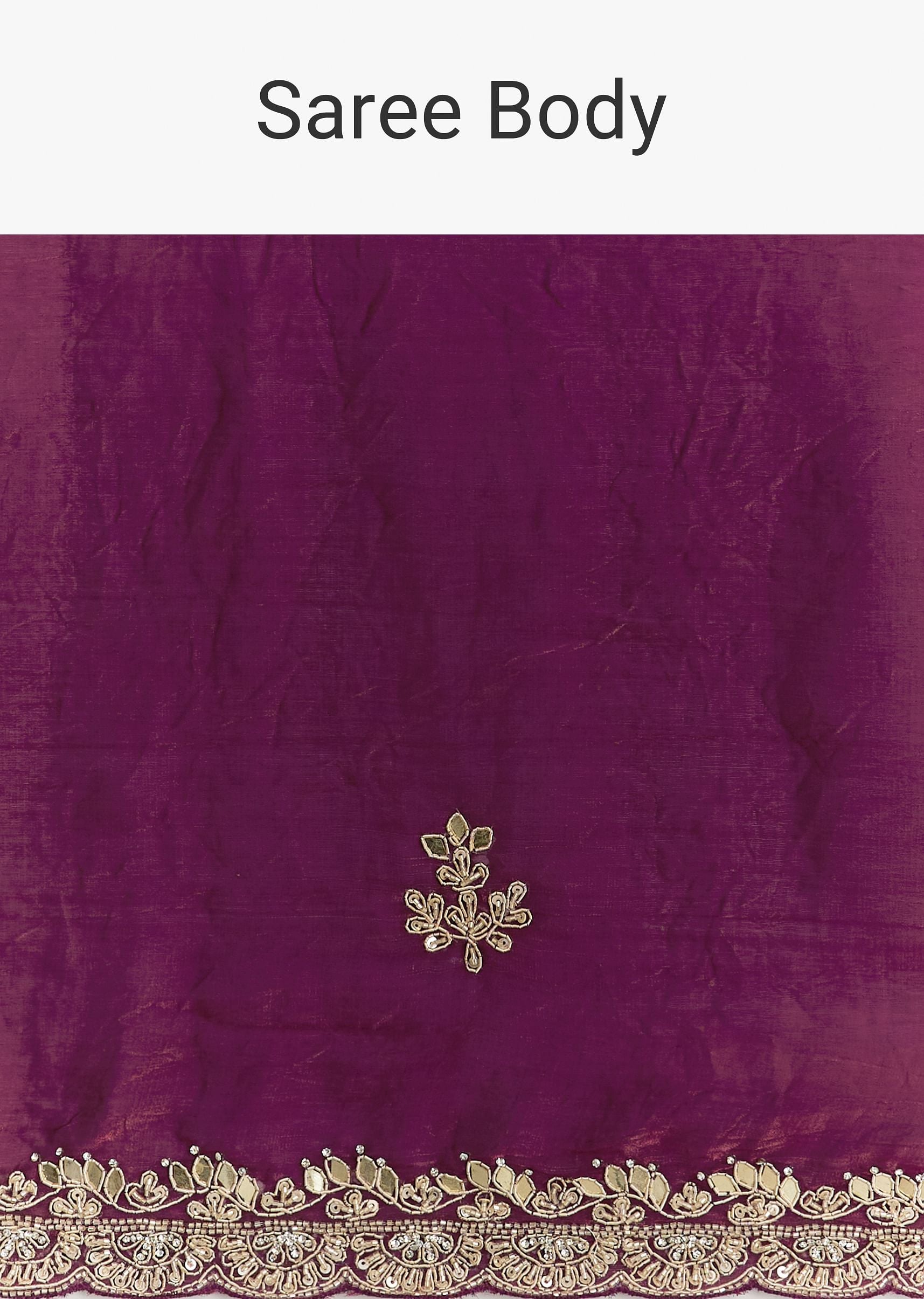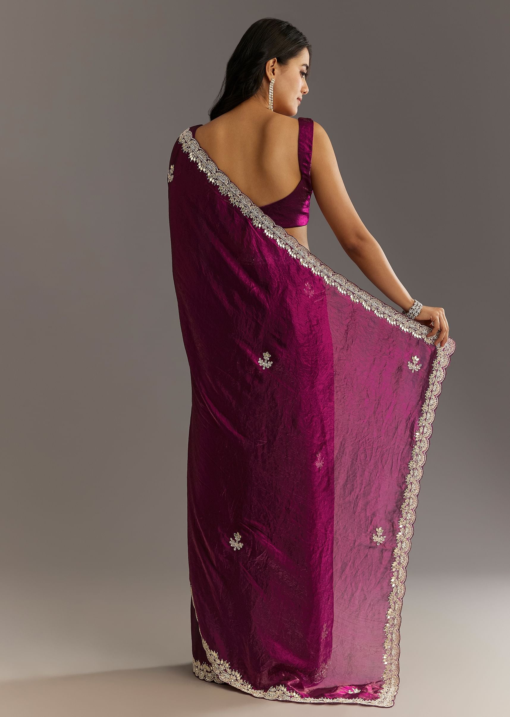 Wine Satin Embroidered Saree With Gota Patti And Zardosi Work
