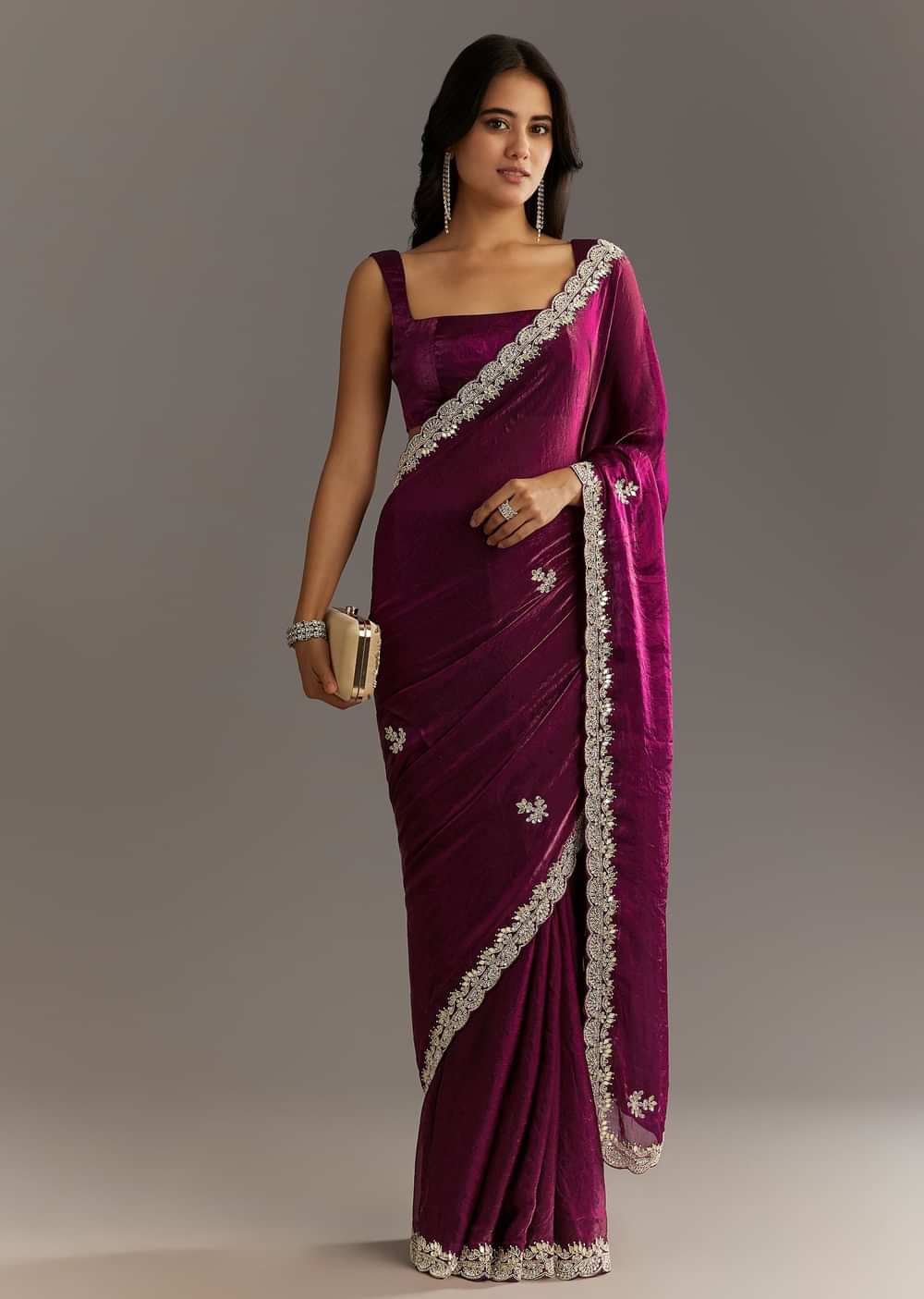 A winetinted enchantment this satin saree glows with zardosi gotapatti and stonecutdana—a tapestry for the bold and beautiful.Awarded as the Most Trusted Brand we're delivering styles you love just as promised.