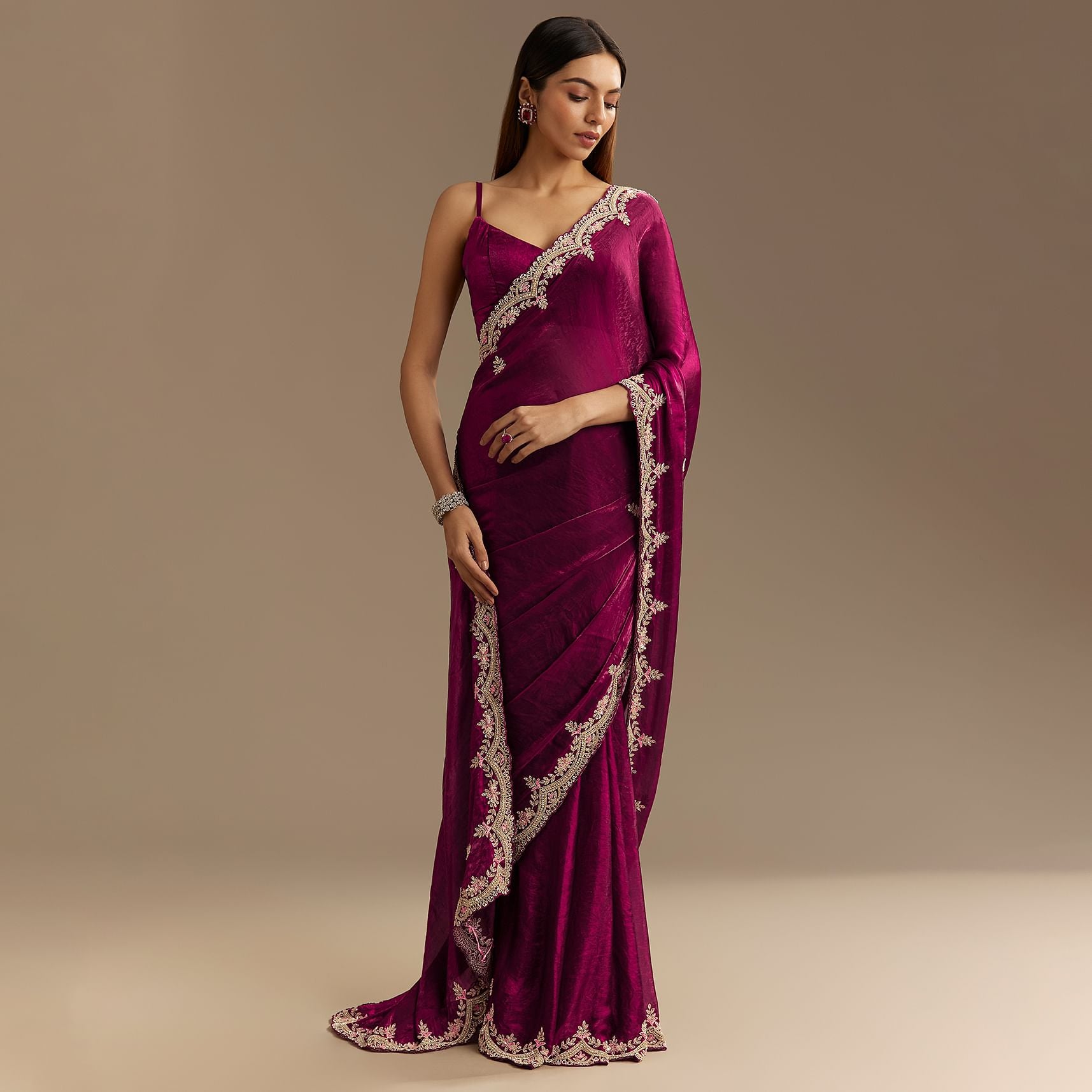 Pair With Statement Gold Or Kundan Jewelry And A Sleek Clutch For An Opulent Look. Opt For A Bold Lip Color And Softly Curled Hair To Complement The Saree’S Regal Appeal.