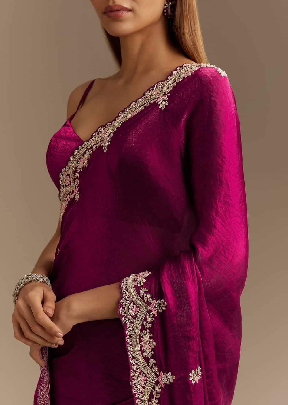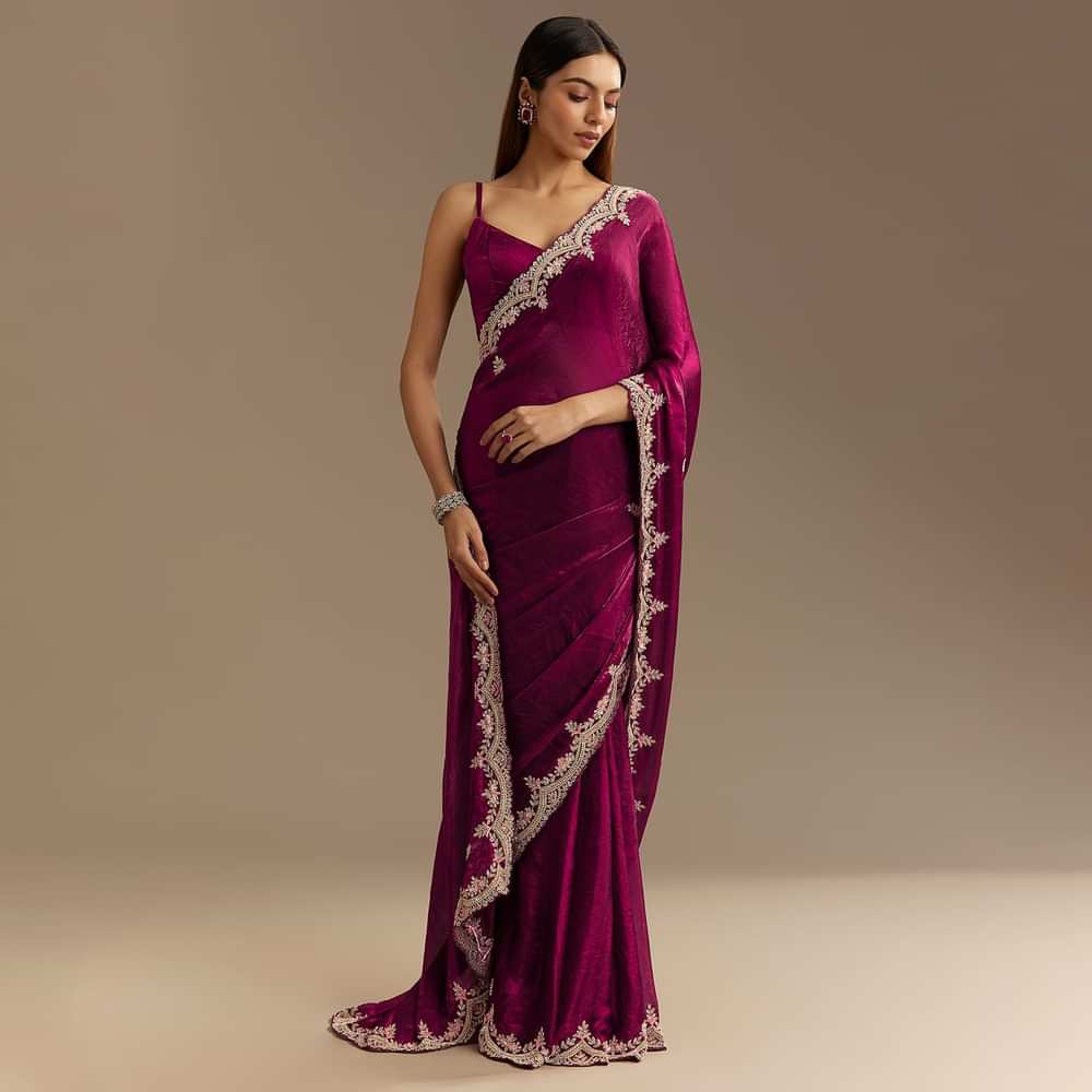Wine Satin Sequins Saree With Zardosi Cutdana Embroidery And Scallop Border