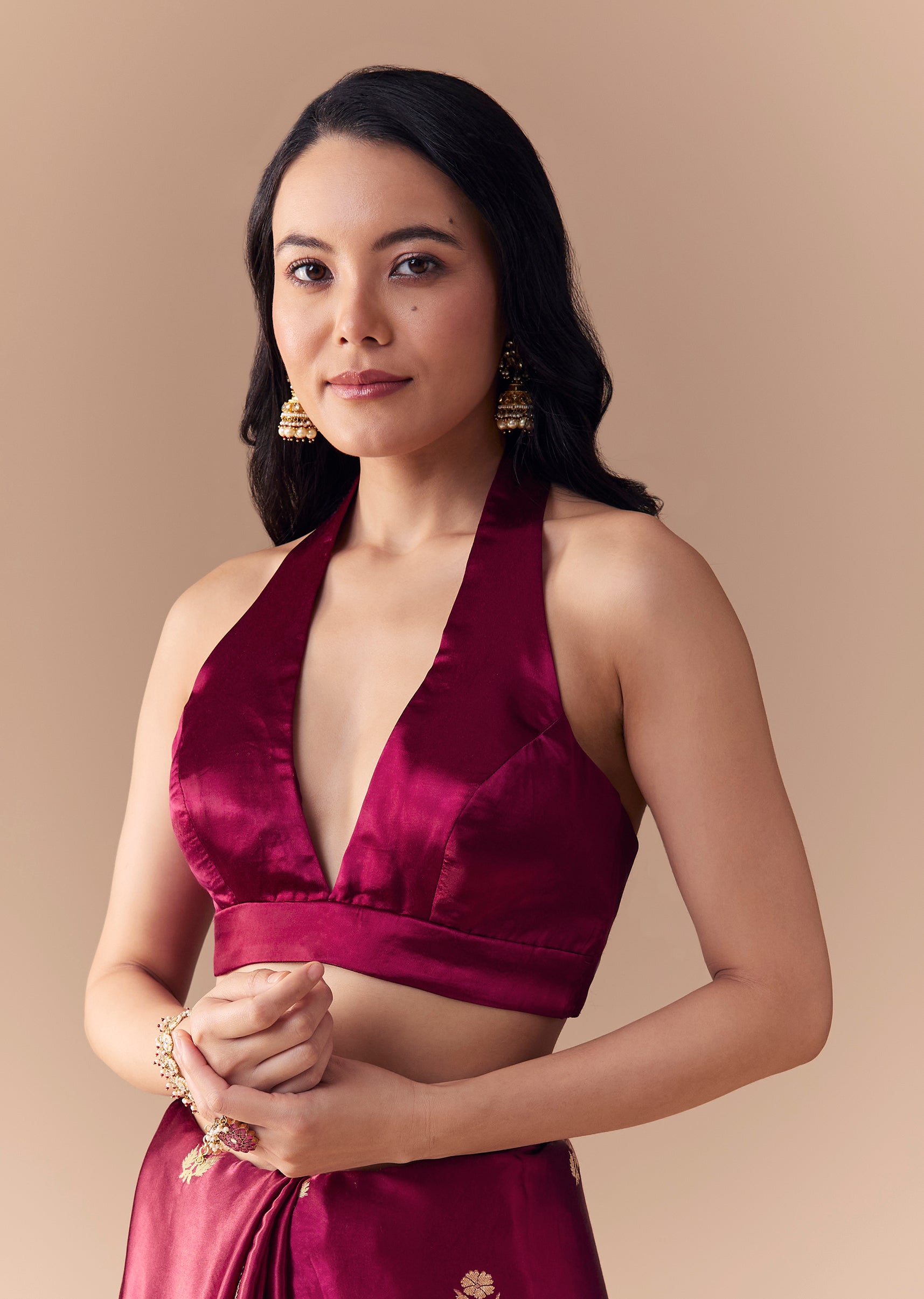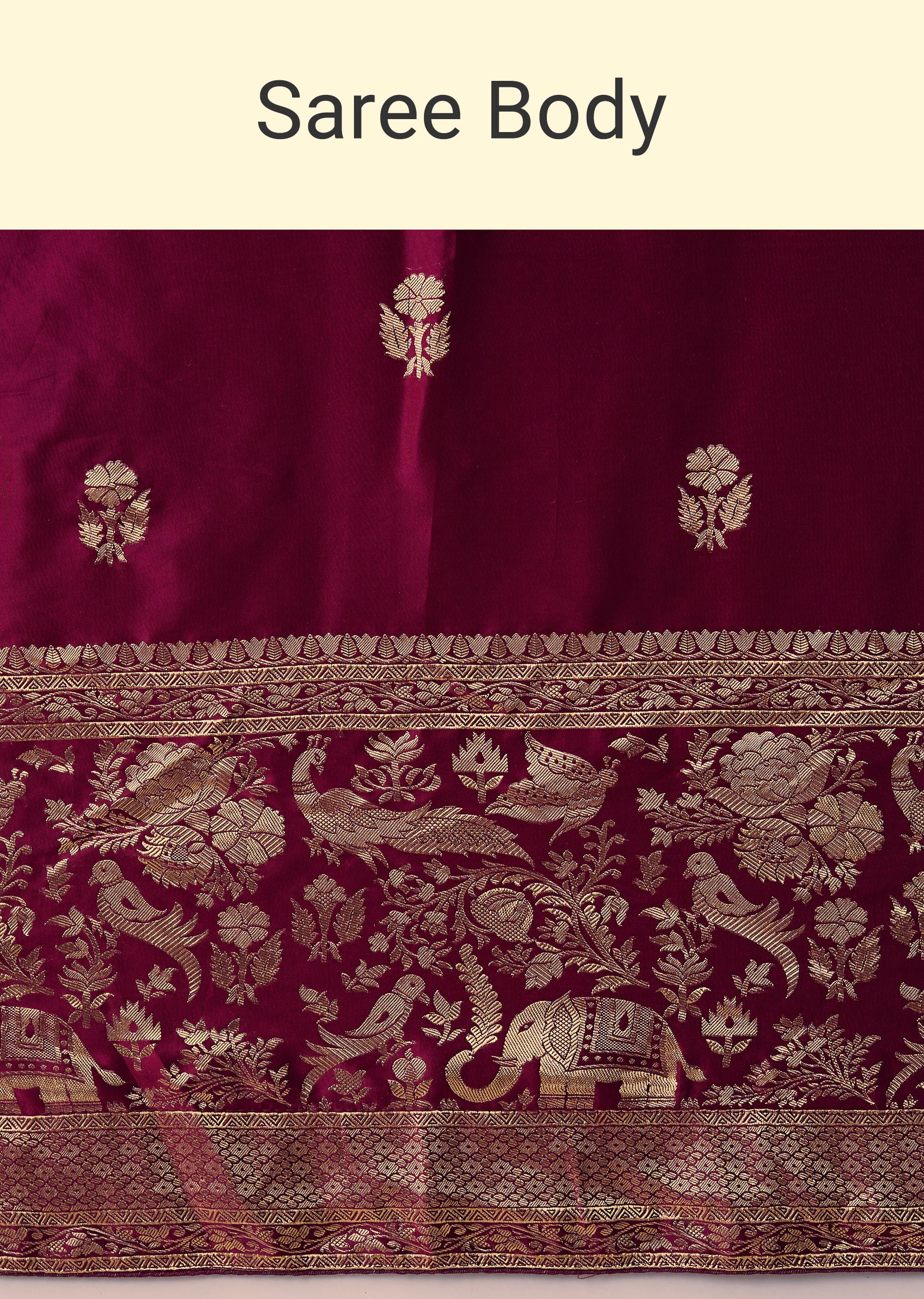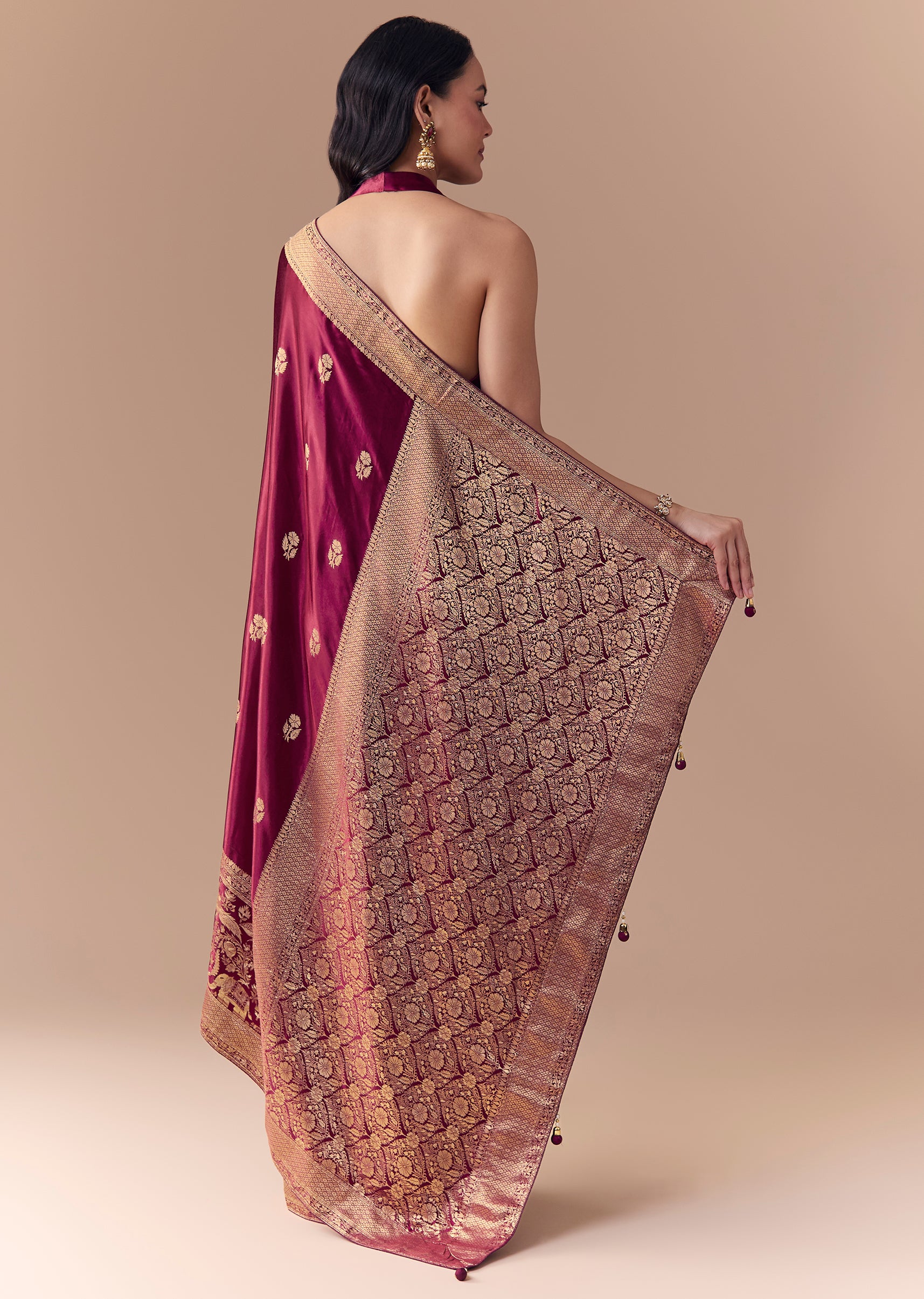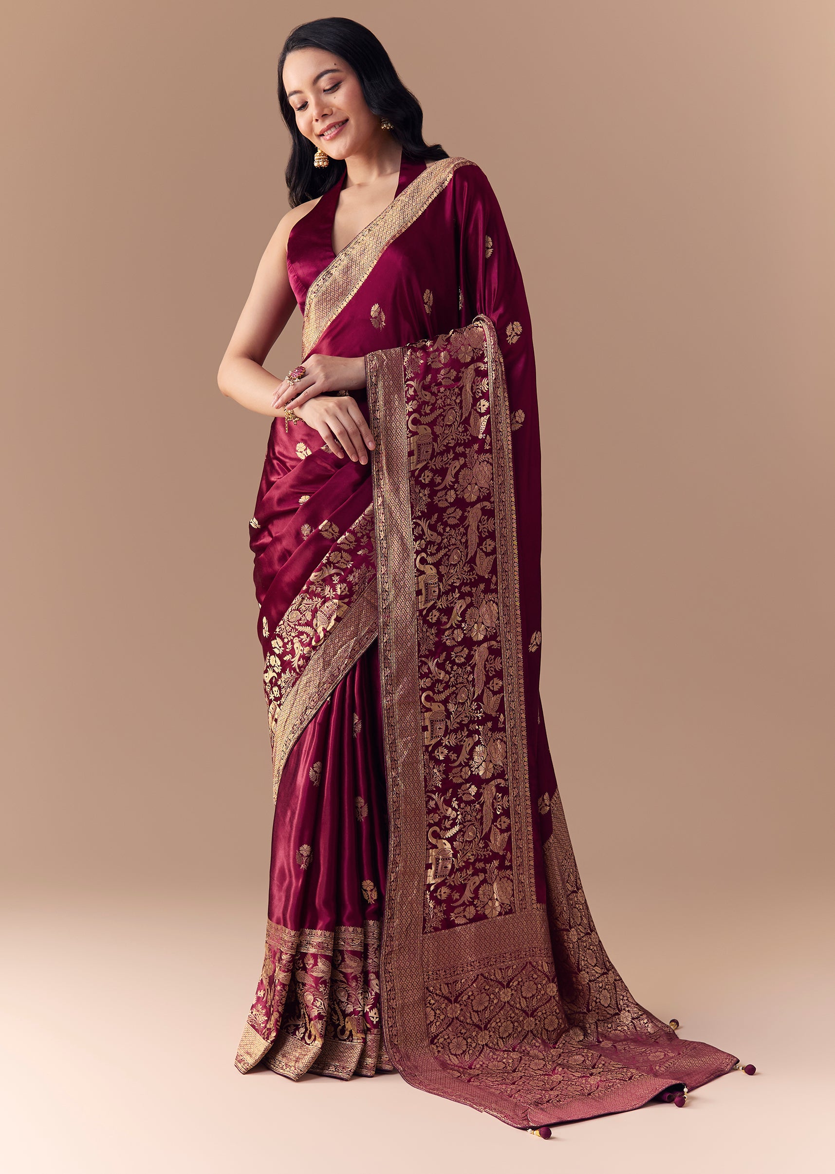 Wine Satin Woven Border Saree with Unstitched Blouse