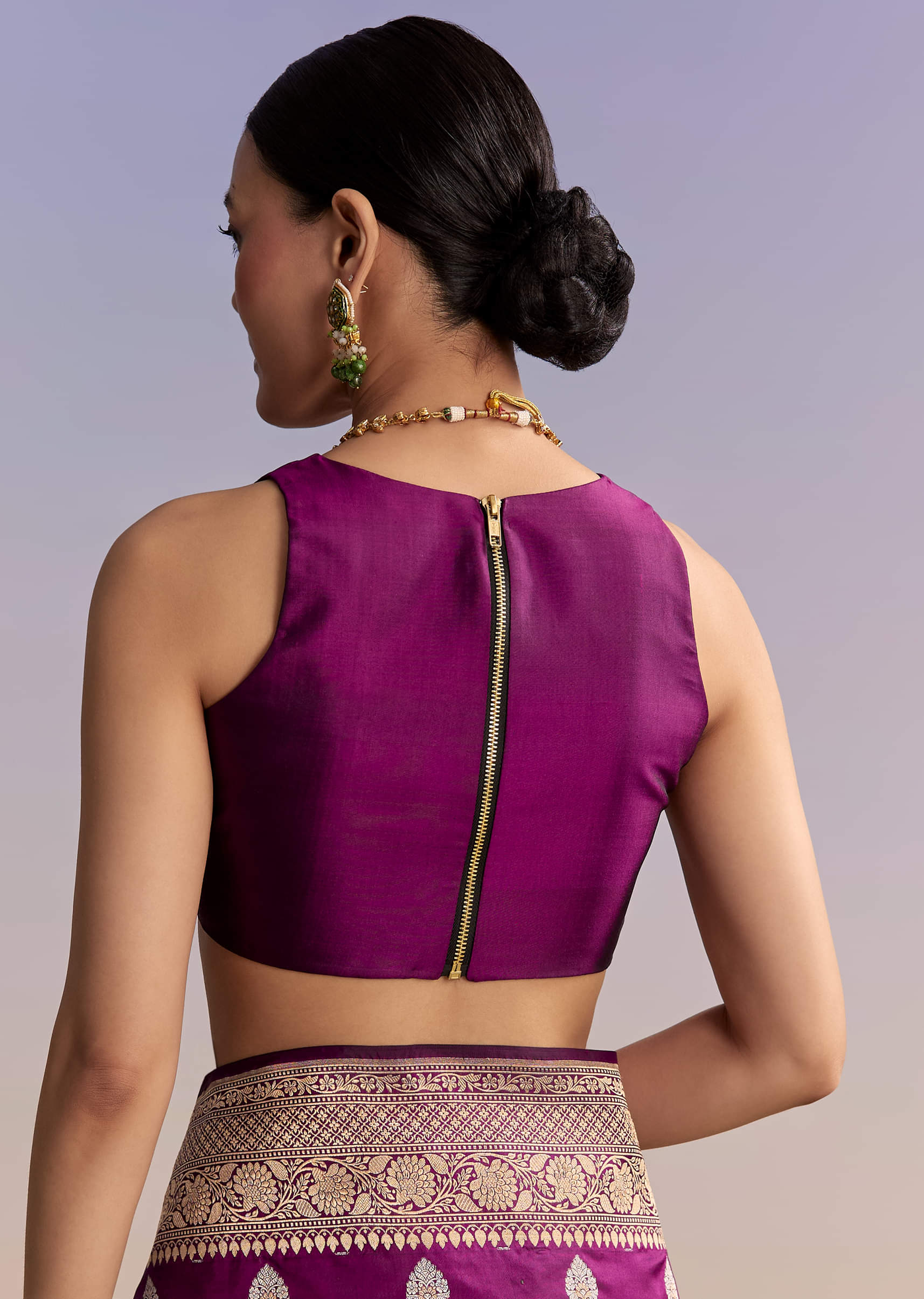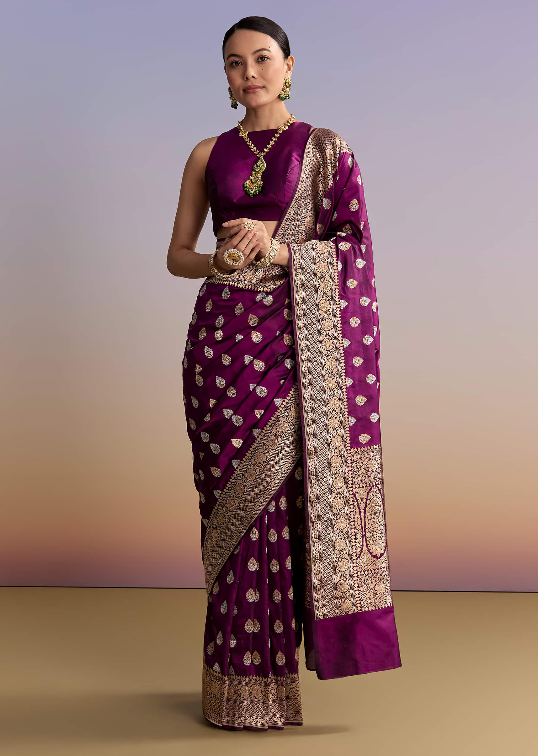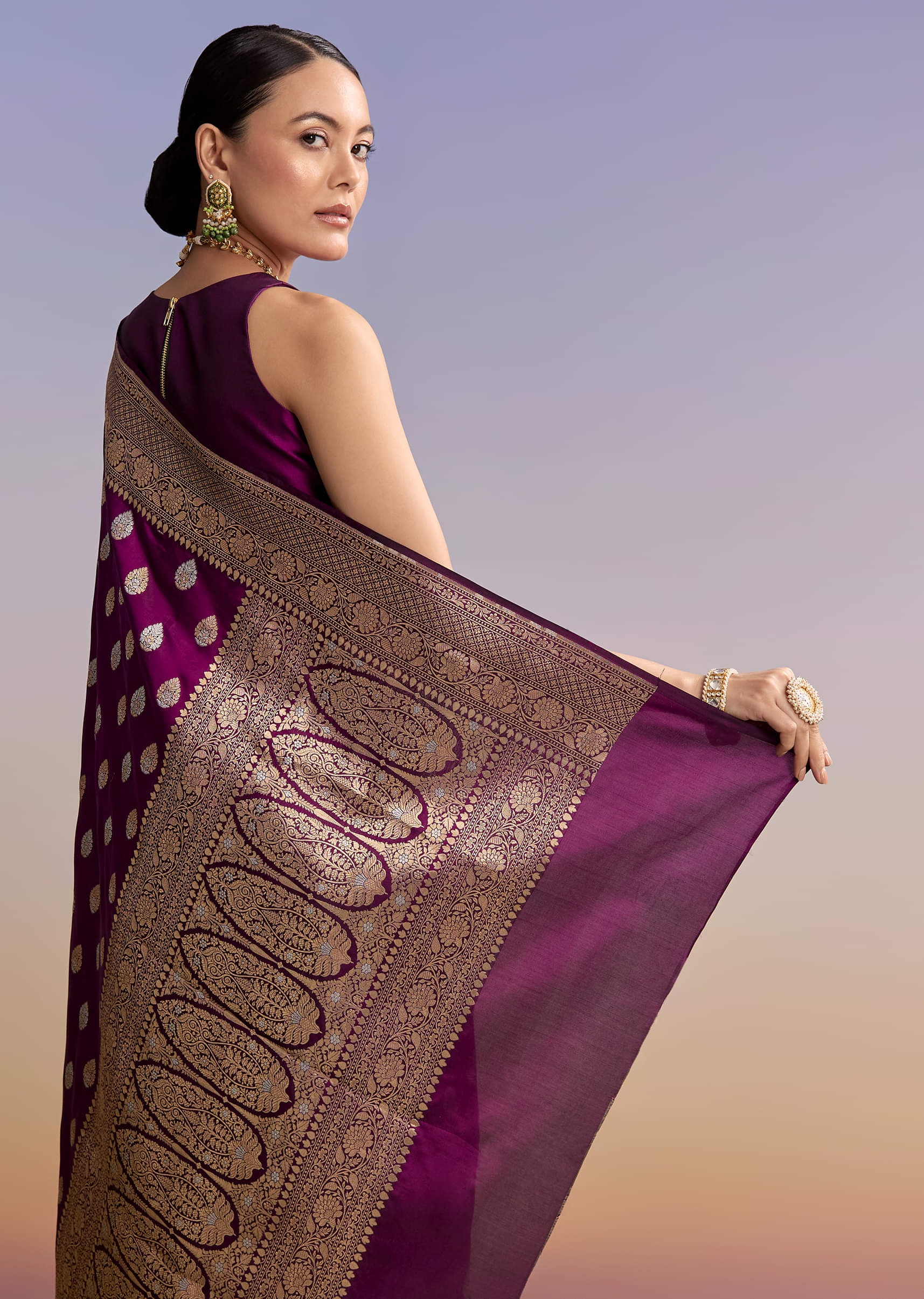 Wine Silk Handwoven Banarasi Saree With Zari Butti