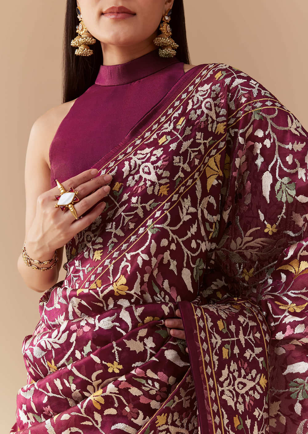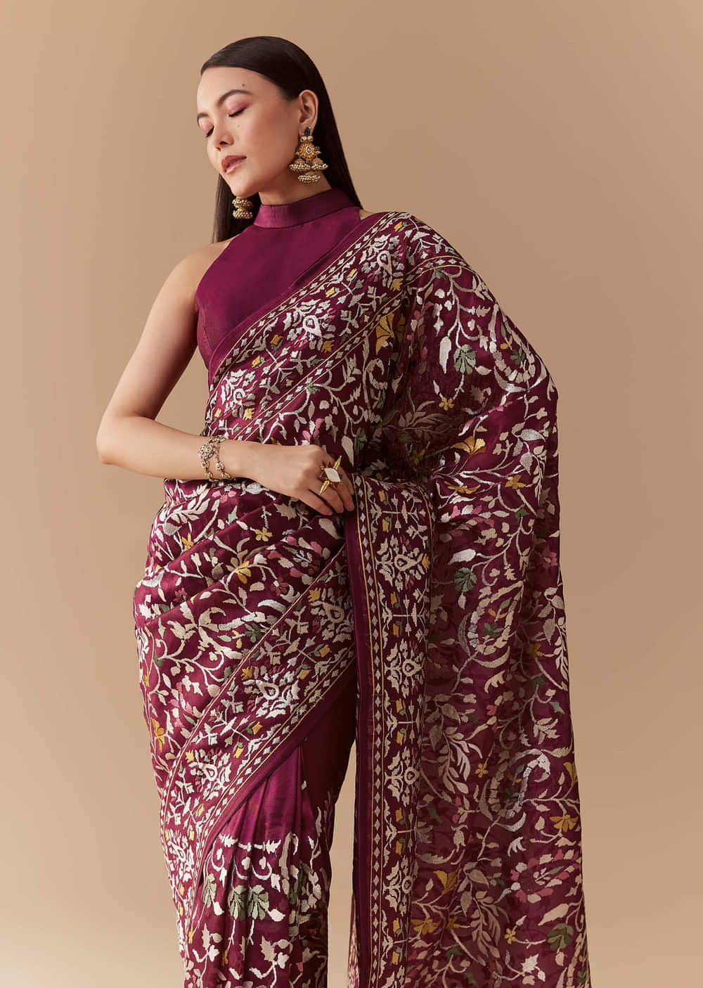 Radiate graceful sophistication with this wine-colored tissue organza saree, beautifully adorned with intricate machine embroidery all over using multicolor resham threads. The sheer, lightweight organza fabric lends an ethereal charm,... More Product Details