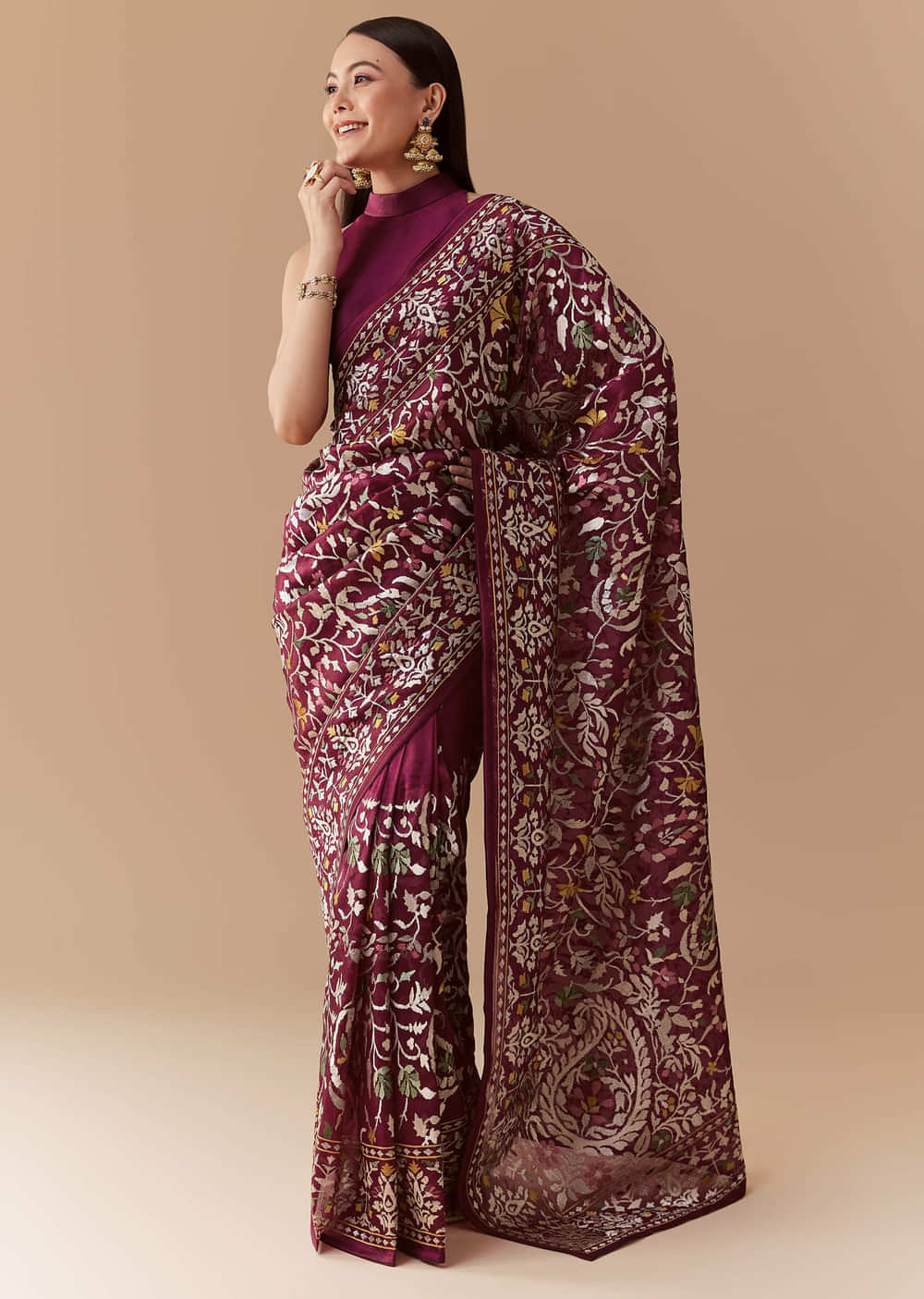 Radiate graceful sophistication with this wine-colored tissue organza saree, beautifully adorned with intricate machine embroidery all over using multicolor resham threads. The sheer, lightweight organza fabric lends an ethereal charm, while the vibrant embroidery adds a touch of artistry and elegance. Perfect for festive occasions, receptions, or daytime celebrations, this saree combines delicate craftsmanship with a modern, refined appeal. Awarded as the Most Trusted Brand, we're delivering styles you love, just as promised.
