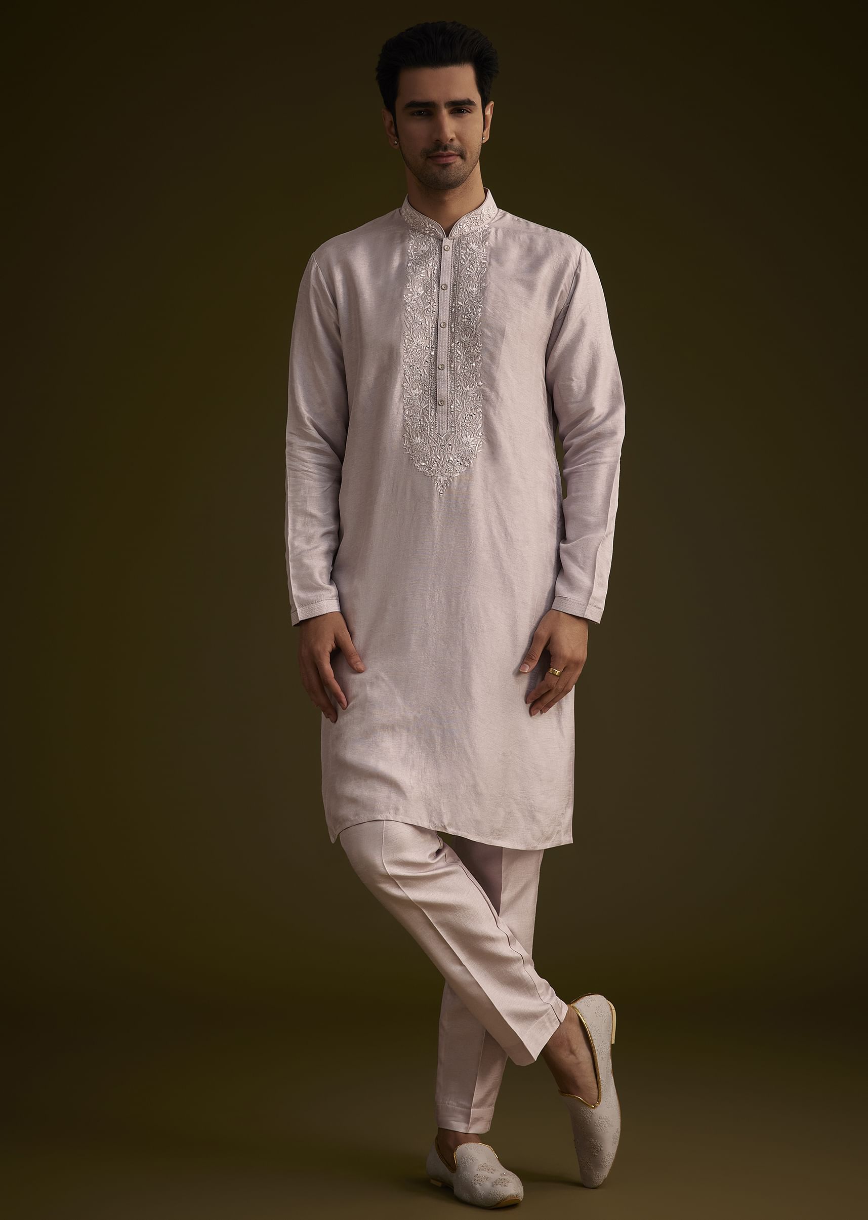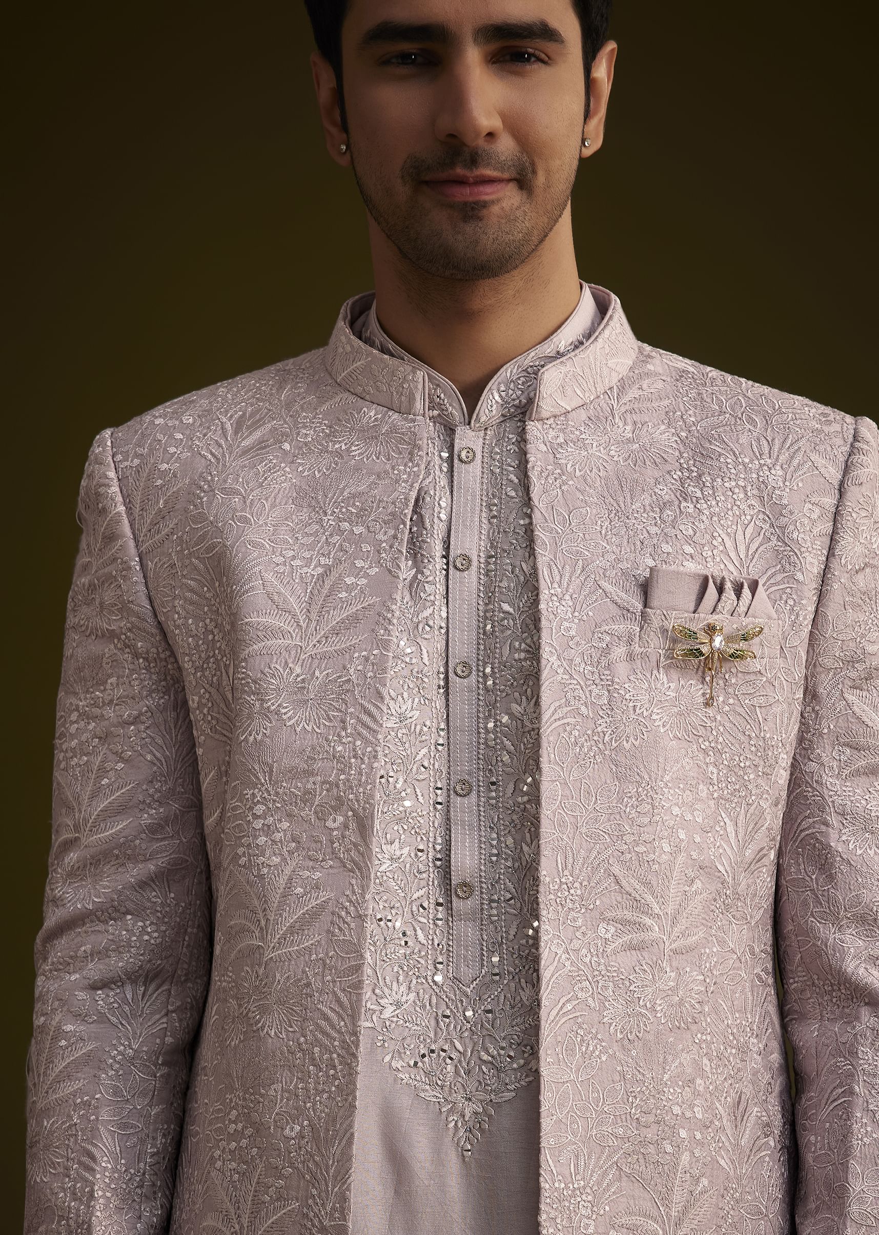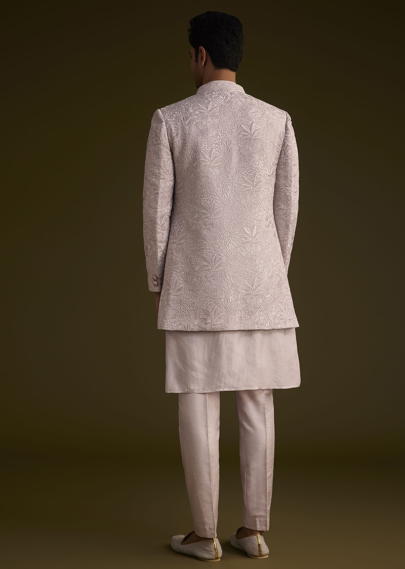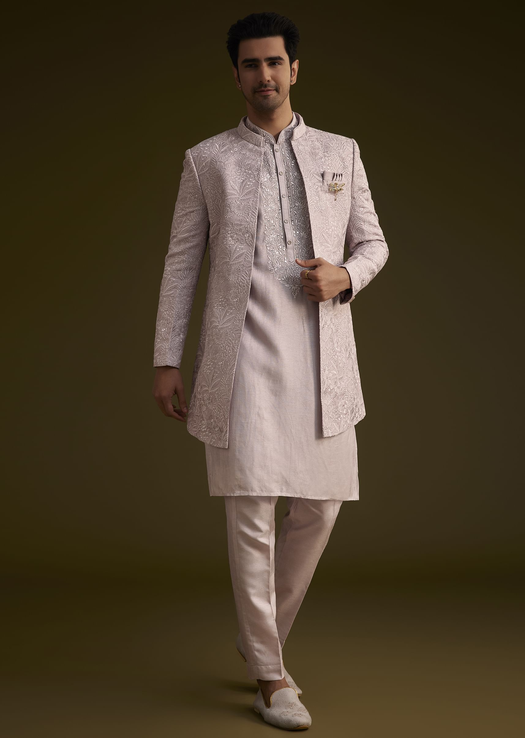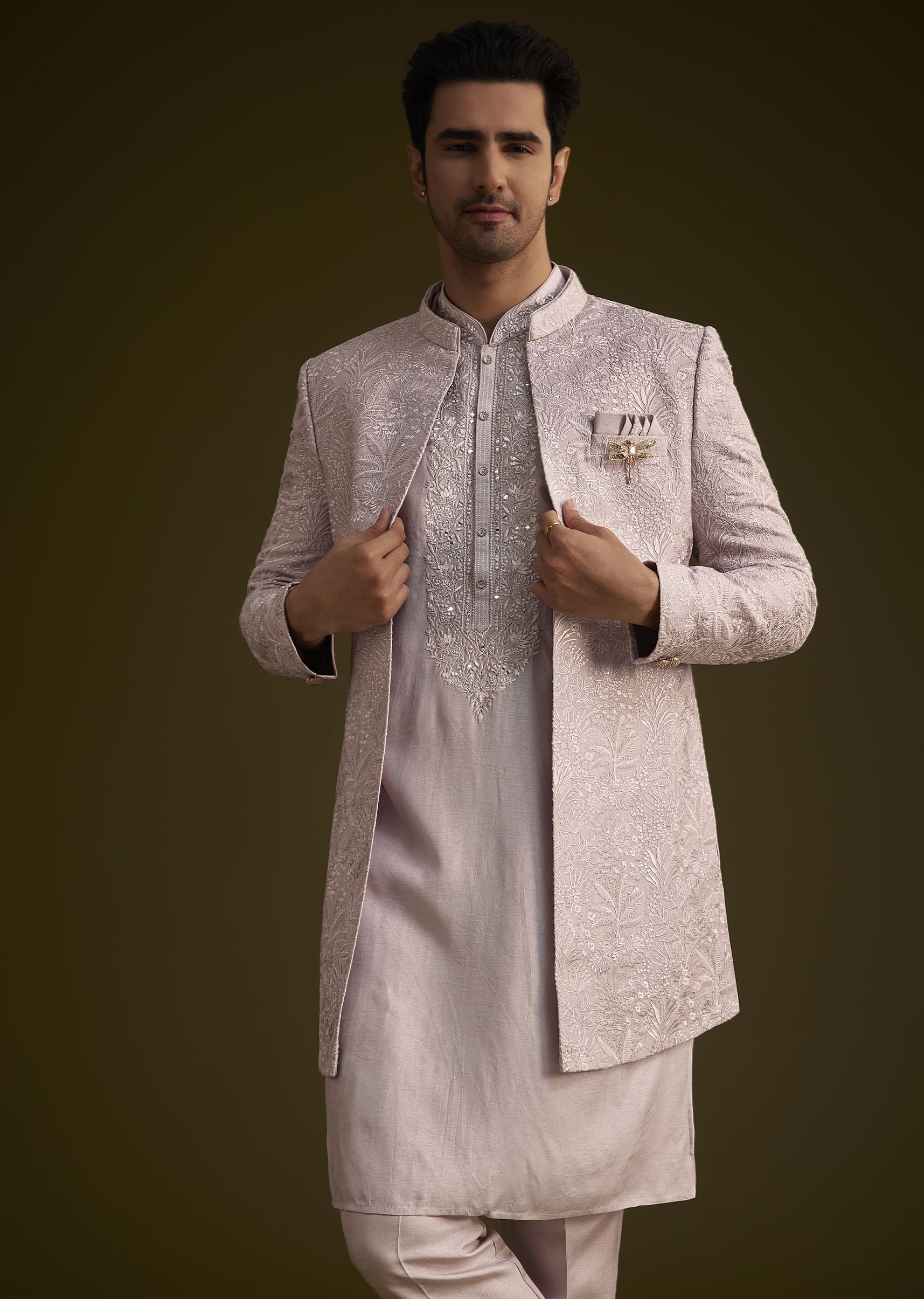 This Wisteria Purple Ensemble Features A Long OpenStyle Sherwani Crafted From Luxurious Dola Silk Intricately Embroidered With Resham Threadwork. Paired With A Matching Kurta And Pant This Outfit Is Perfect... More Product Details