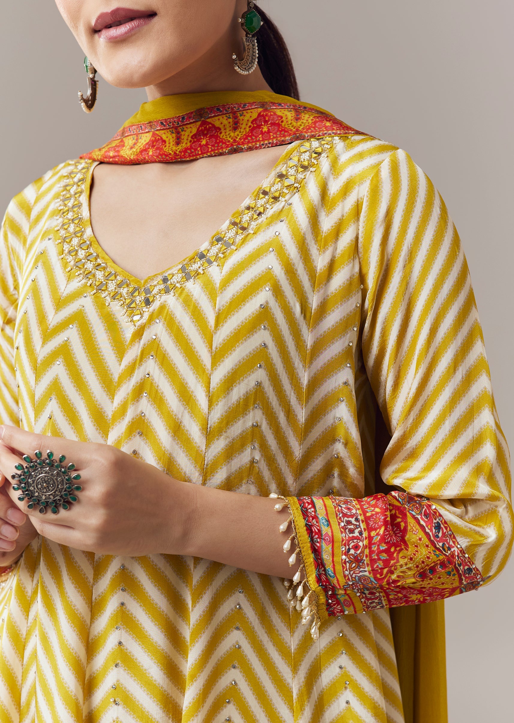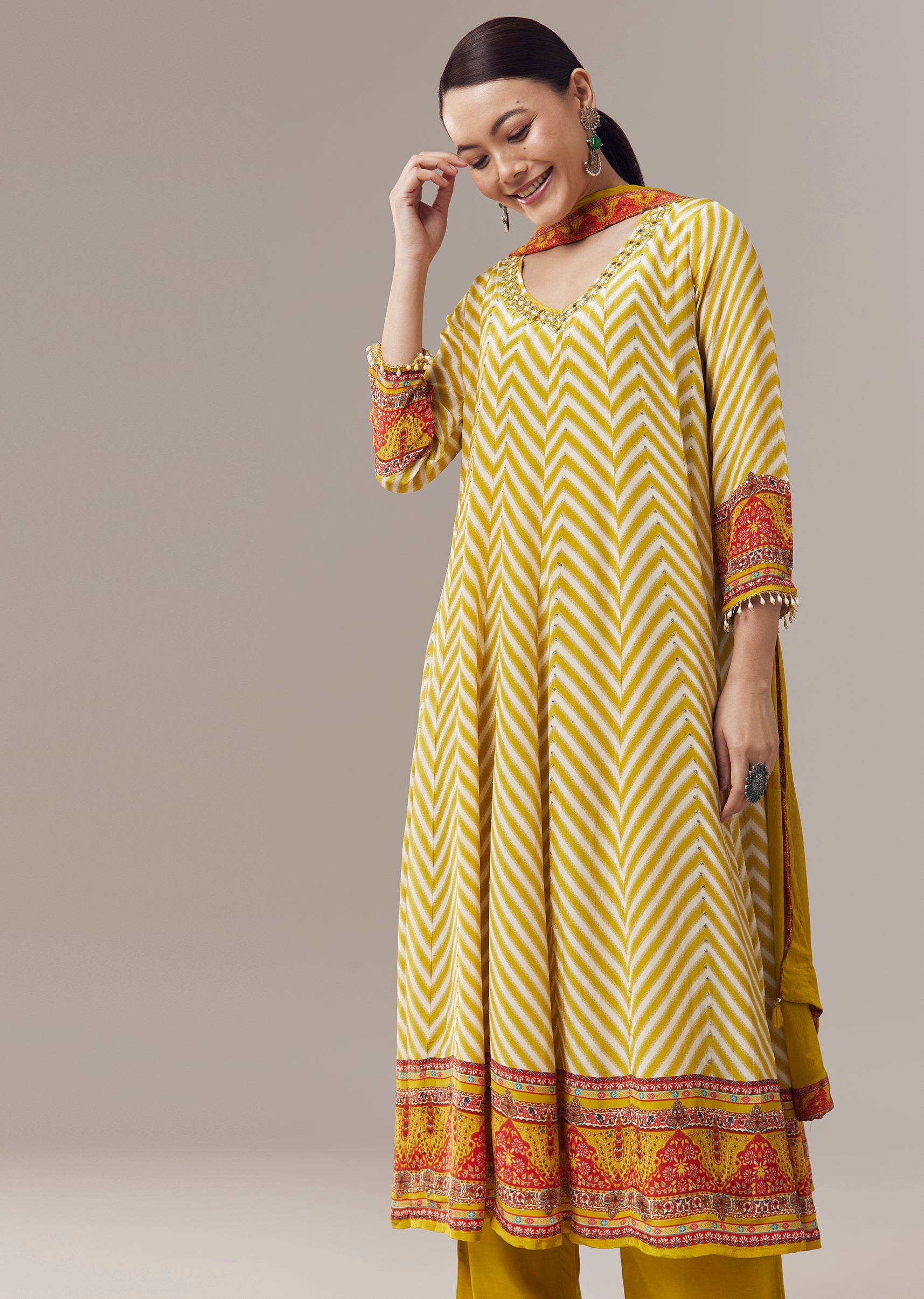 Yellow Anarkali Suit In Chevron Print With Mirror Moti And Stone Work And Dupatta