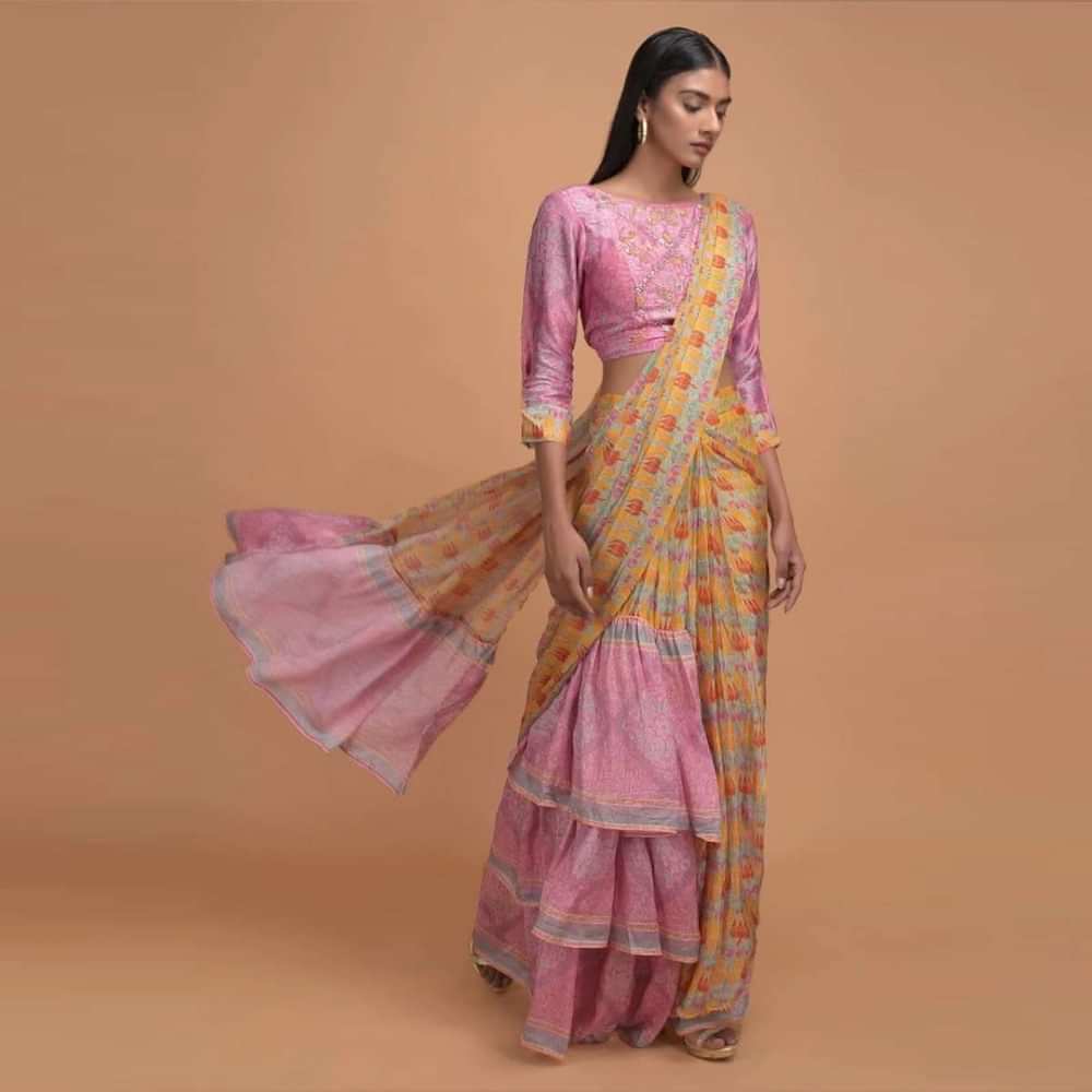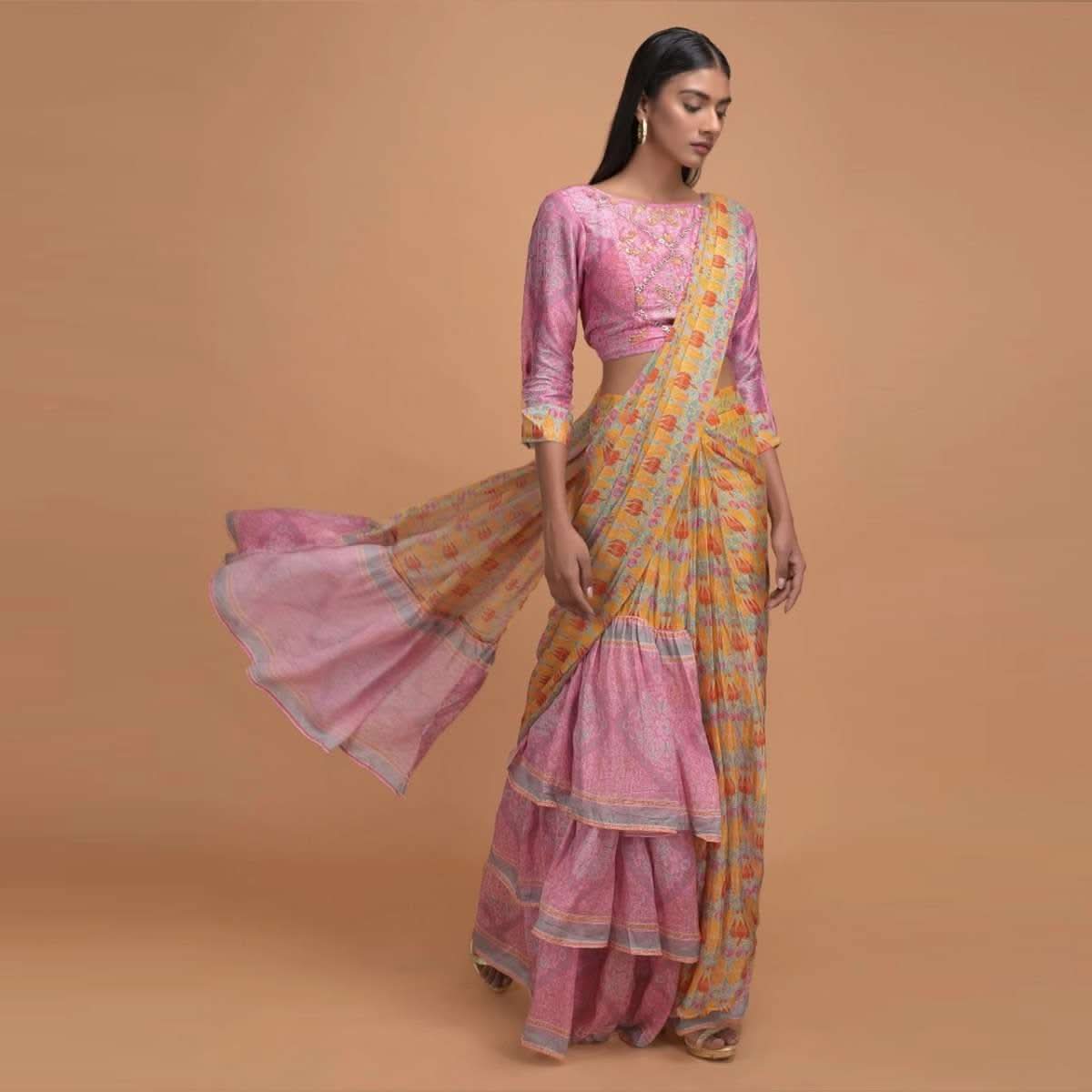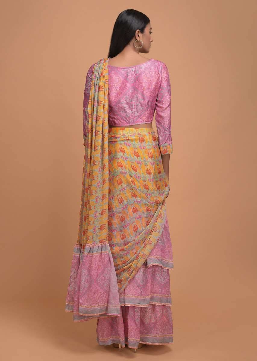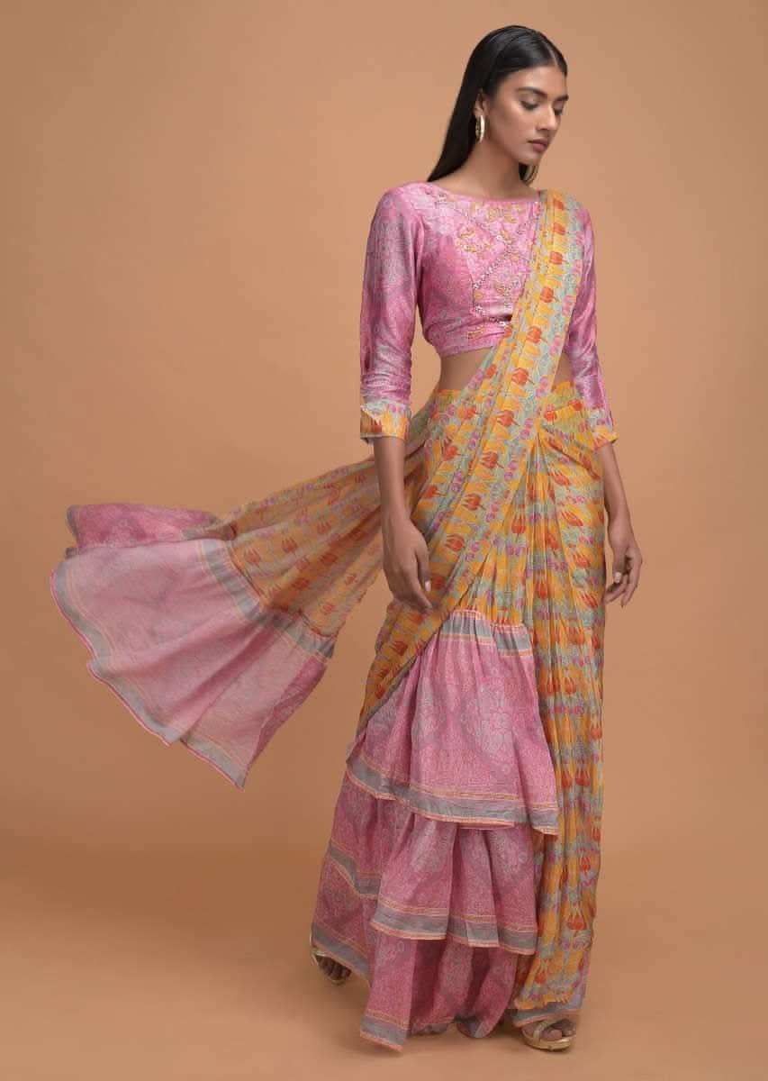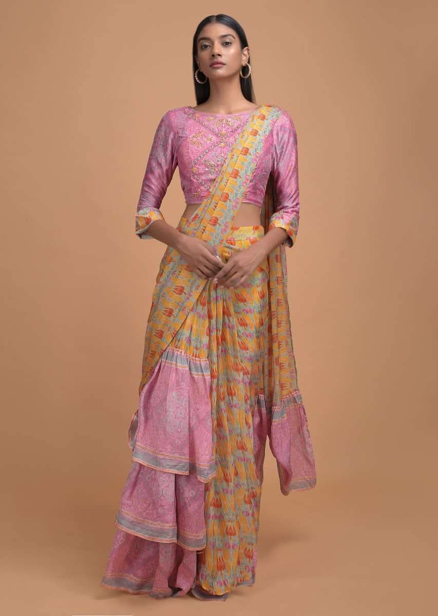 Yellow And Pink Ready Pleated Ruffle Saree In Crepe Enhanced With Floral And Paisley Print Online - Kalki Fashion