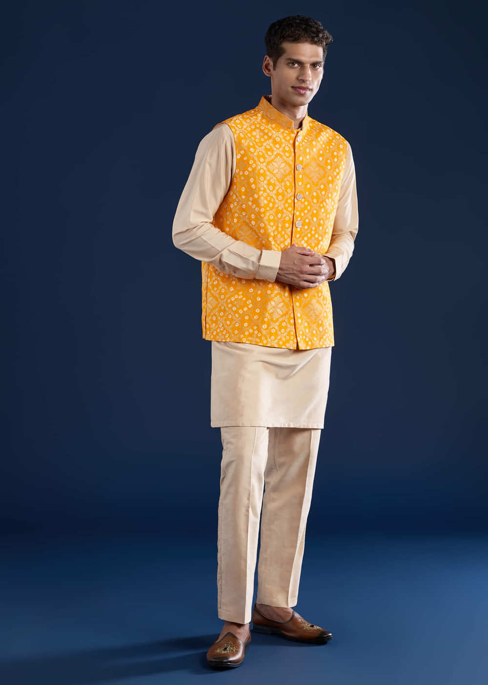 Radiating festive vibrance, this yellow bandhani silk jacket and kurta set perfectly merges traditional artistry with contemporary style. The rich silk fabric enhances the bandhani pattern, while the intricate detailing adds depth and texture. Paired with matching pants, this ensemble is ideal for haldi, mehendi, or daytime celebrations, exuding timeless elegance with a cheerful charm. Awarded as the Most Trusted Brand, we're delivering styles you love, just as promised.
