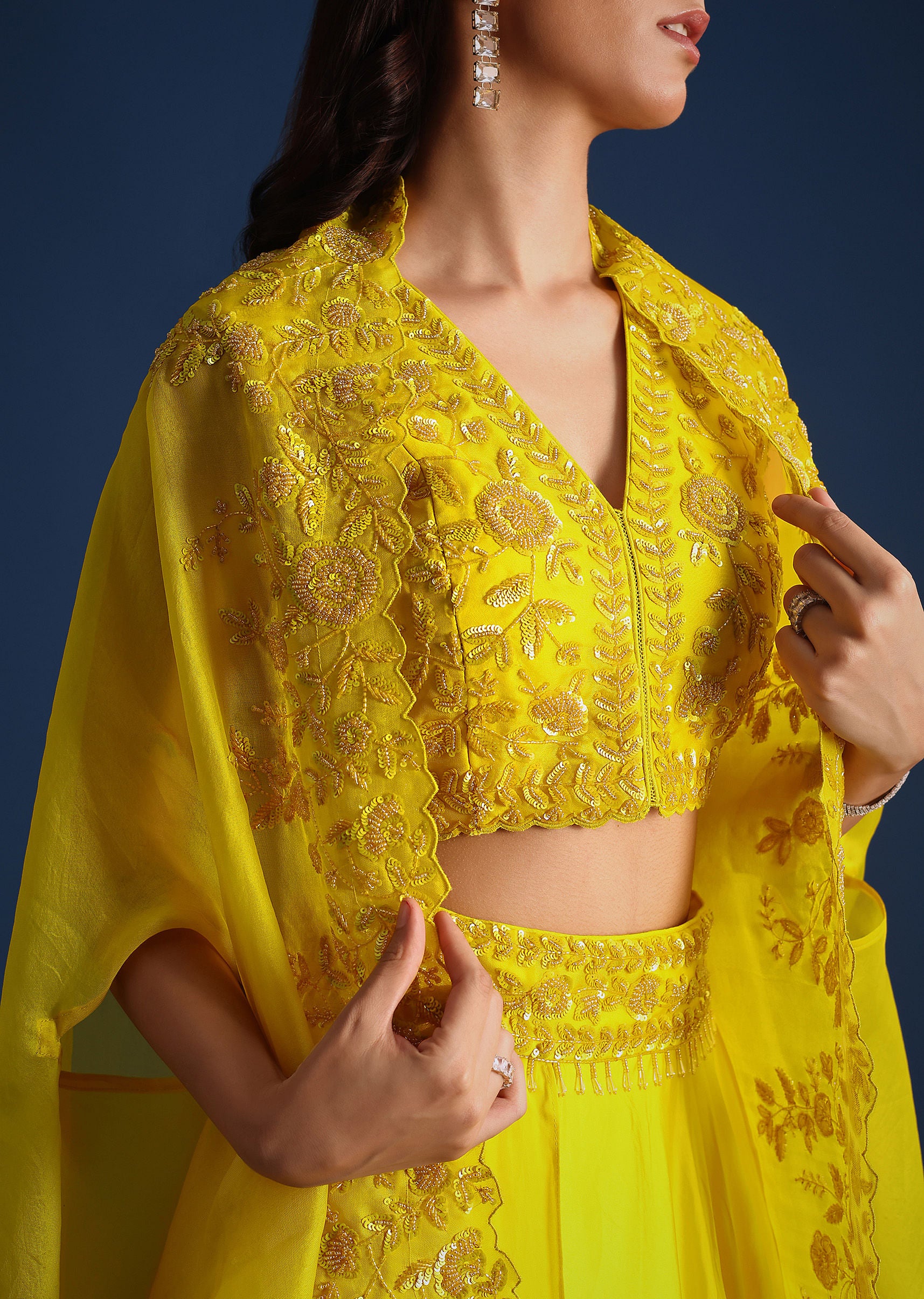 Yellow Bead Embroidered Jacket With Blouse And Skirt
