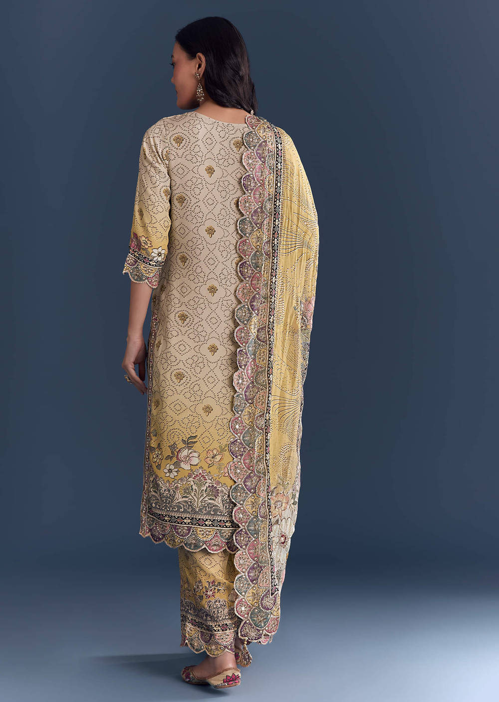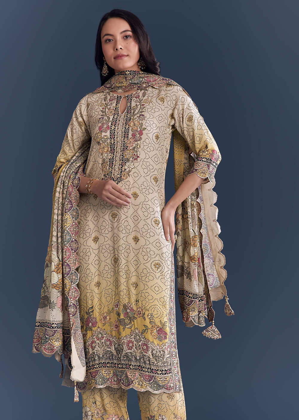 Yellow Beige Ombre Crepe Kurta Set With Floral Print