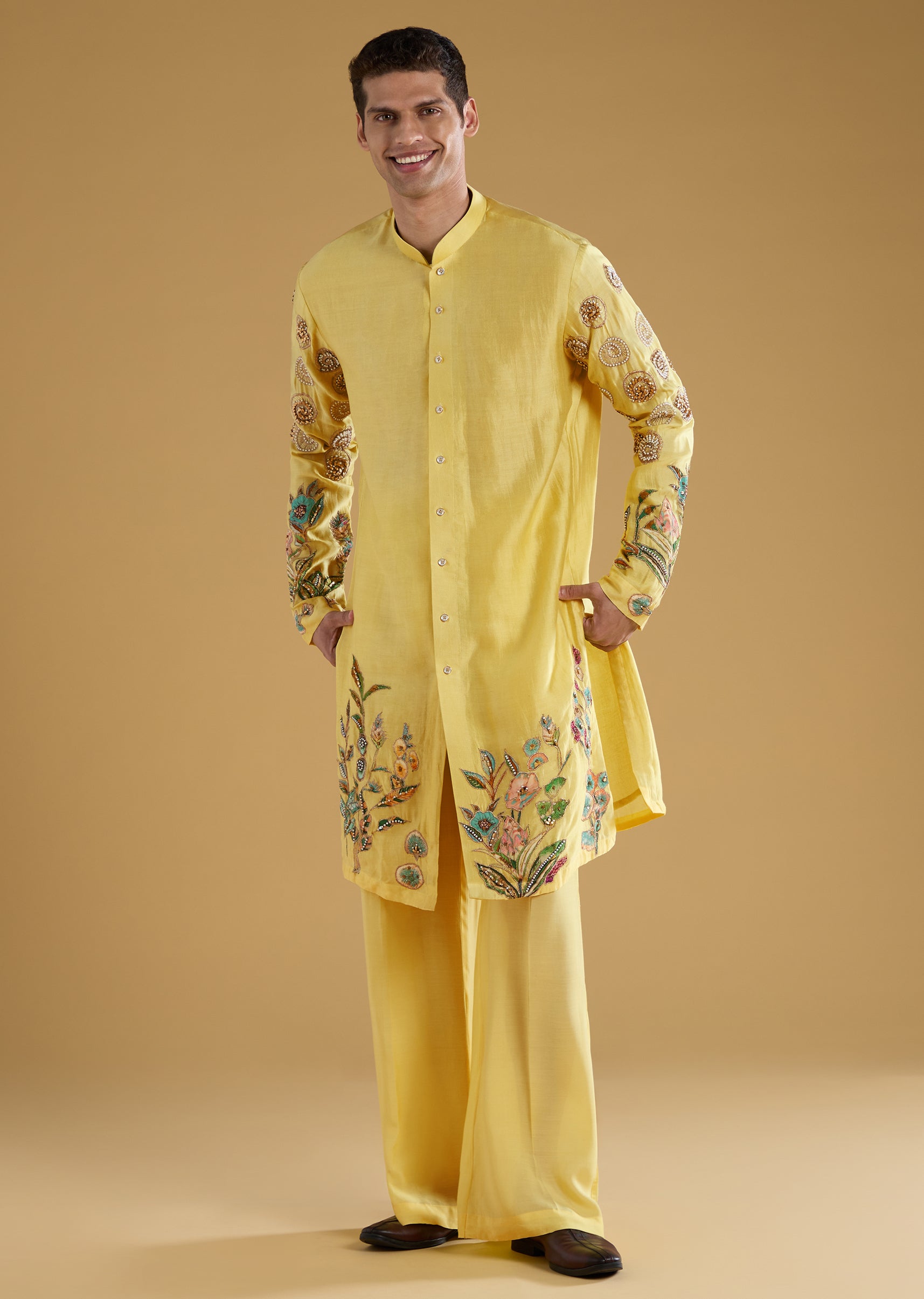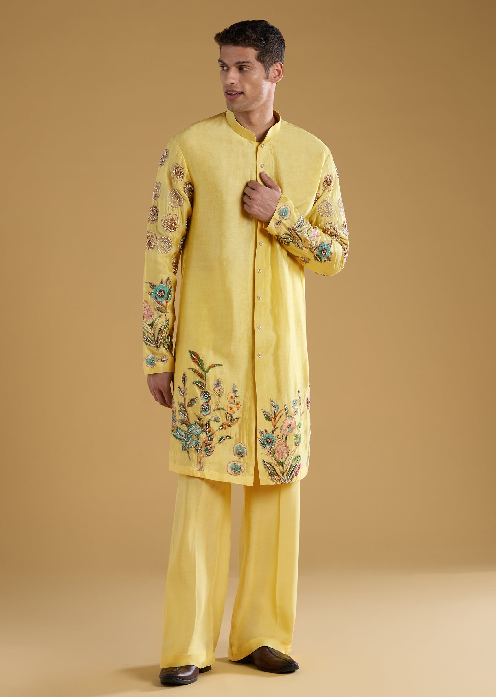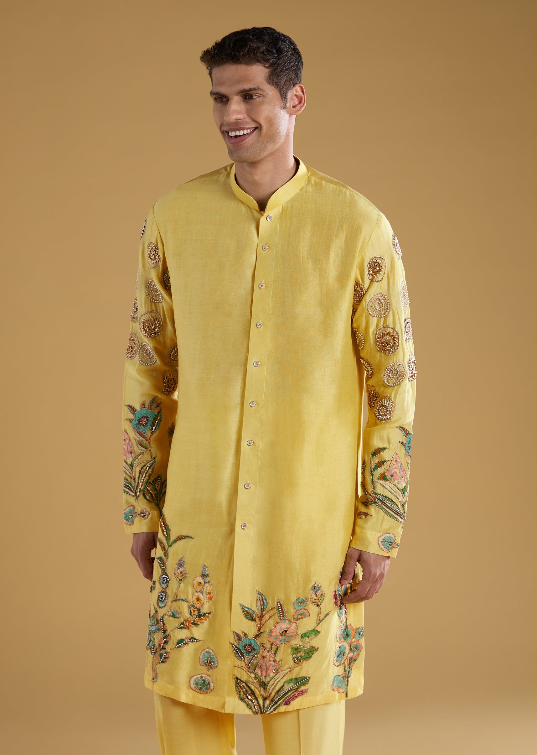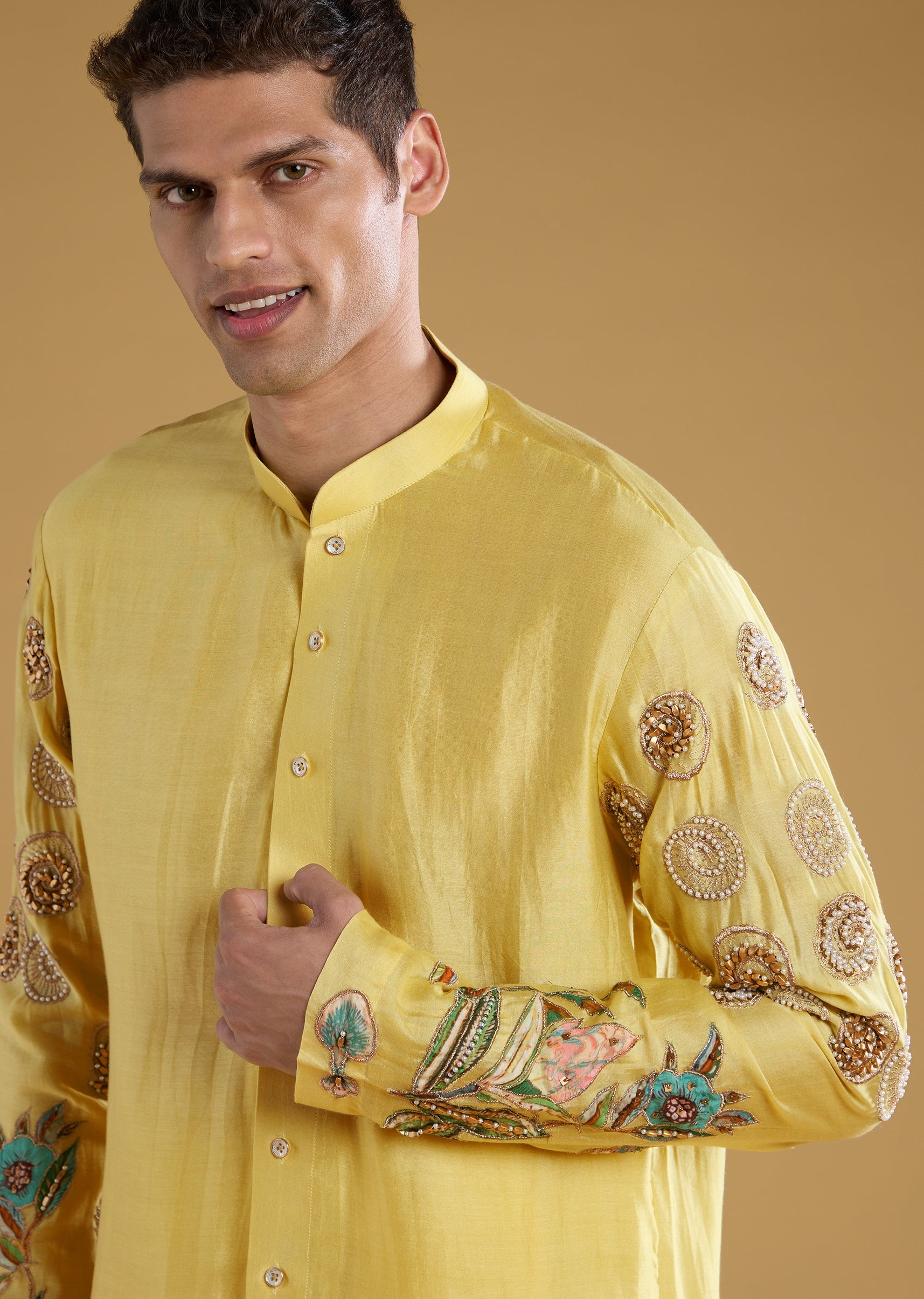 Yellow Chanderi Moti Work Mens Kurta Set