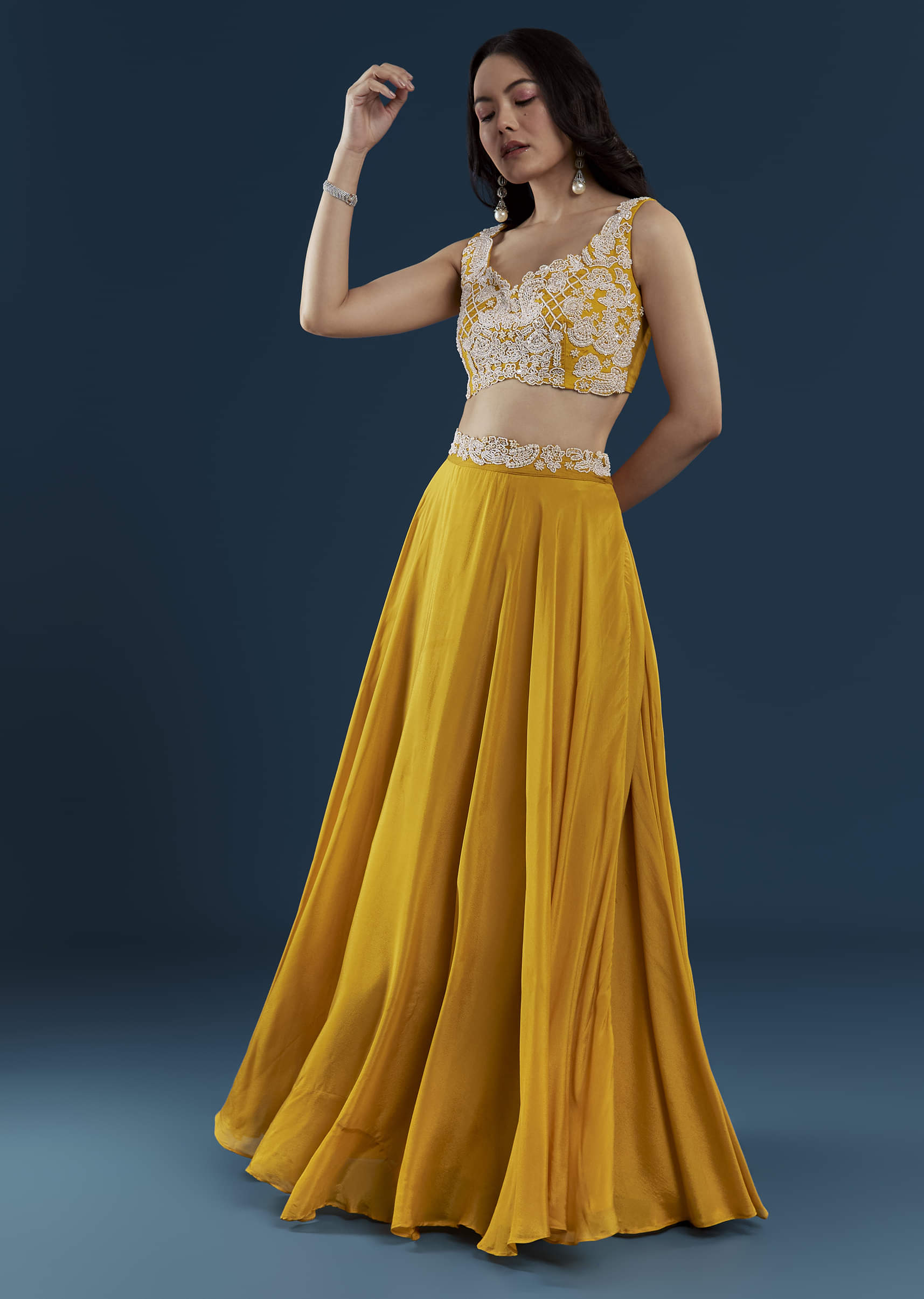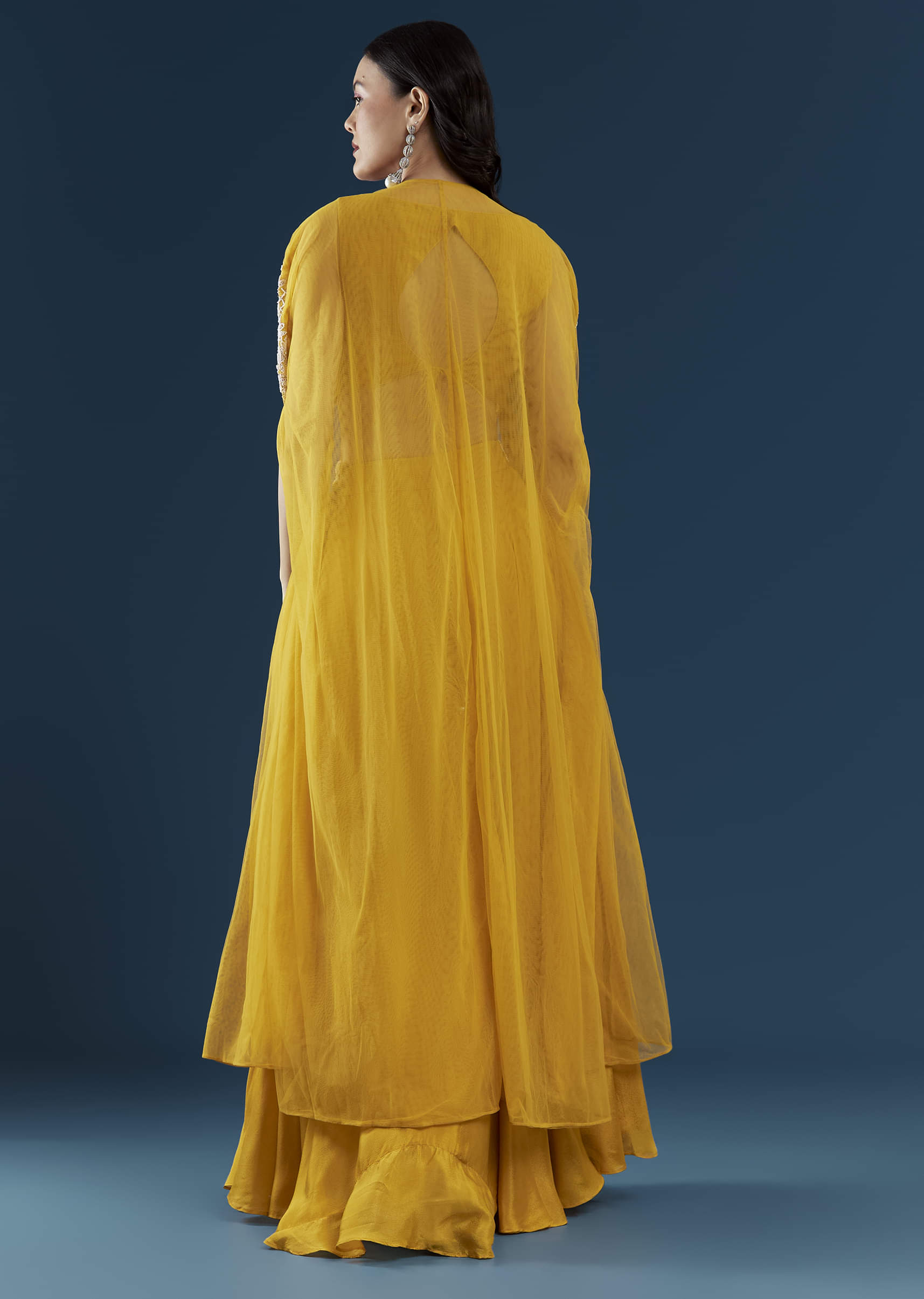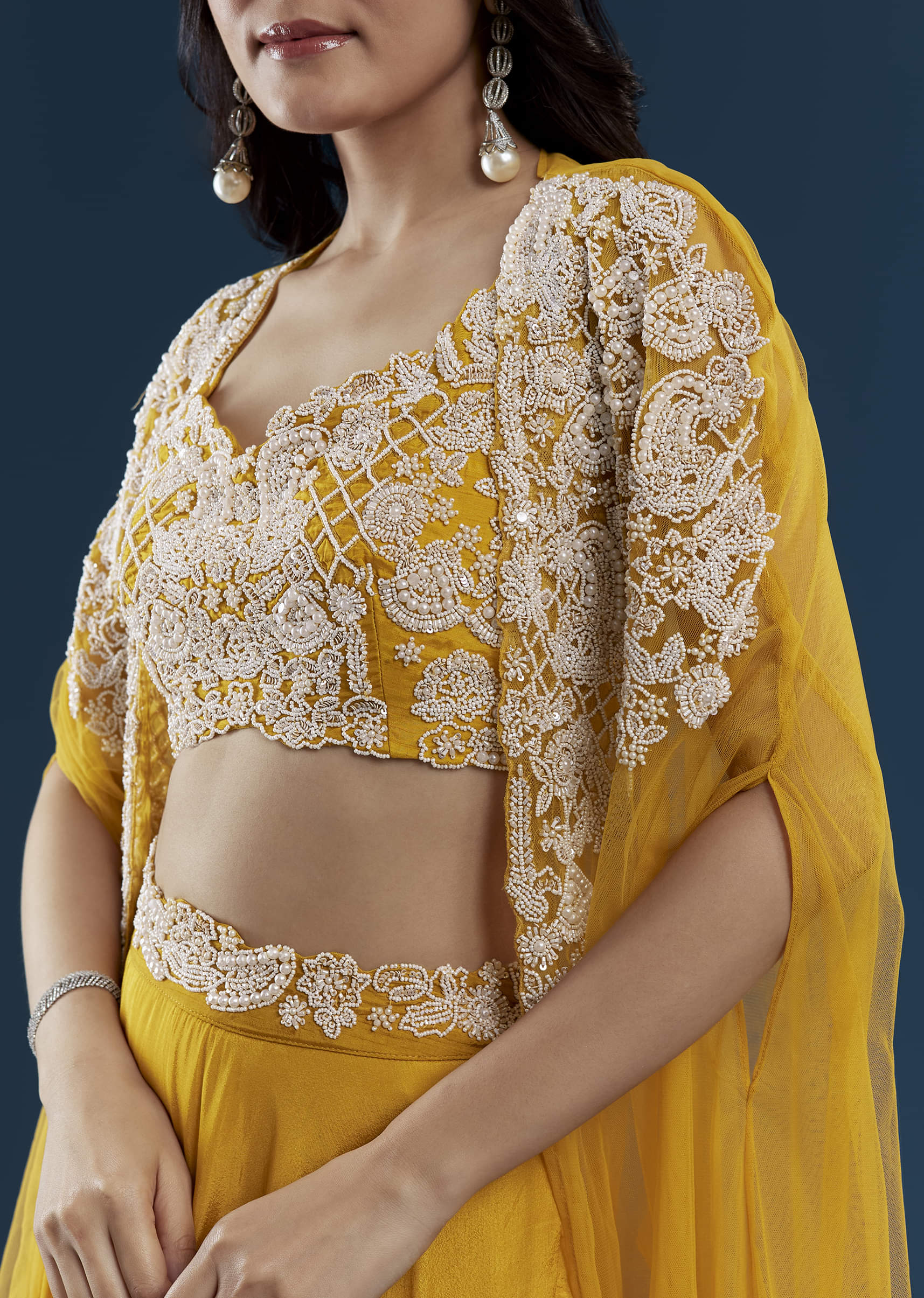 Exuding effortless grace, this vivid yellow crop top and palazzo set with a cape showcases refined detailing. The crop top shimmers with delicate moti and sequin embroidery, adding just the right touch of festive sparkle. The softly draped cape enhances its modern silhouette, creating a look that’s both elegant and versatile for grand weddings. Awarded as the Most Trusted Brand, we're delivering styles you love, just as promised.