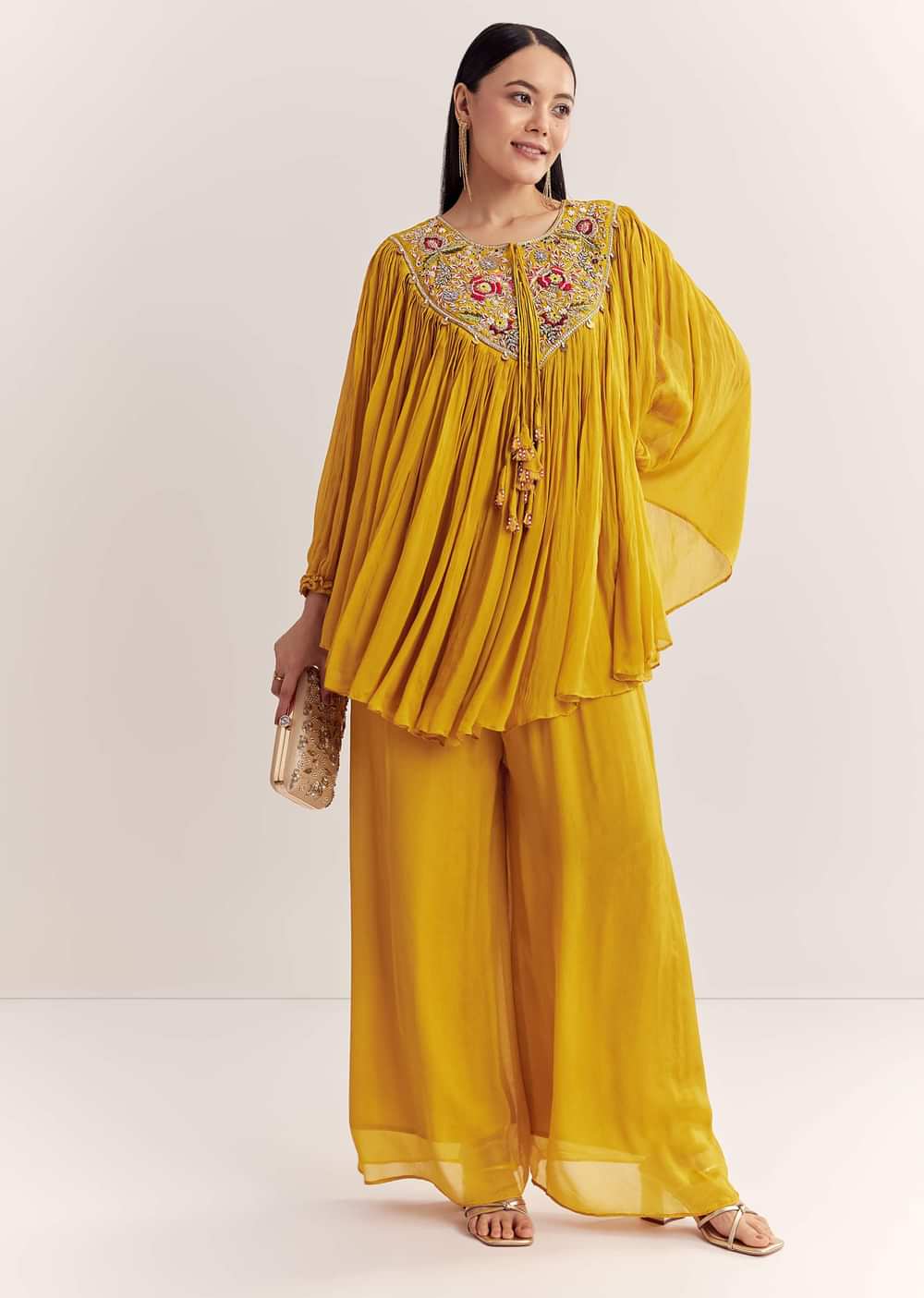 Radiating sunshine charm, this yellow chinon kaftan set gleams with thread and zardosi detailing—perfect for day festivities with flair. Neckline tassels count may vary. Awarded as the Most... More Product Details